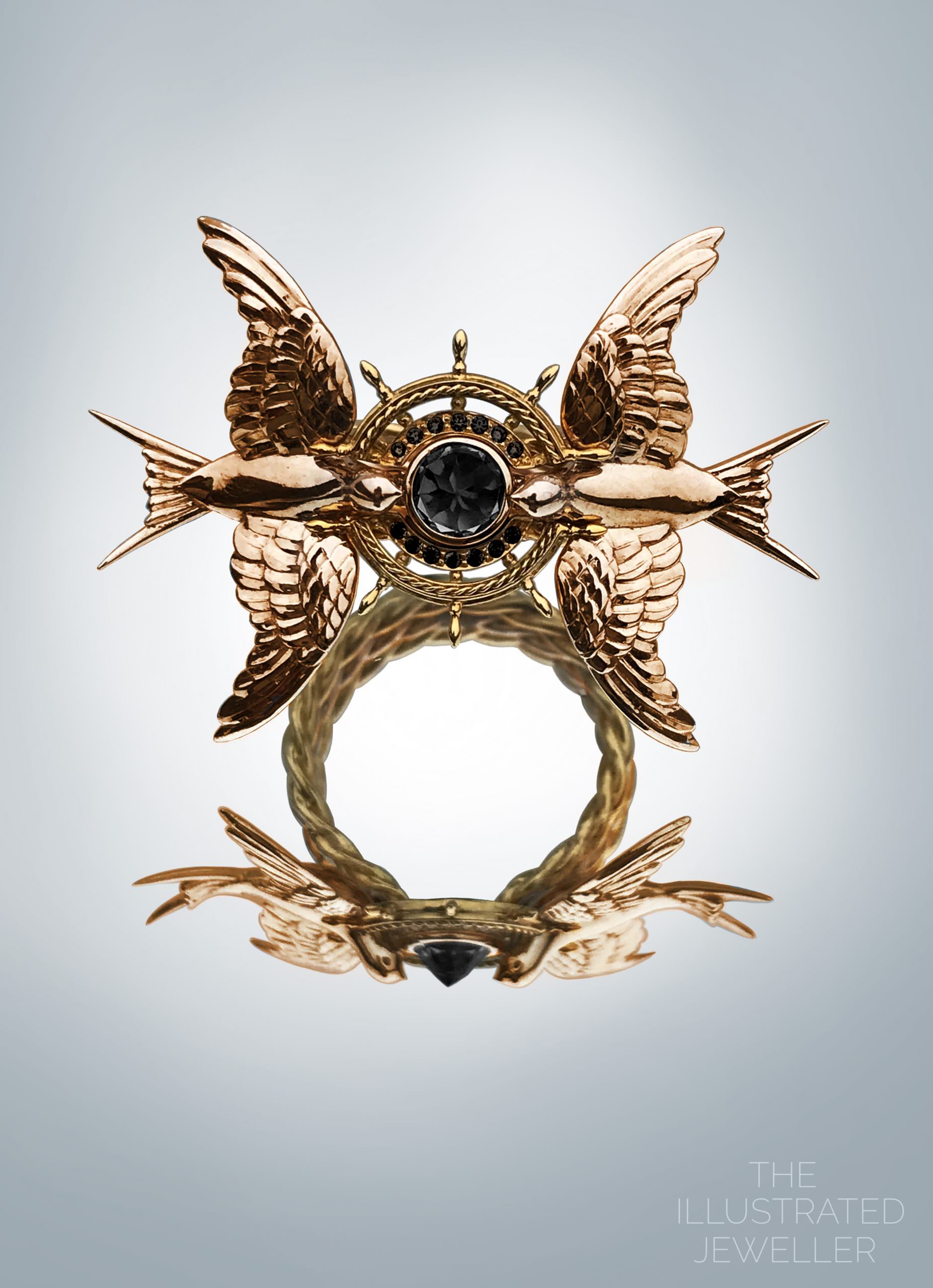 A beautiful trio stack that fits perfectly together. These rings symbolise the dangers and perils sailors used to meet on the ocean. Made in rose gold, this stack is interchangeable, so you can change it up to suit your taste. The two ship wheel stacks have intricate attention to detail, with twisted ship rope embellishments matching the shank. The two half ship wreck wheels come together, unifying a halo of black diamonds surrounding an inverted black gemstone pointing towards the heavens.