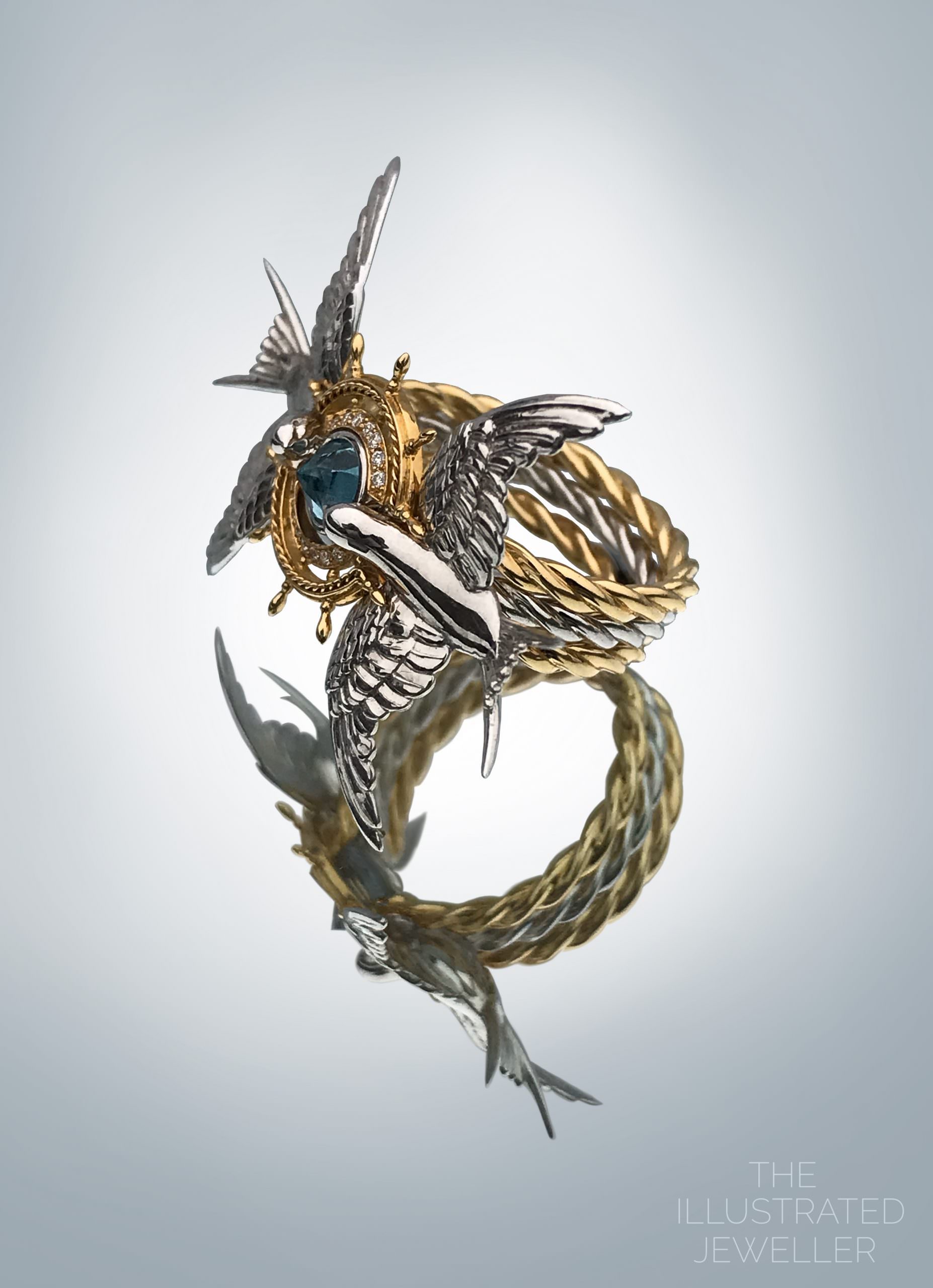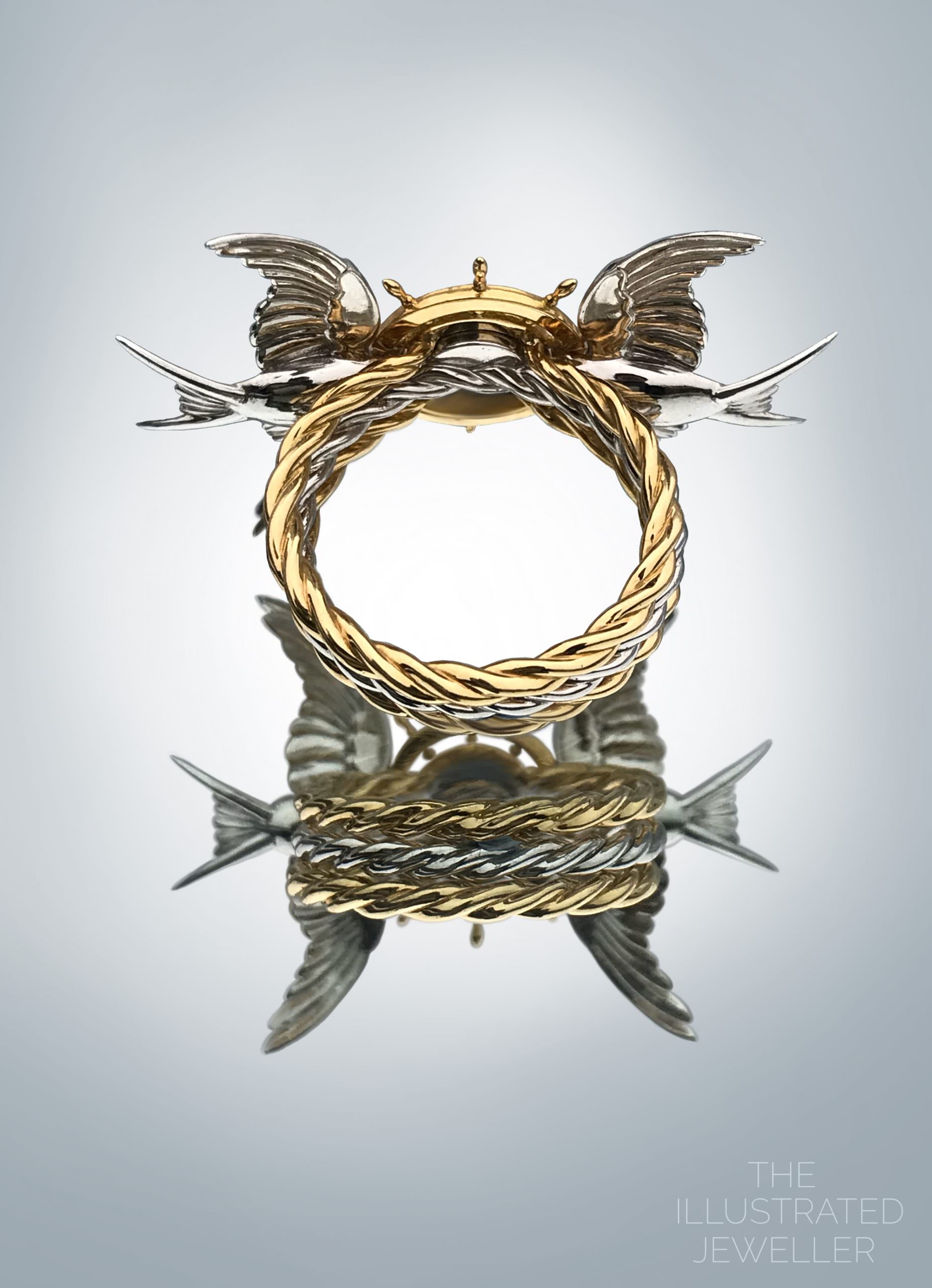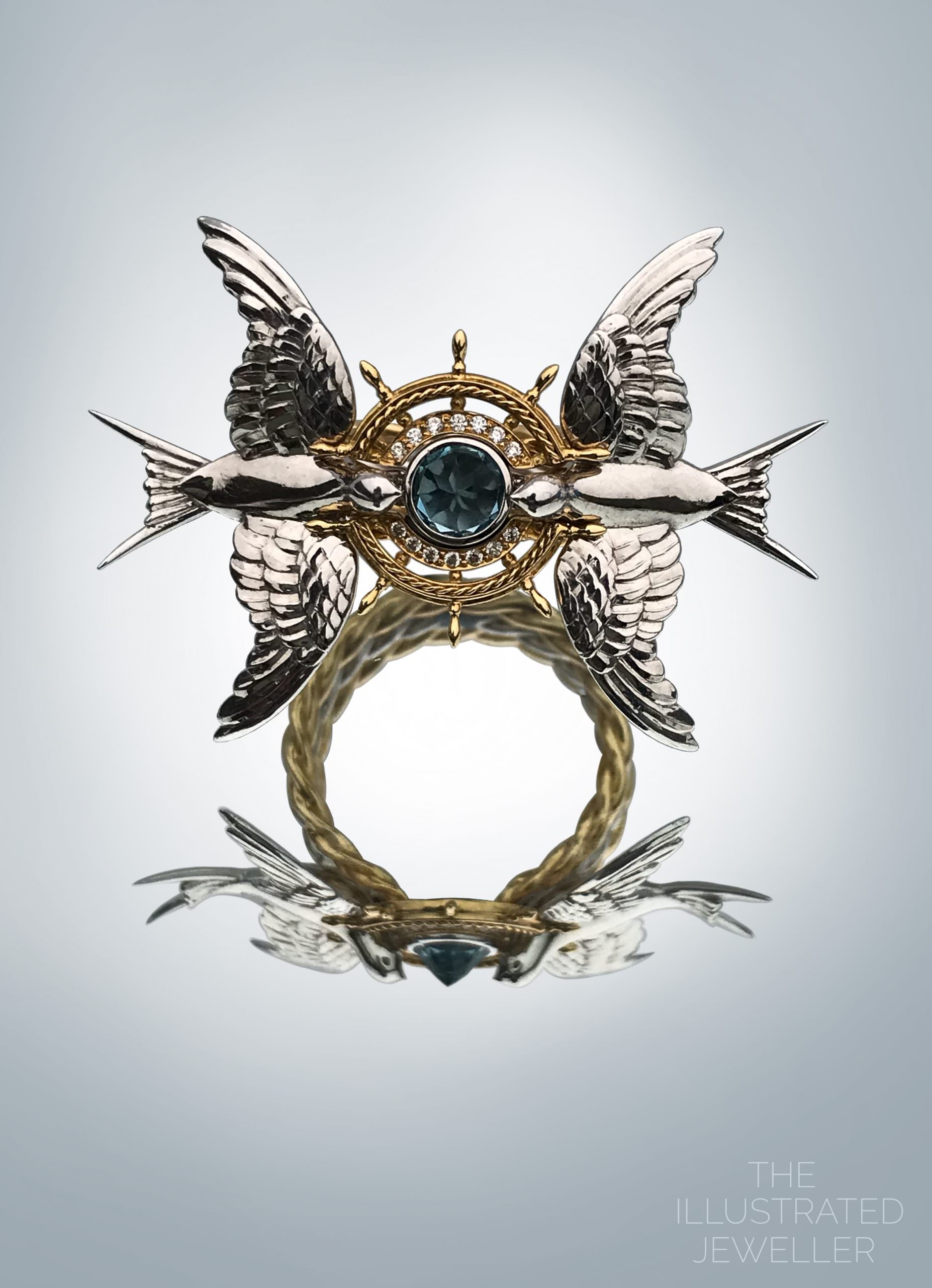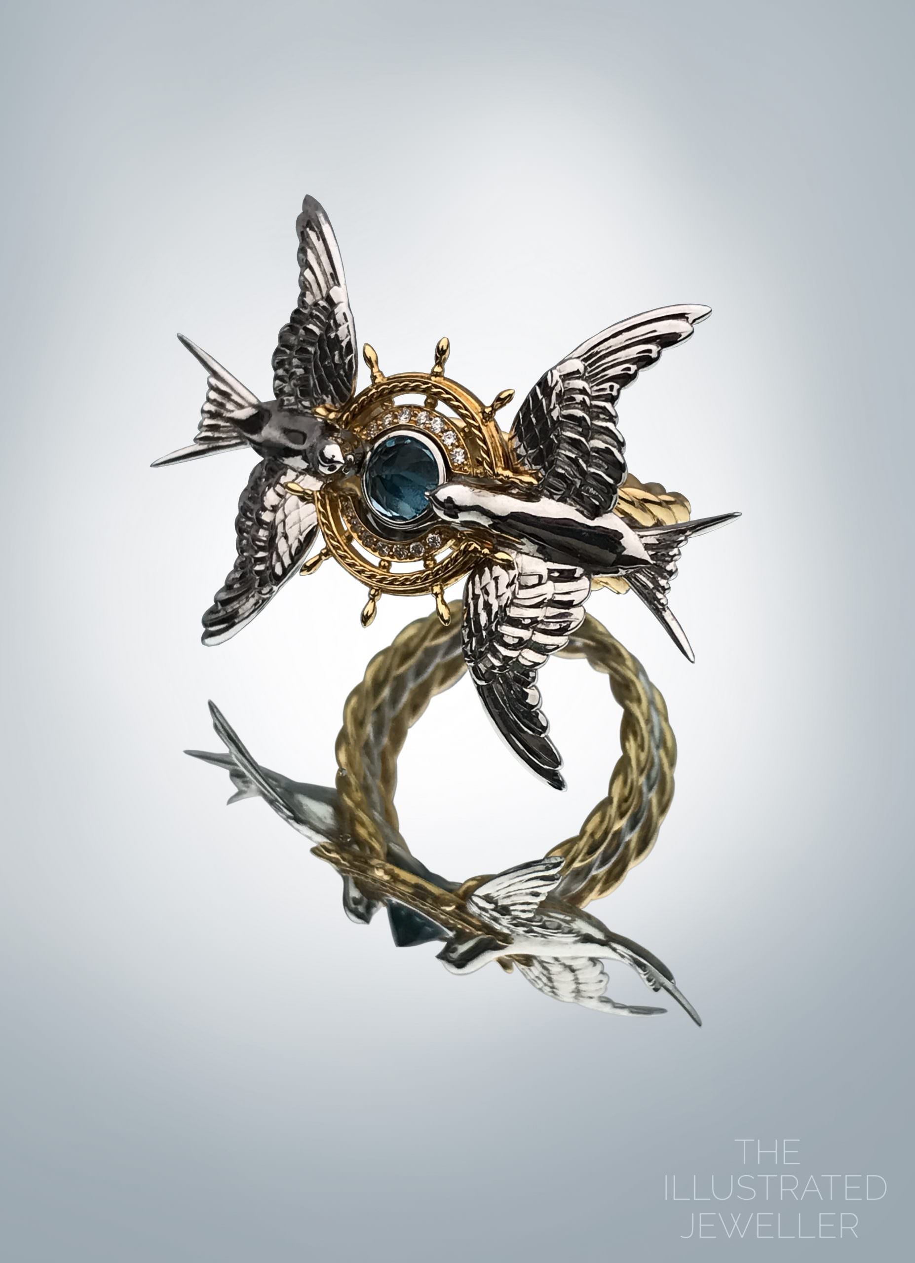 A beautiful trio stack that fits perfectly together. These rings symbolise the dangers and perils sailors used to meet on the ocean. Made in white gold, (rhodium plated) this stack is interchangeable, so you can change it up to suit your taste. The two ship wheel stacks have intricate attention to detail, with twisted ship rope embellishments matching the shank. The two half ship wreck wheels come together unifying a halo of white diamonds surrounding an inverted Topaz pointing towards the heavens.