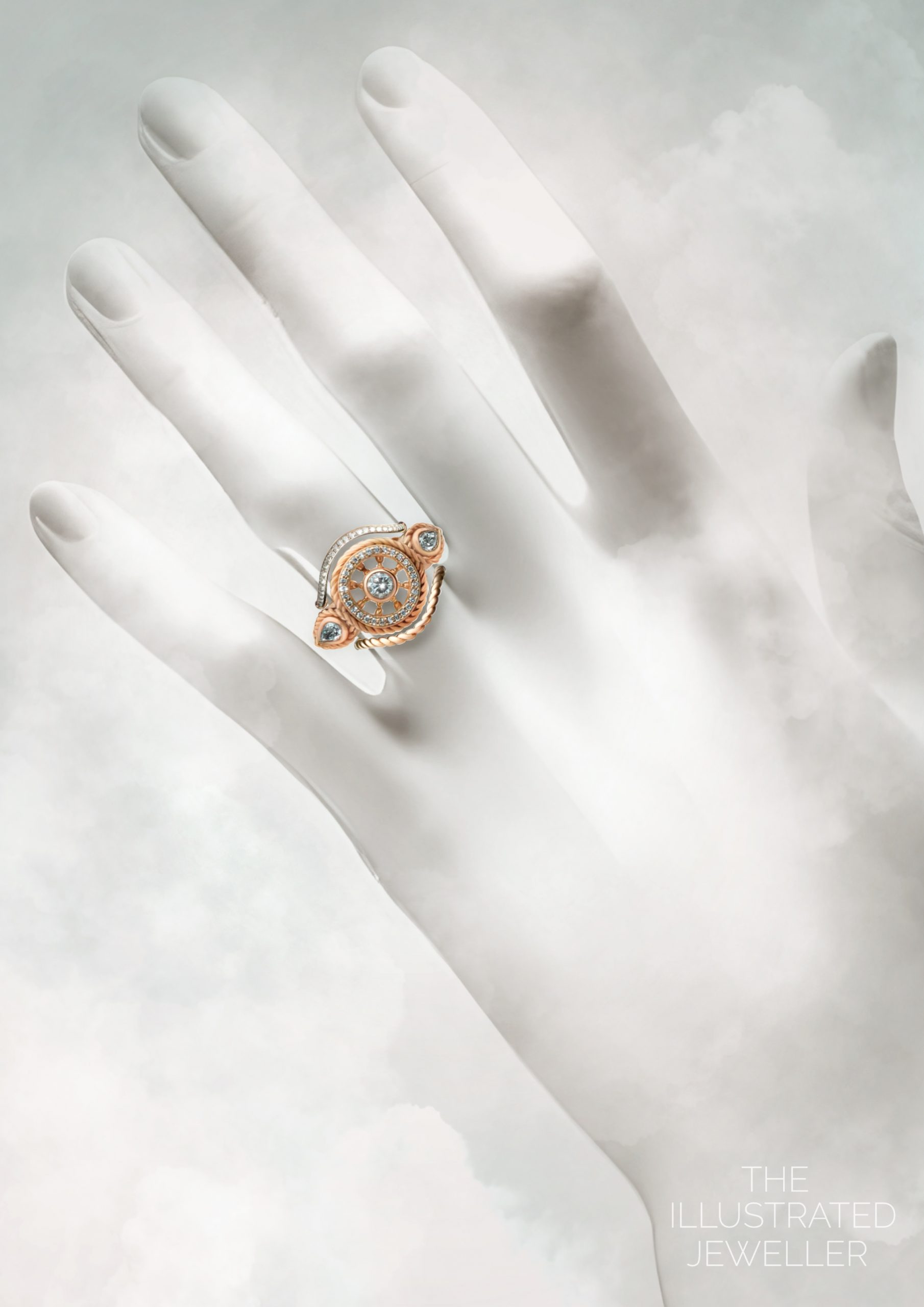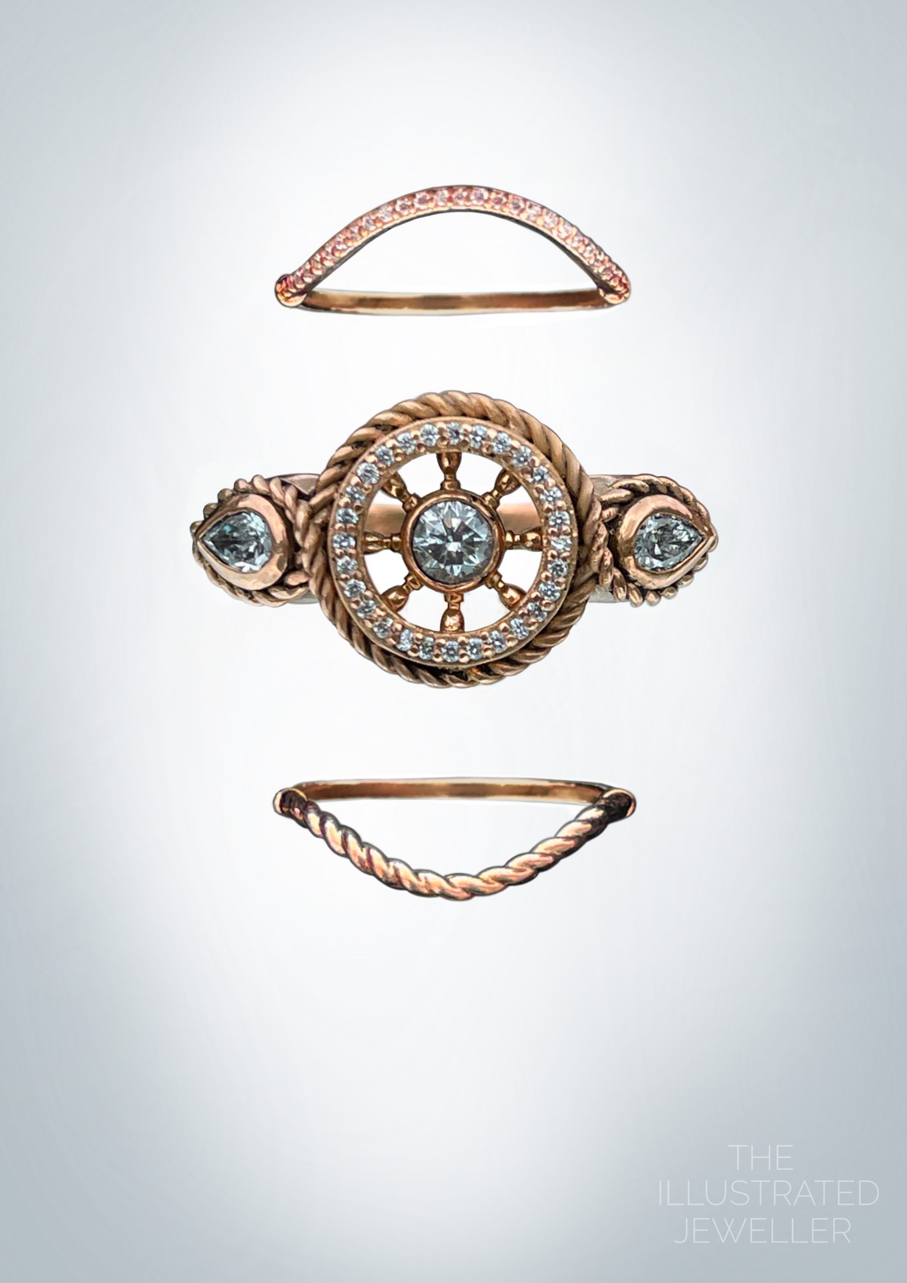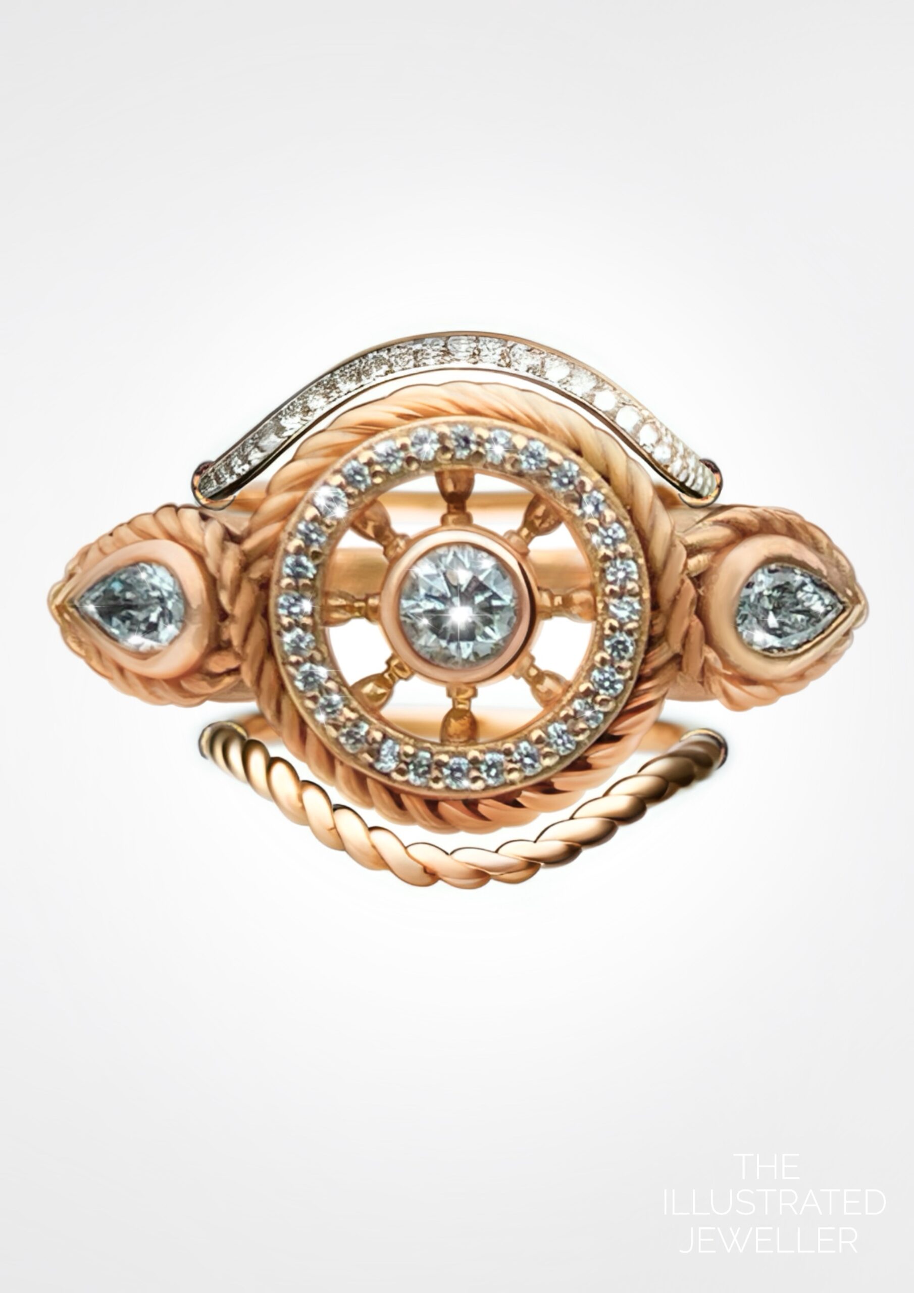 The main design feature is inspired by a hurricane at a birds eye viewpoint. The centre continues the sailor theme with the twisted ship rope embellishments and sunken steering wheel. It has a main round brilliant diamond and encompasses pear diamonds with a halo of white pave set diamonds to catch the light and give you all the sparkle!