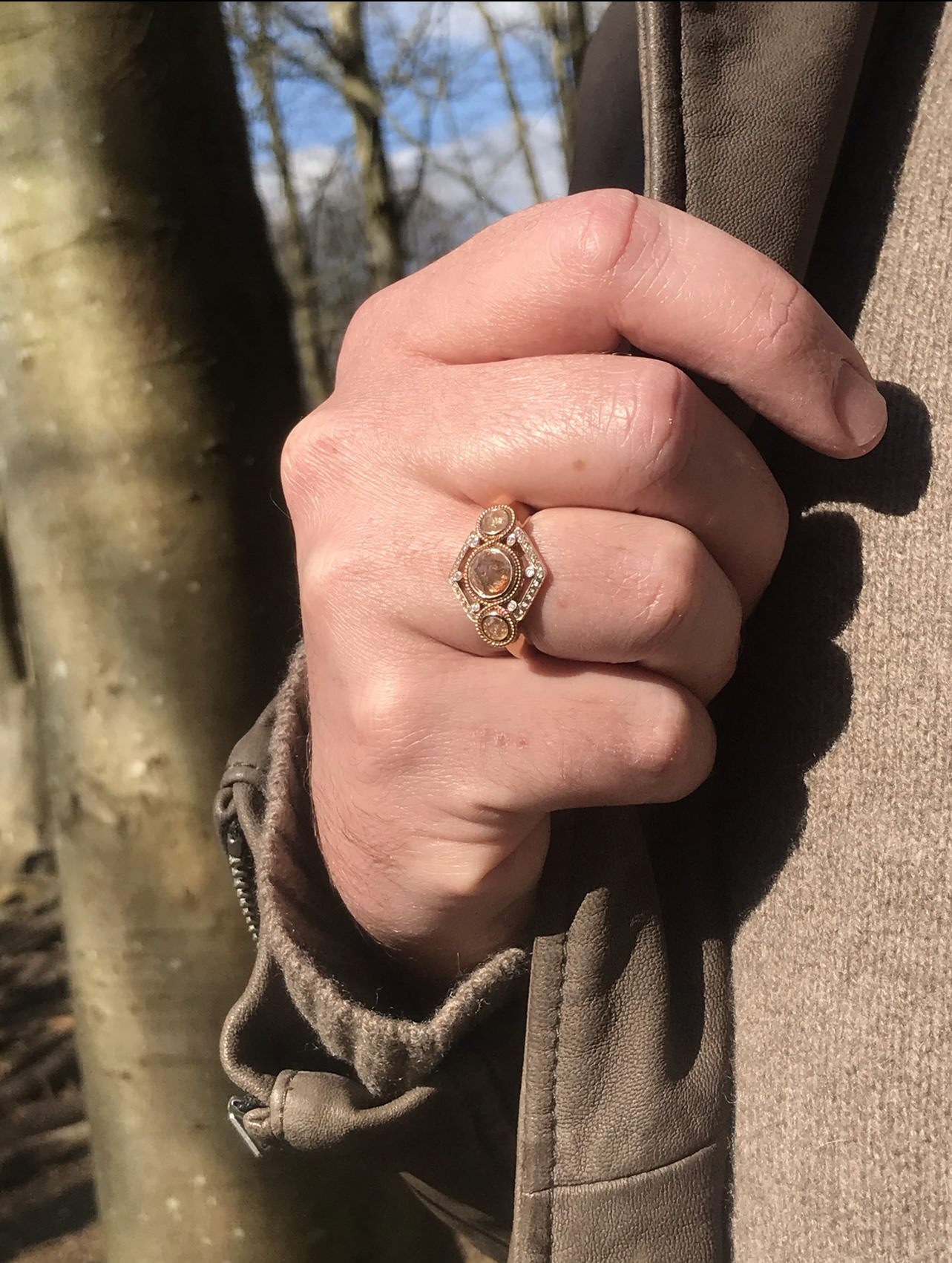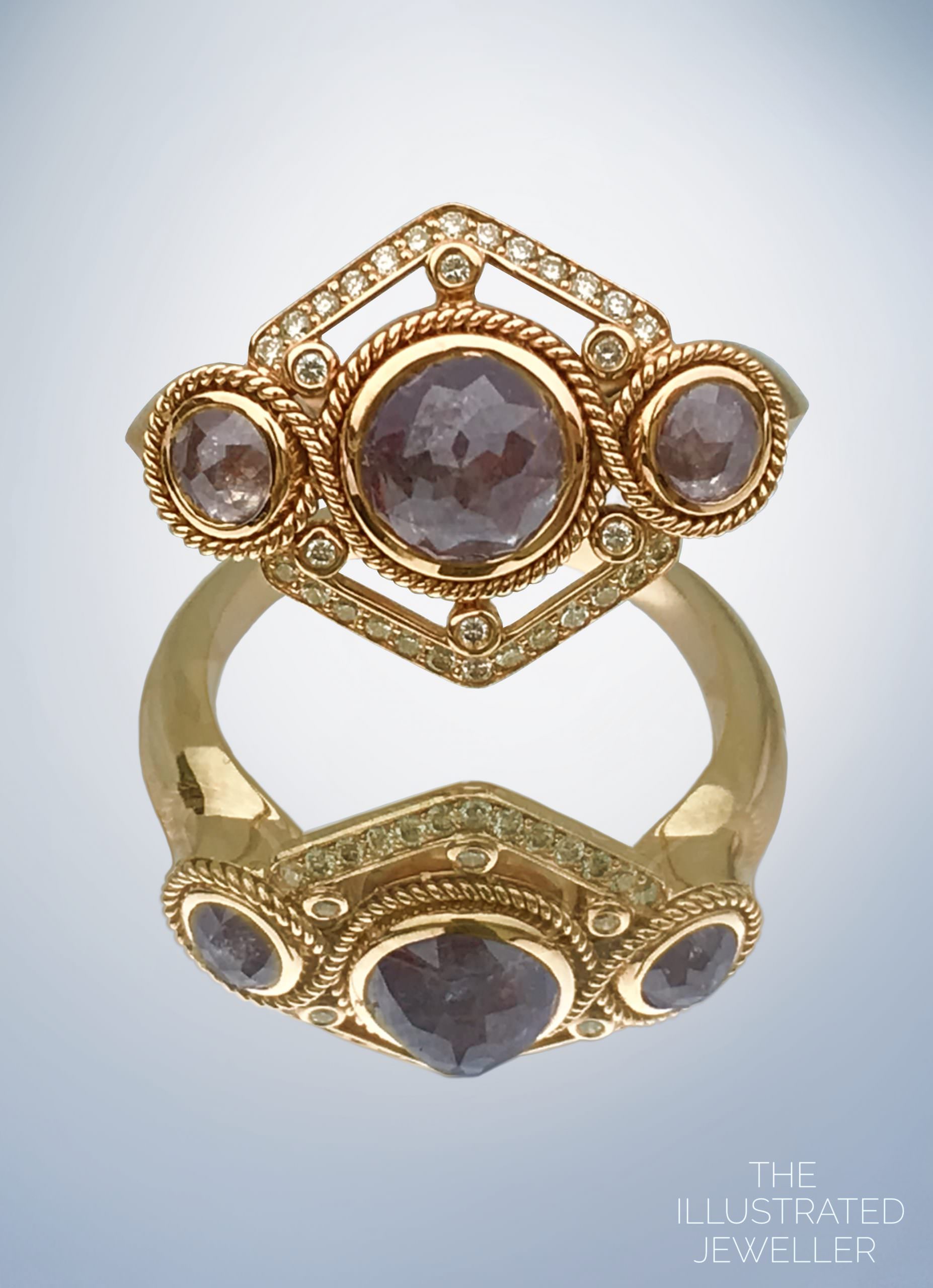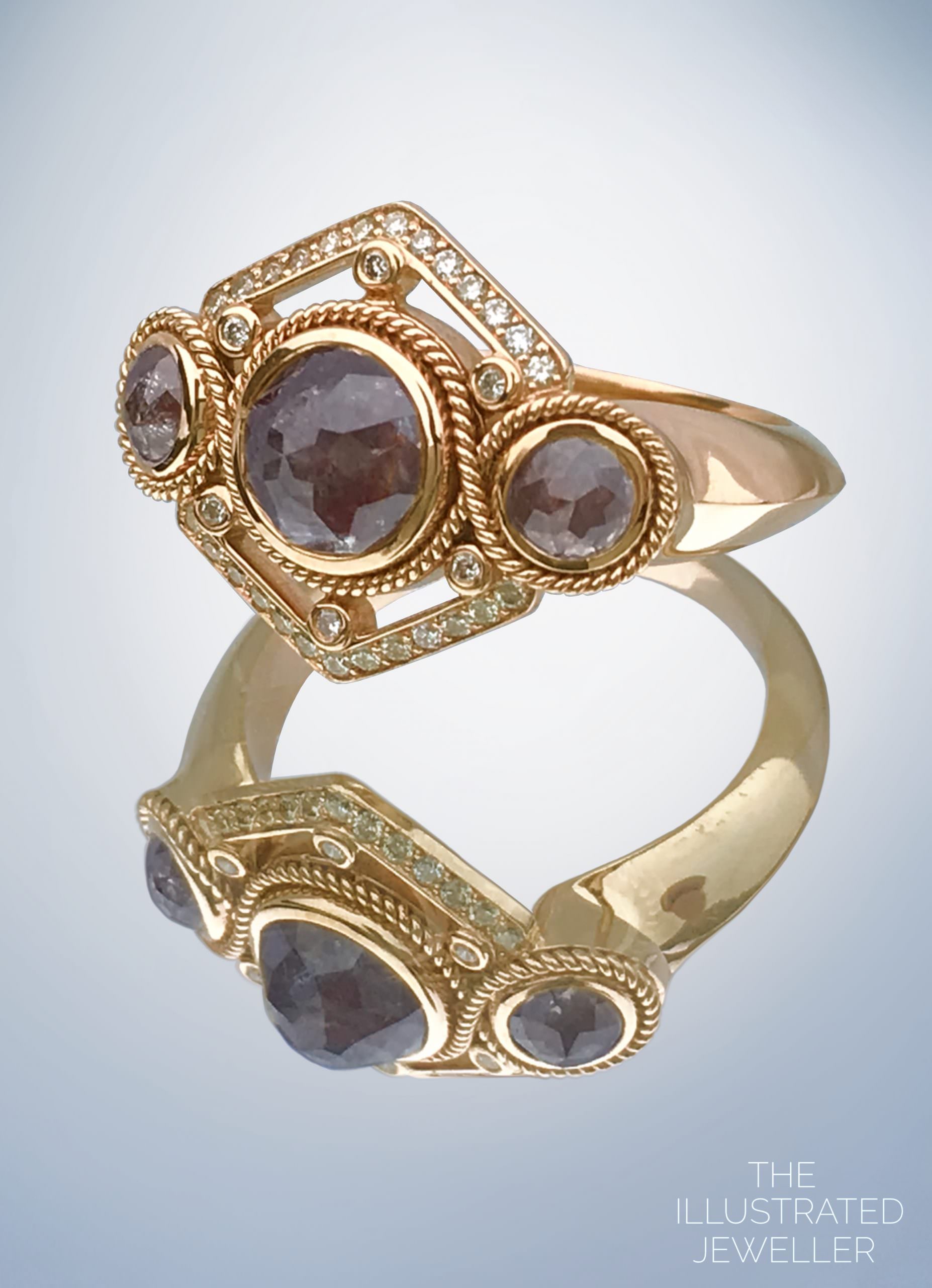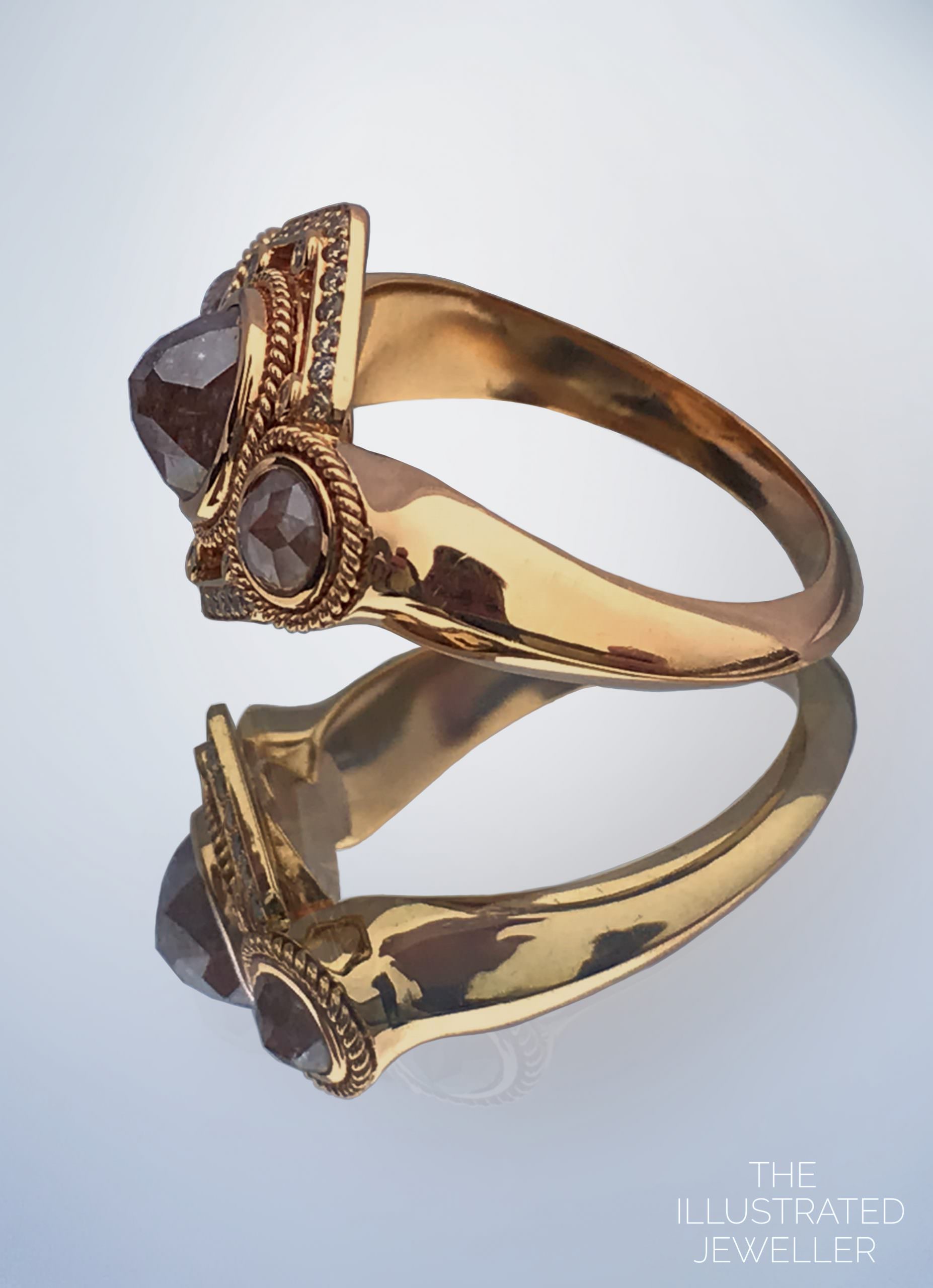 It has three rose cut diamonds, the centre being the largest focal point. It encompasses two small shoulder diamonds in bezel settings, with a high mirror finish
