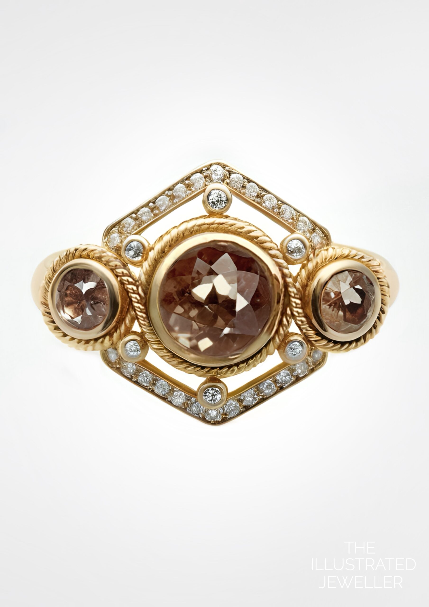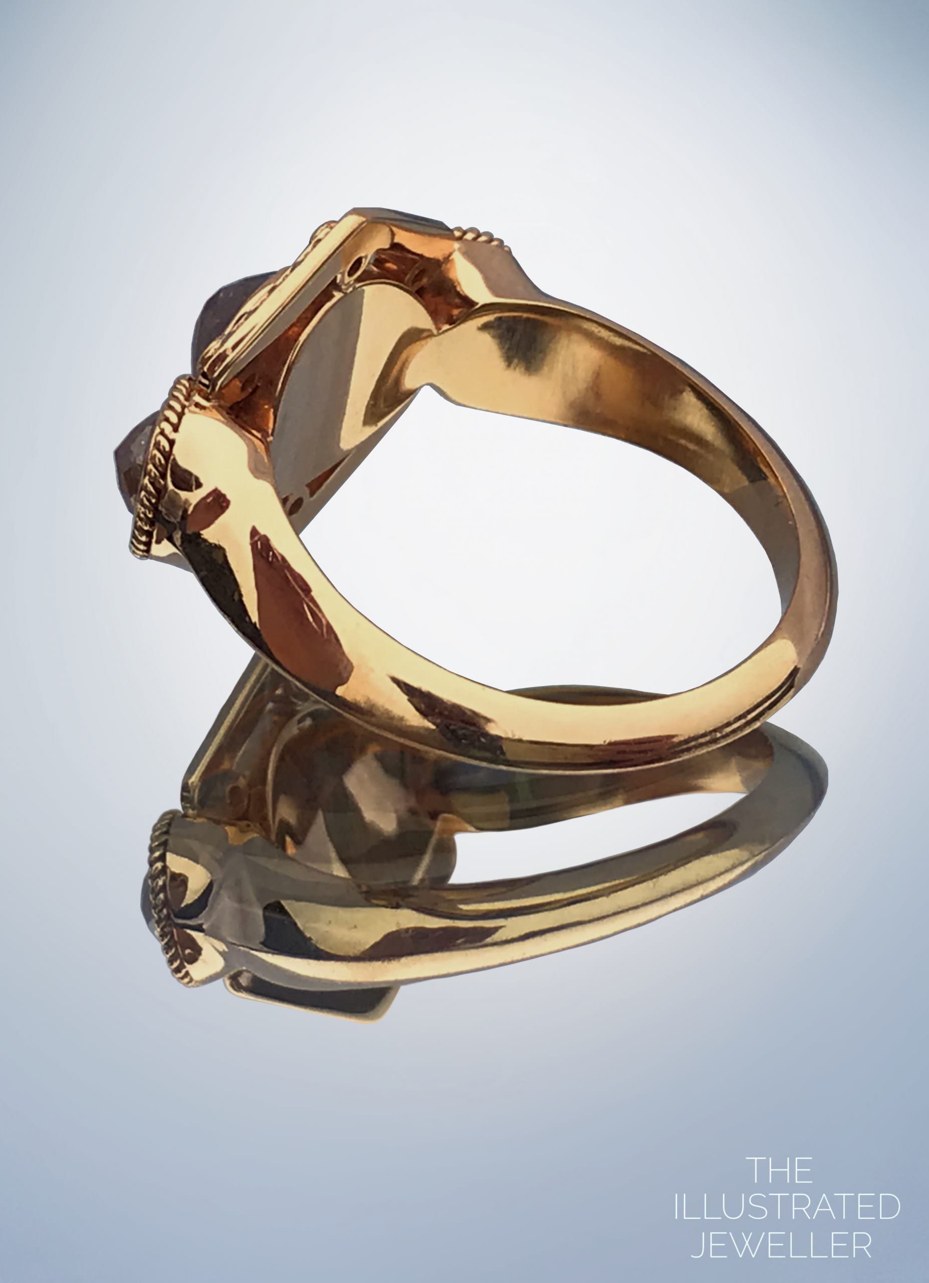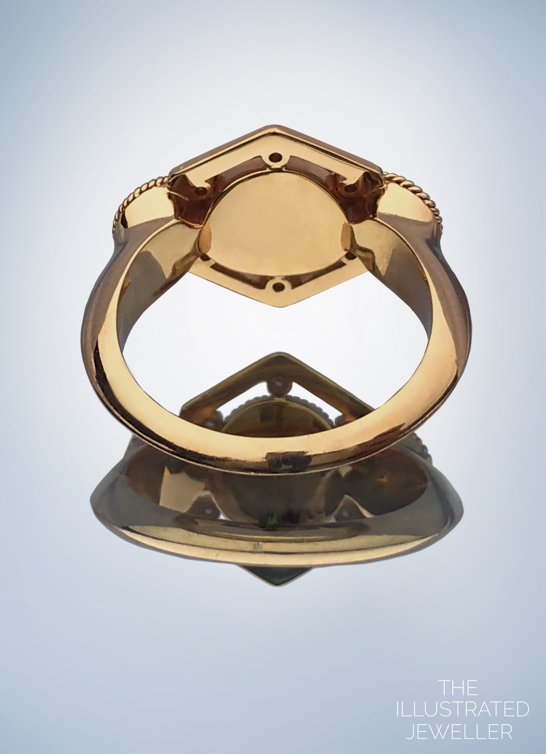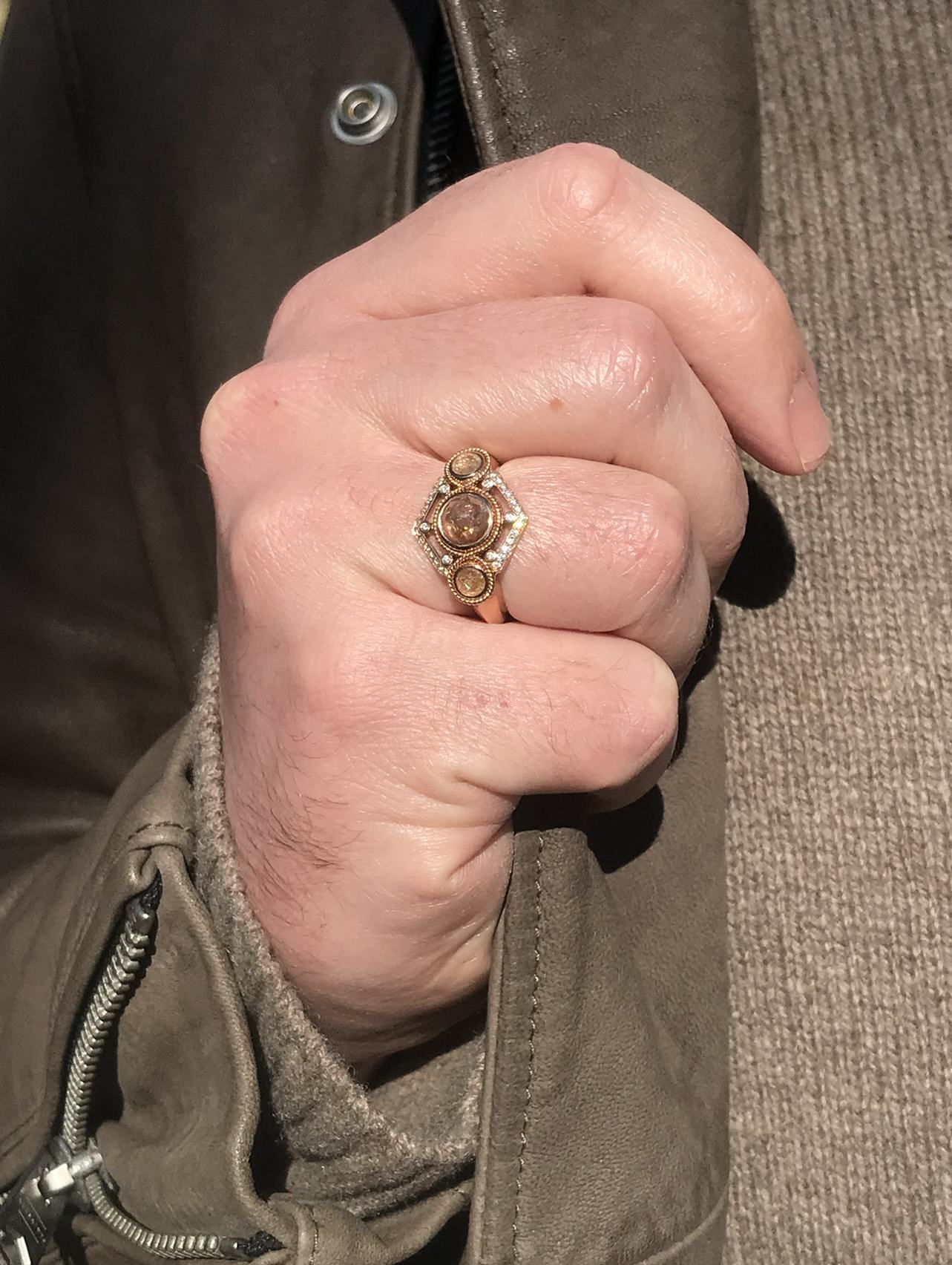 It has three rose cut diamonds, the centre being the largest focal point. It encompasses two small shoulder diamonds in bezel settings, with a high mirror finish