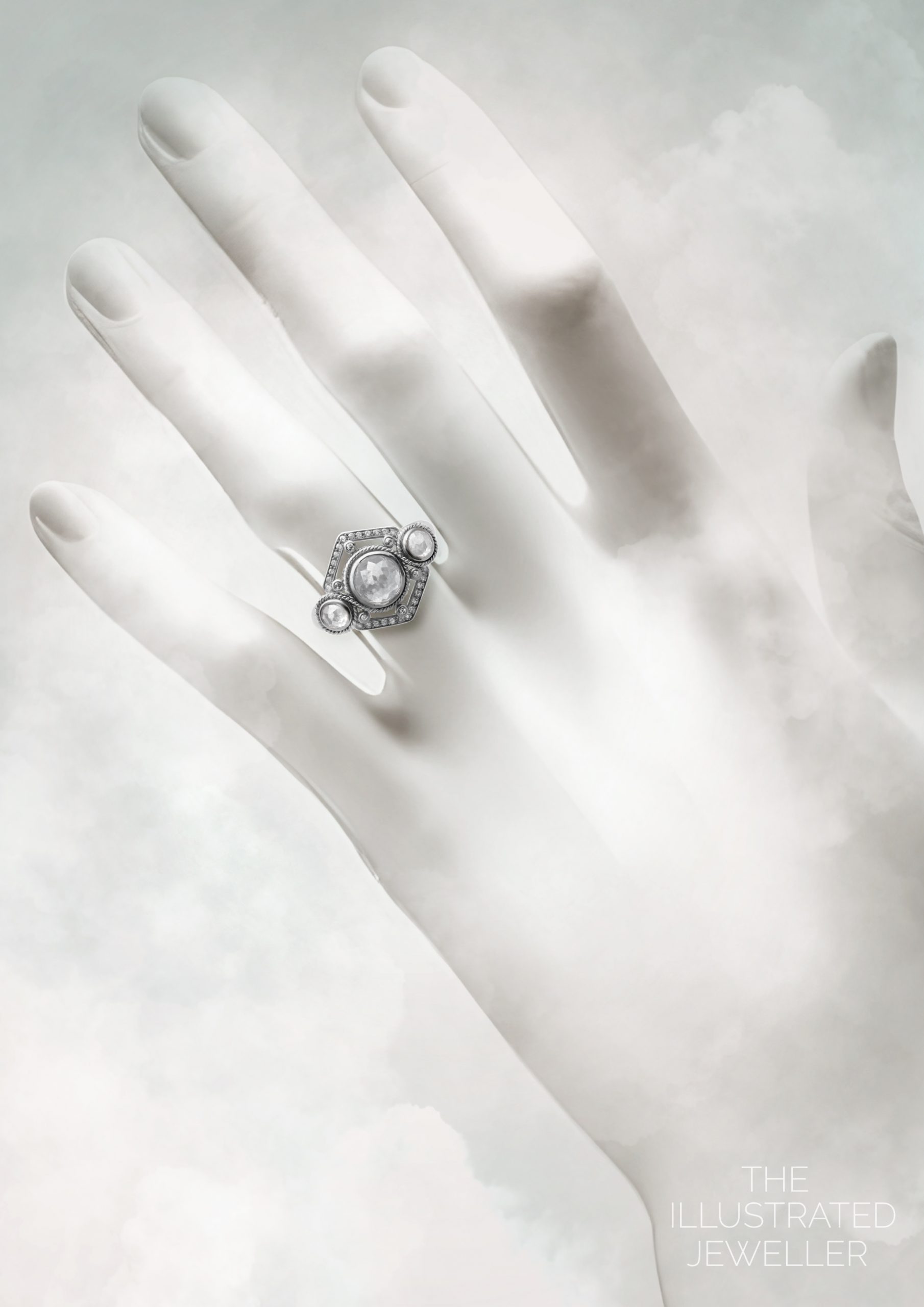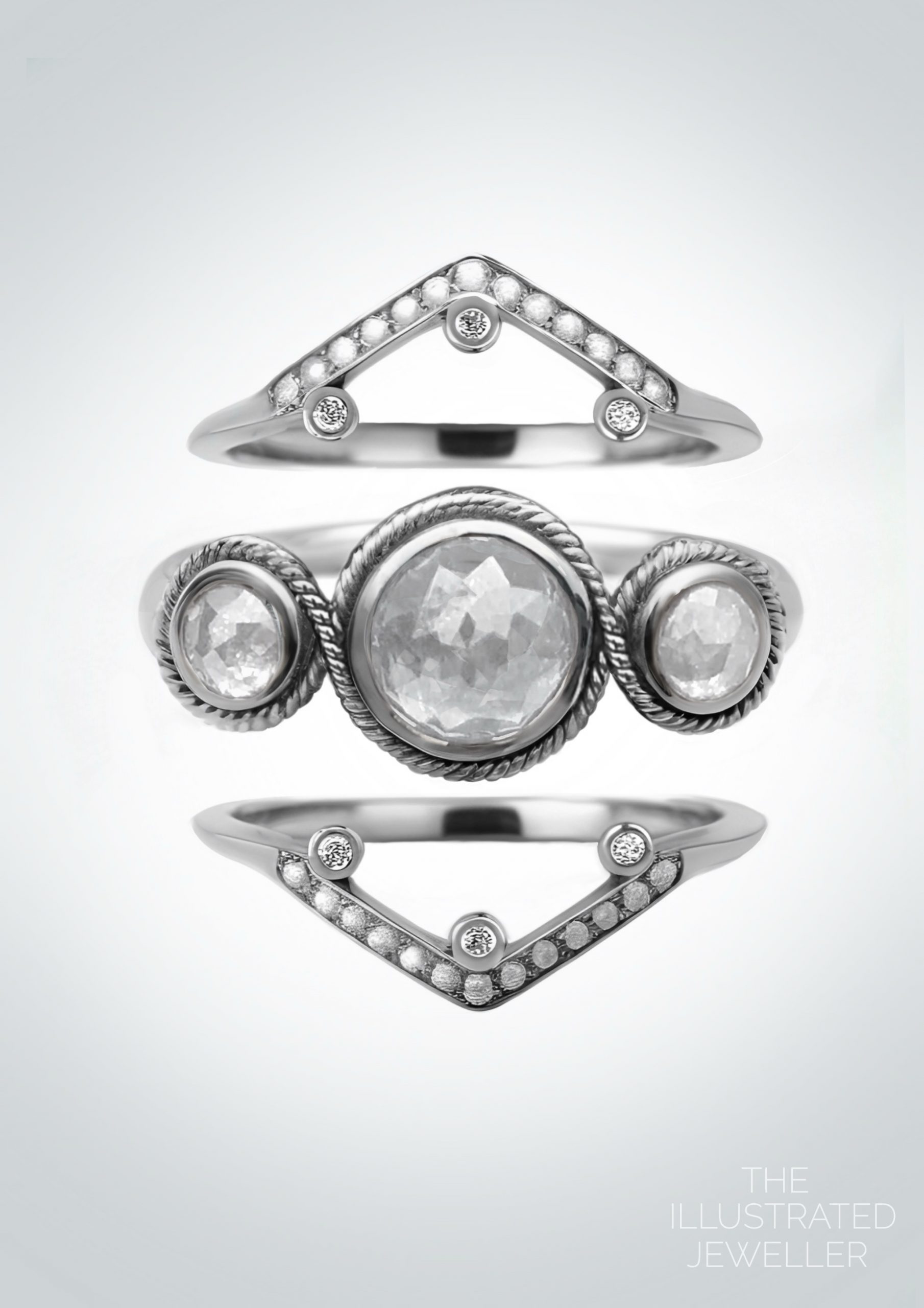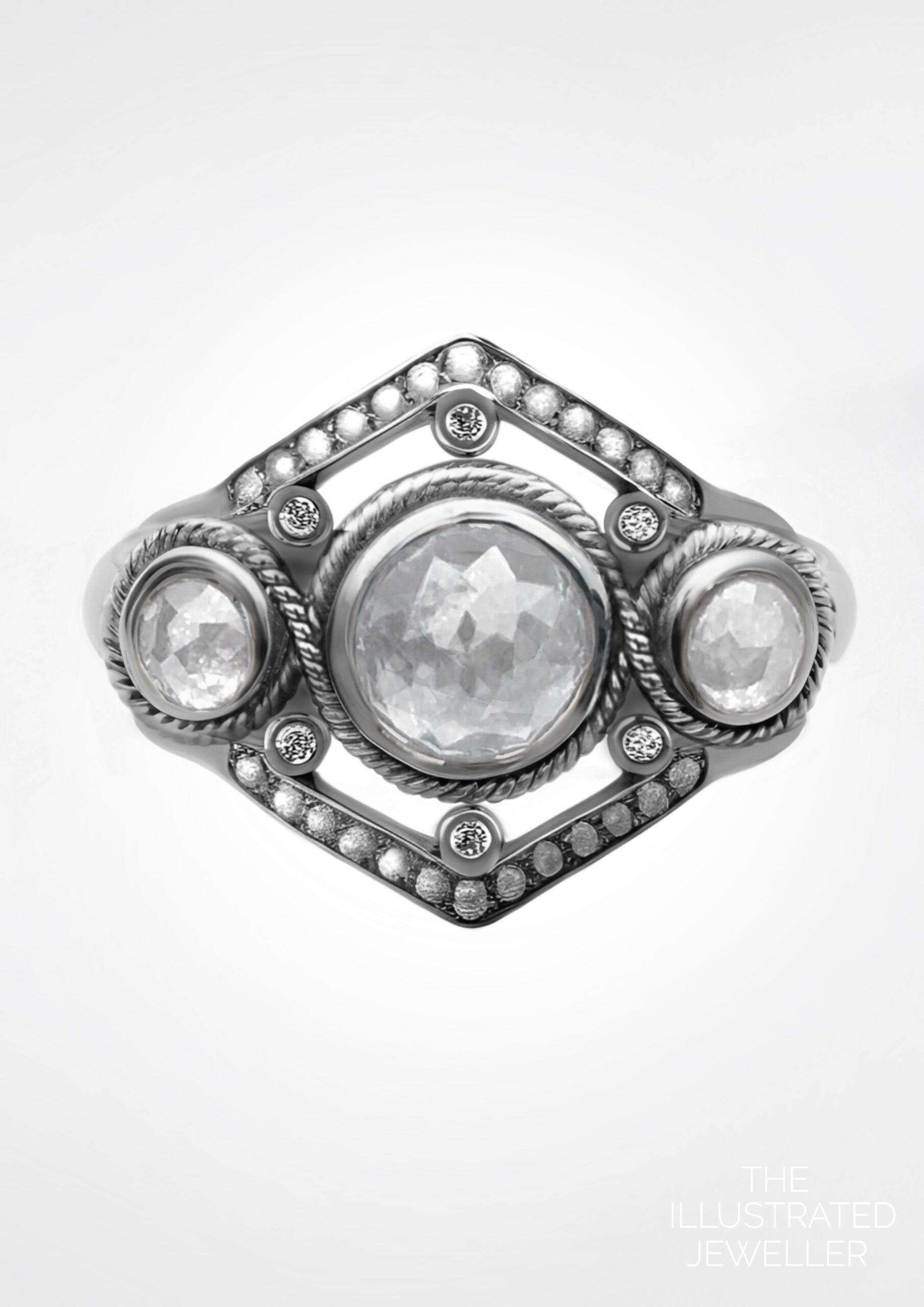 This nautical inspired design is set in solid white gold. It has three rose cut salt and pepper diamonds, the centre being the largest focal point. It encompasses two small shoulder diamonds in bezel settings, with a high mirror finish