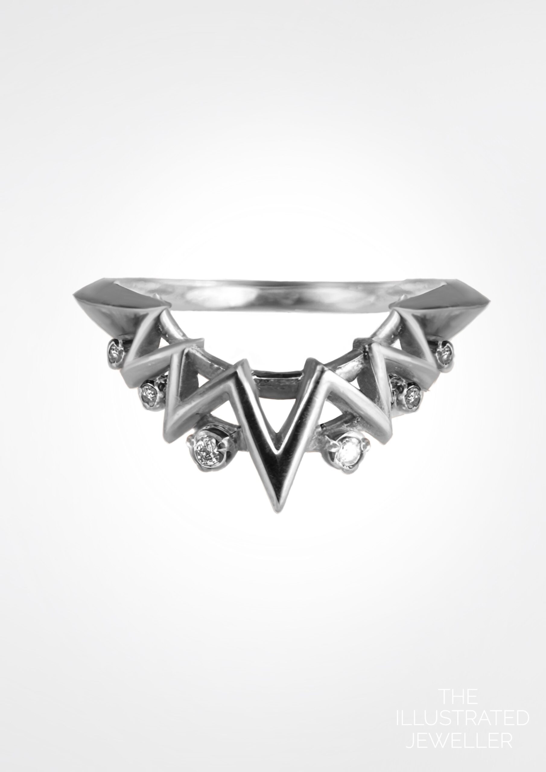 A solid gold compass and crescent moon ring, inspired by how sailors navigated when lost at sea. It has beautiful attention to detail with 1mm and 1.5mm laboratory grown diamonds on a knife edge band.