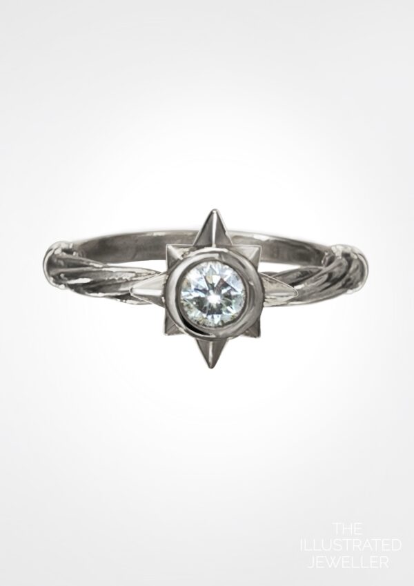 A solid handmade gold ring with ship rope embellishments and knife edge band. It encompasses a laboratory grown 5mm VS+ (D-F) Diamond in a bezel setting.