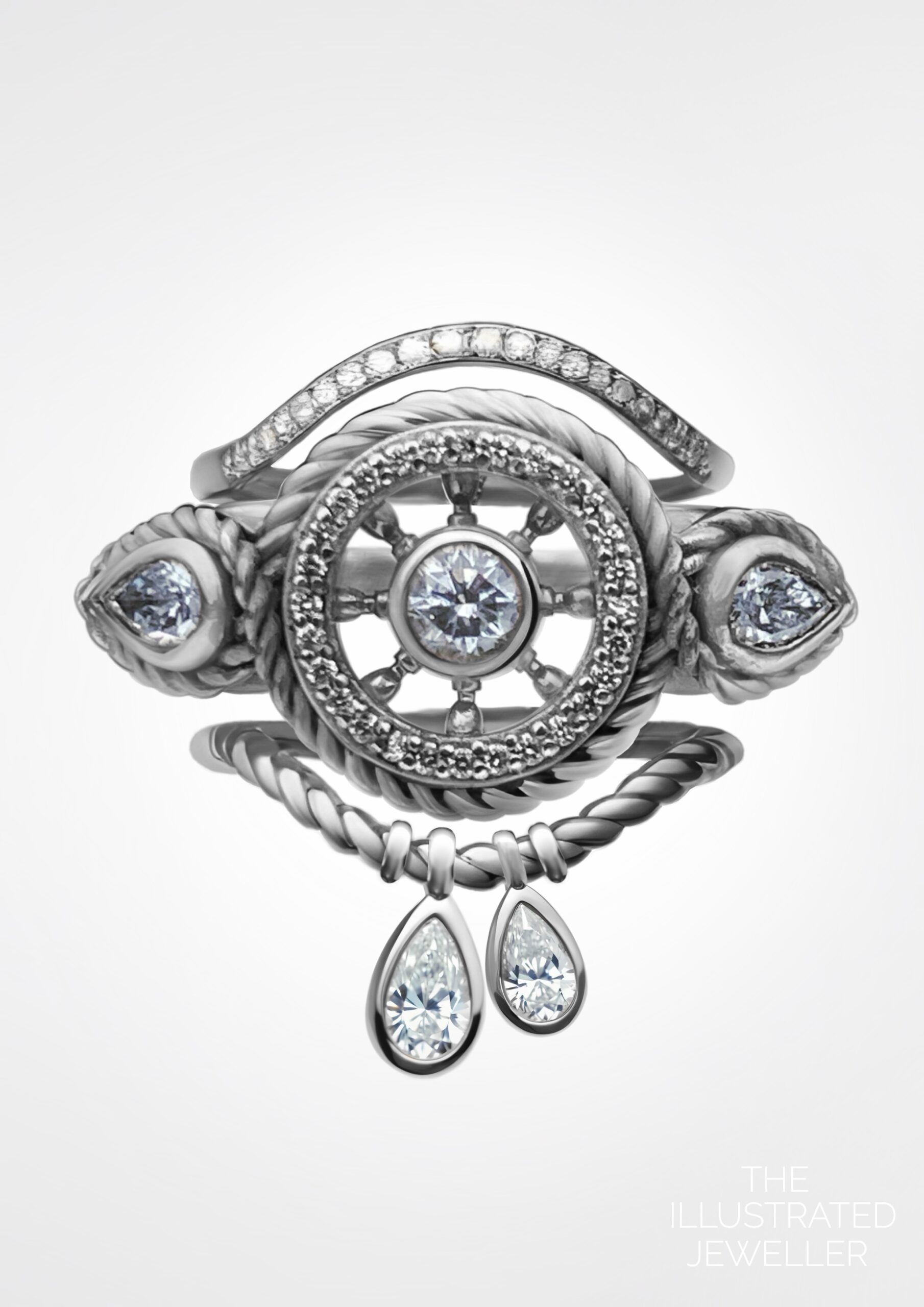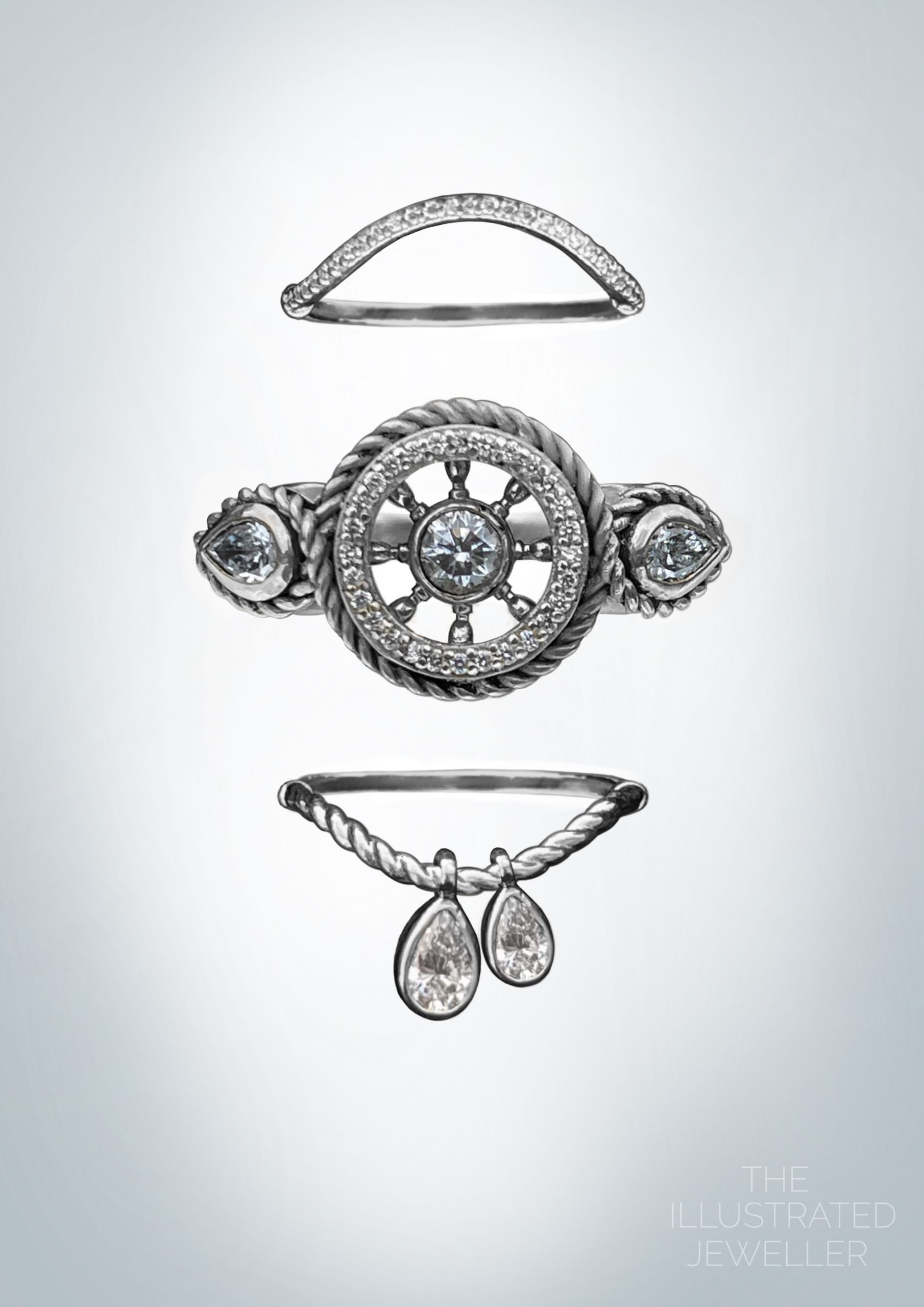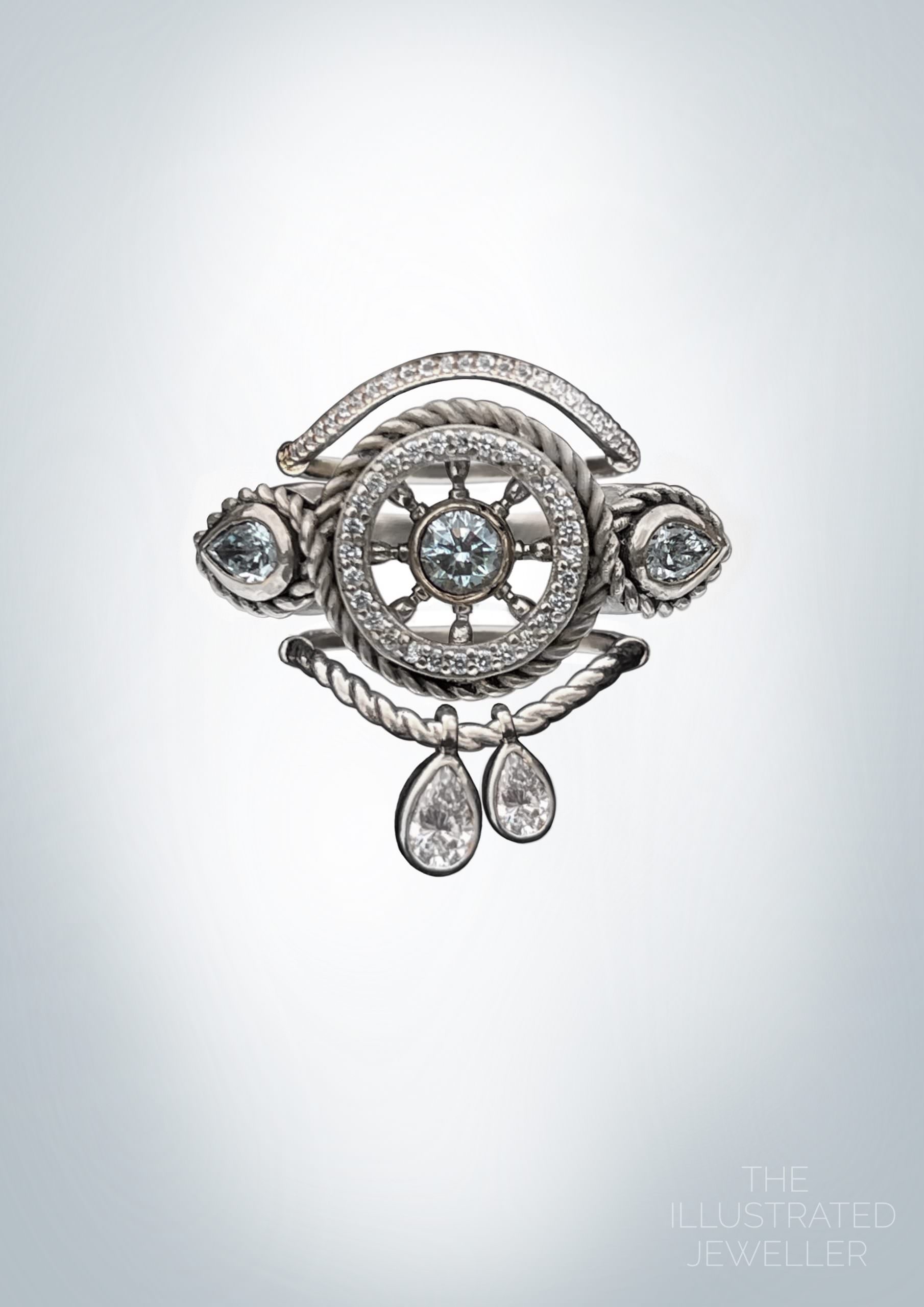 The main design feature is inspired by a hurricane by birds eye viewpoint. The centre continues the sailor theme with the twisted ship rope embellishments and steering wheel. It has a main round brilliant diamond and encompasses 4 pear diamonds to catch the light and give you all the sparkle! The center stone is brilliant round (4mm) with 3 (5x3mm)pears and a larger (6x4mm) pear diamond. There lots of sparkle in the halo and catches the light with (1mm) pave set diamonds.
