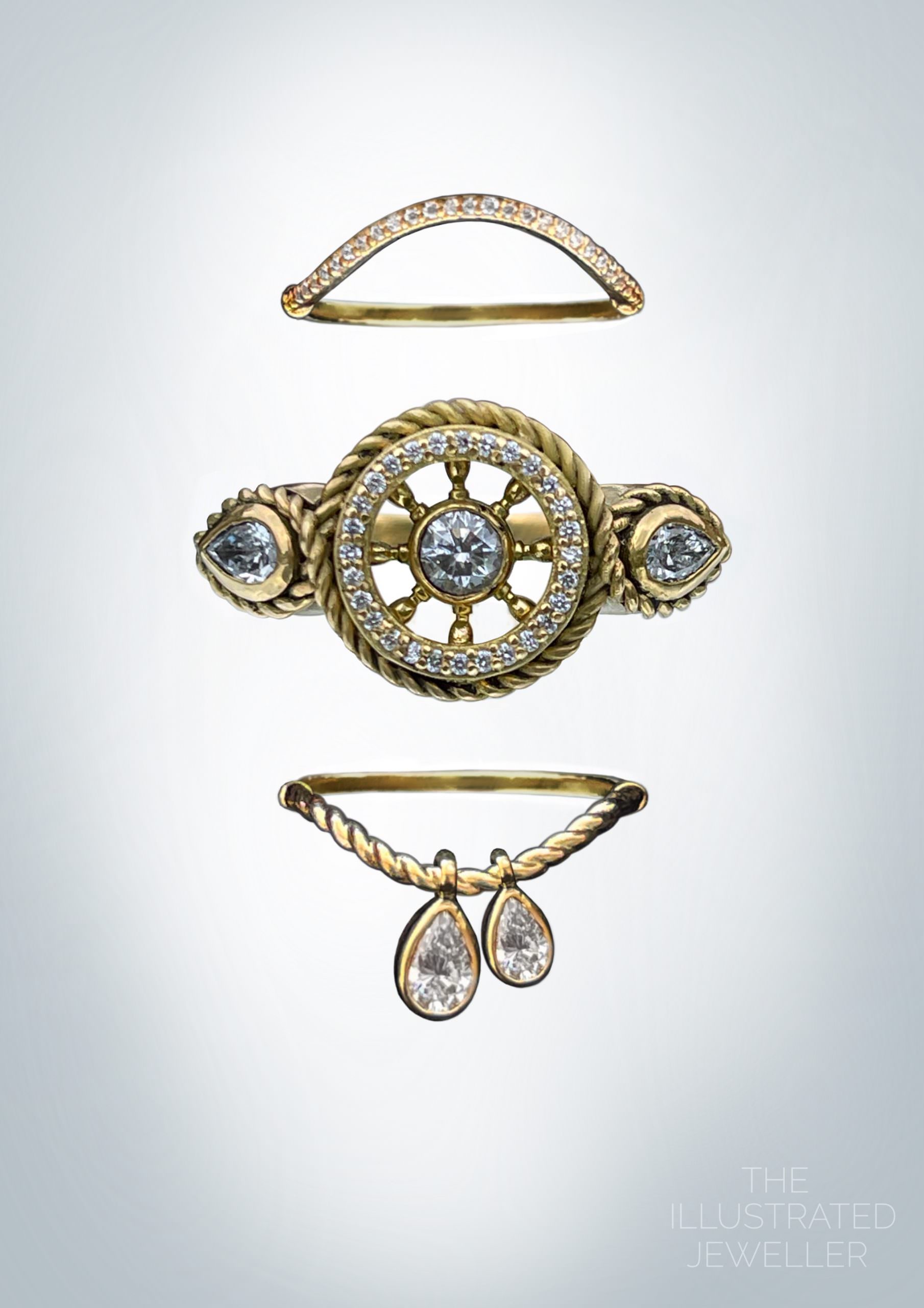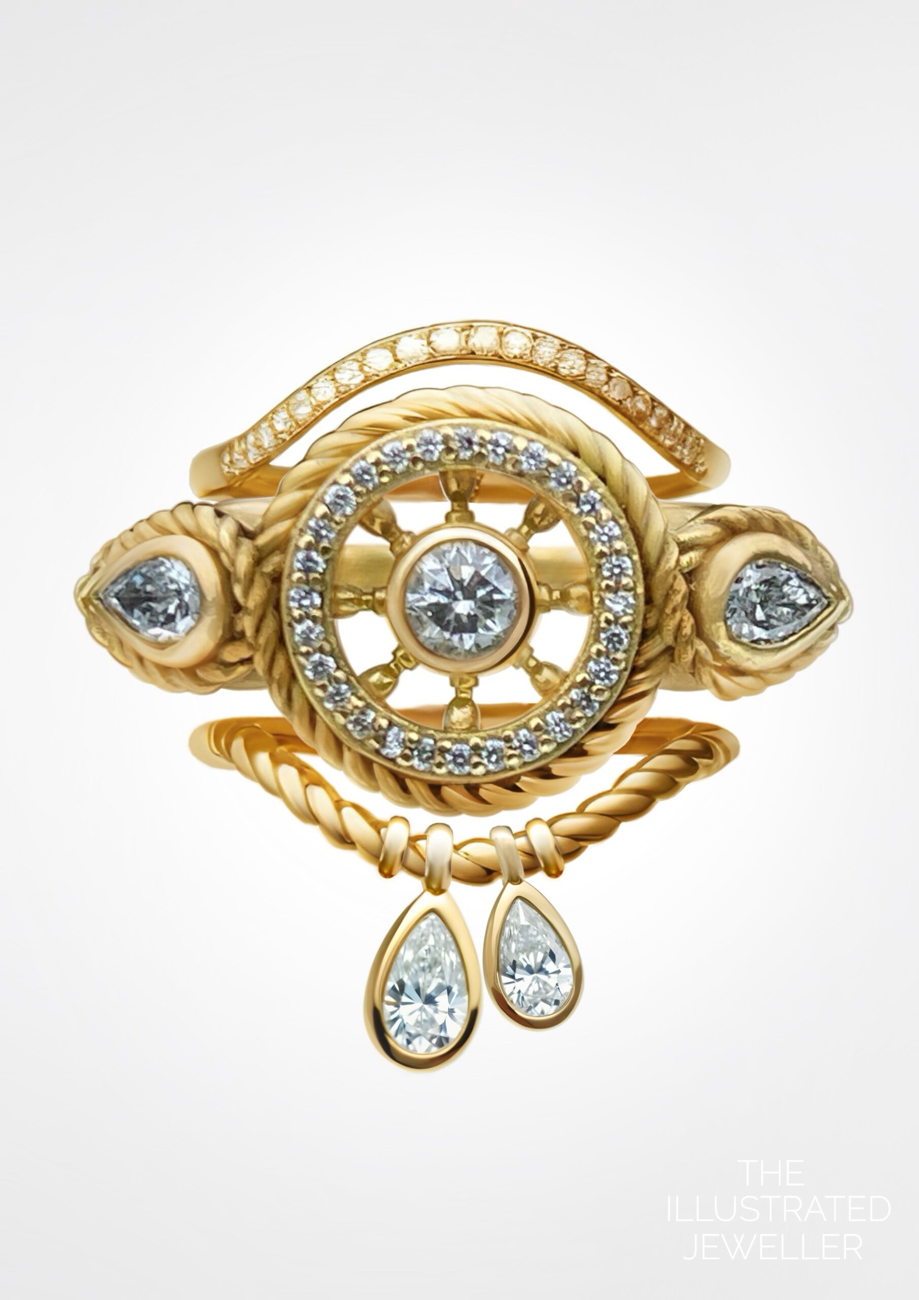 The main design feature is inspired by a hurricane by birds eye viewpoint. The centre continues the sailor theme with the twisted ship rope embellishments and steering wheel. It has a main round brilliant diamond and encompasses 4 pear diamonds to catch the light and give you all the sparkle! The center stone is brilliant round (4mm) with larger (6x4mm) pear diamonds. There lots of sparkle in the halo and catches the light with (1mm) pave set diamonds.