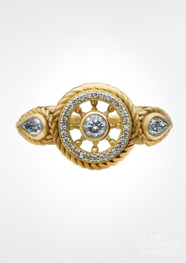 The main design feature is inspired by a hurricane at a birds eye viewpoint. The centre continues the sailor theme with the twisted ship rope embellishments and sunken steering wheel. It has a main round brilliant diamond and encompasses pear diamonds with a halo of white pave set diamonds to catch the light and give you all the sparkle!