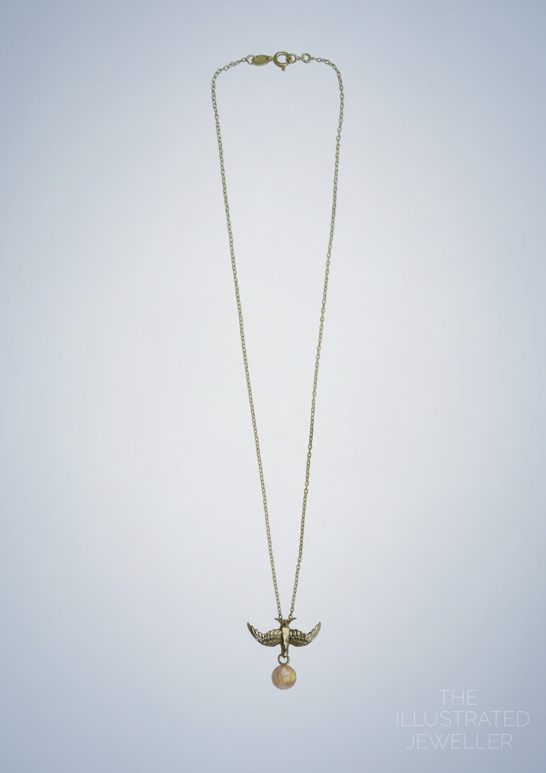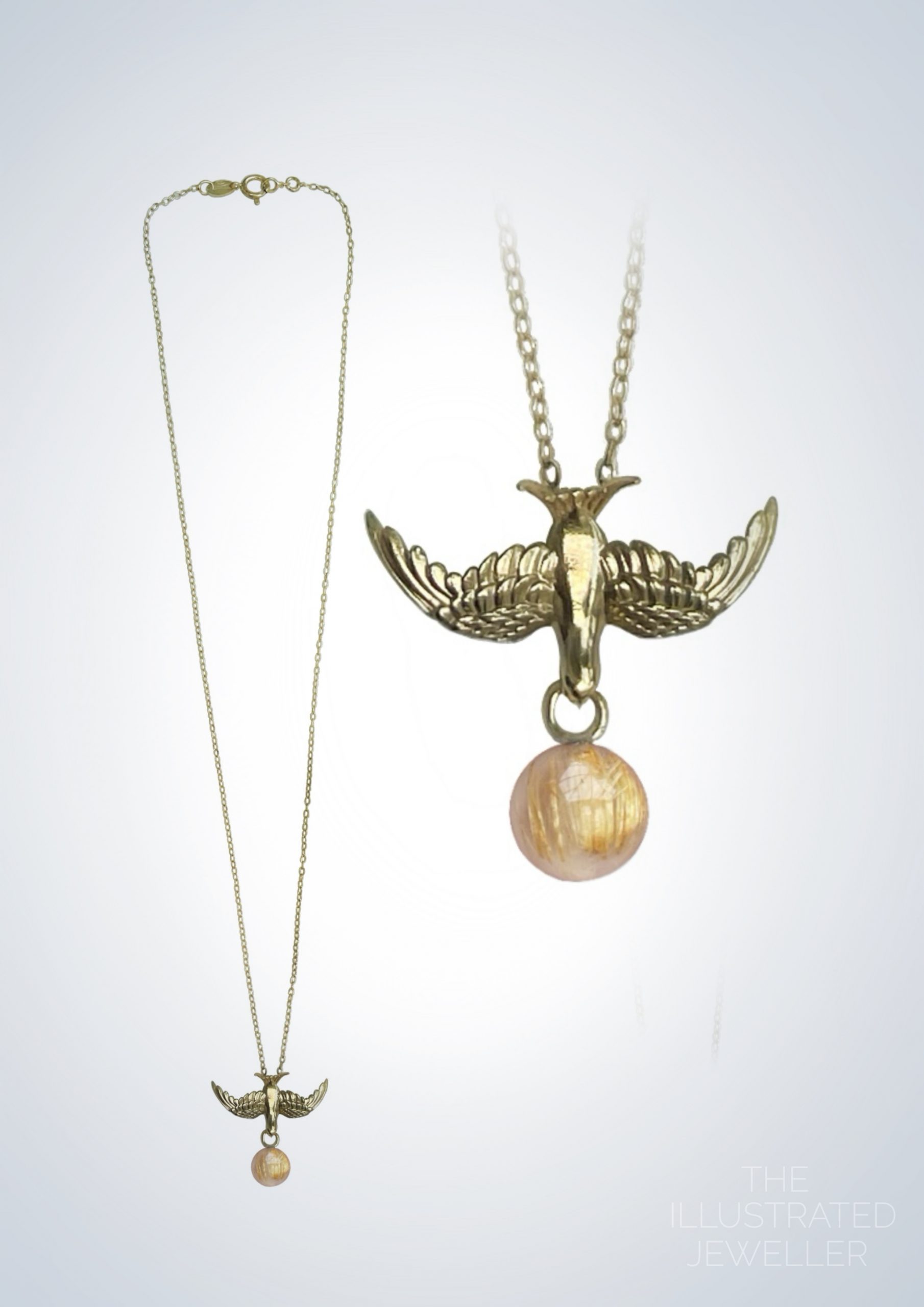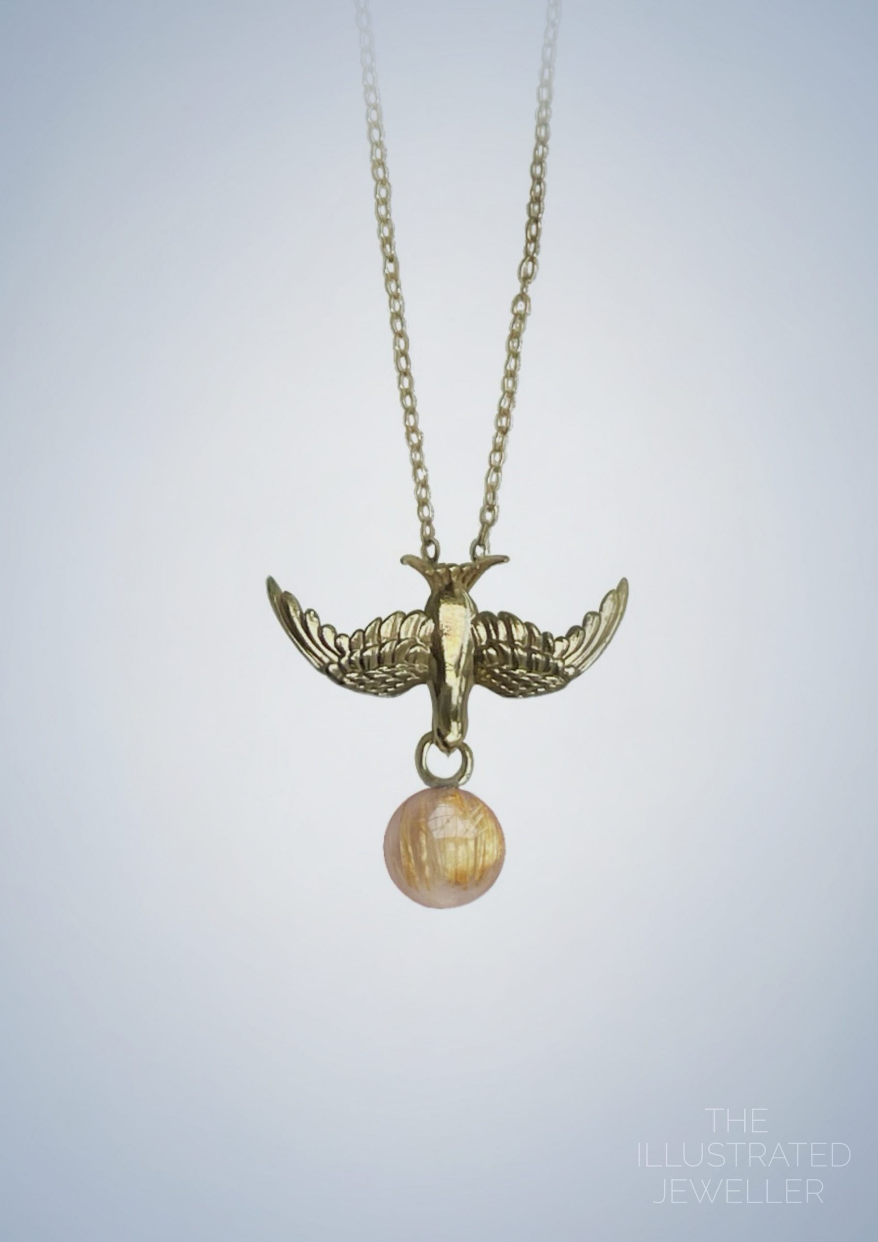 Gold swallow pendant, rutilated quartz gemstone, ultra thin trace chain
