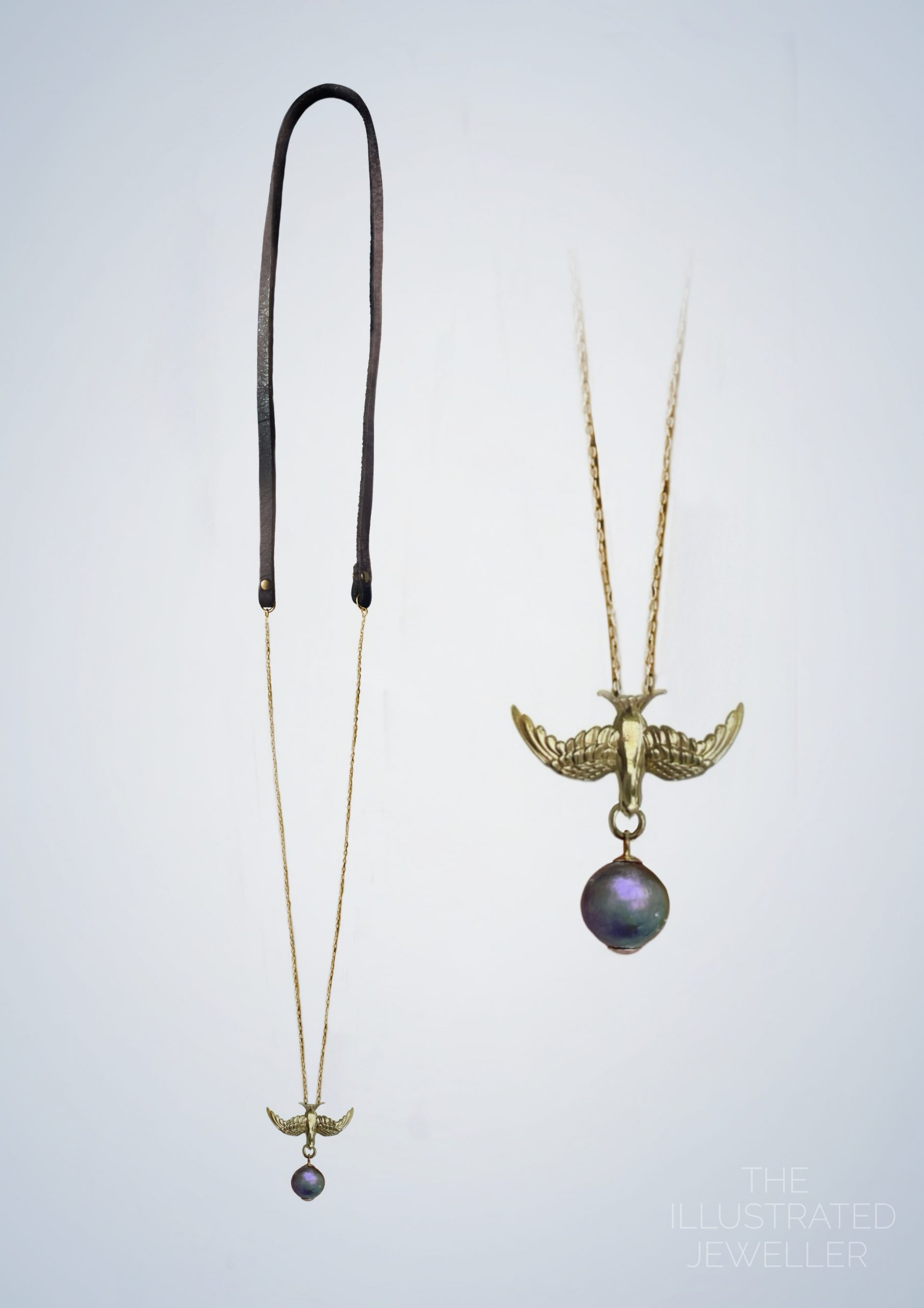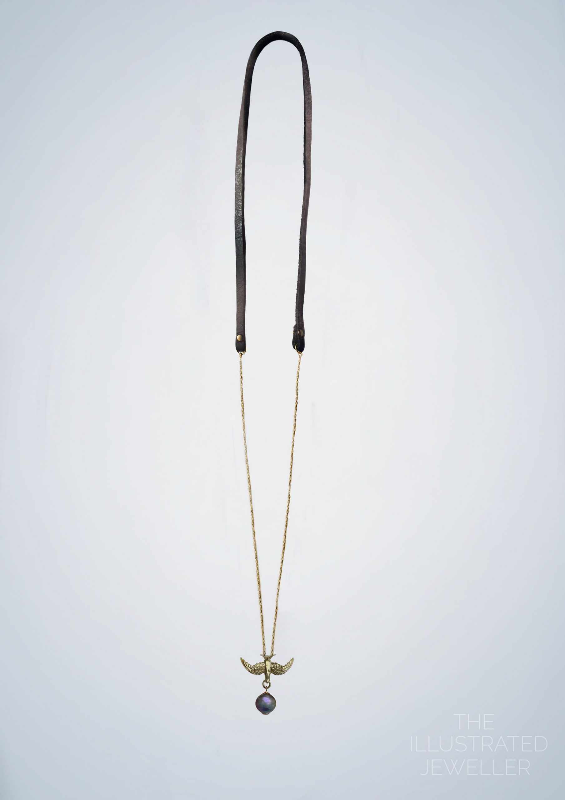 Gold Swallow pendant with pearl, Leather Strap, Ultra Thin Trace Chain