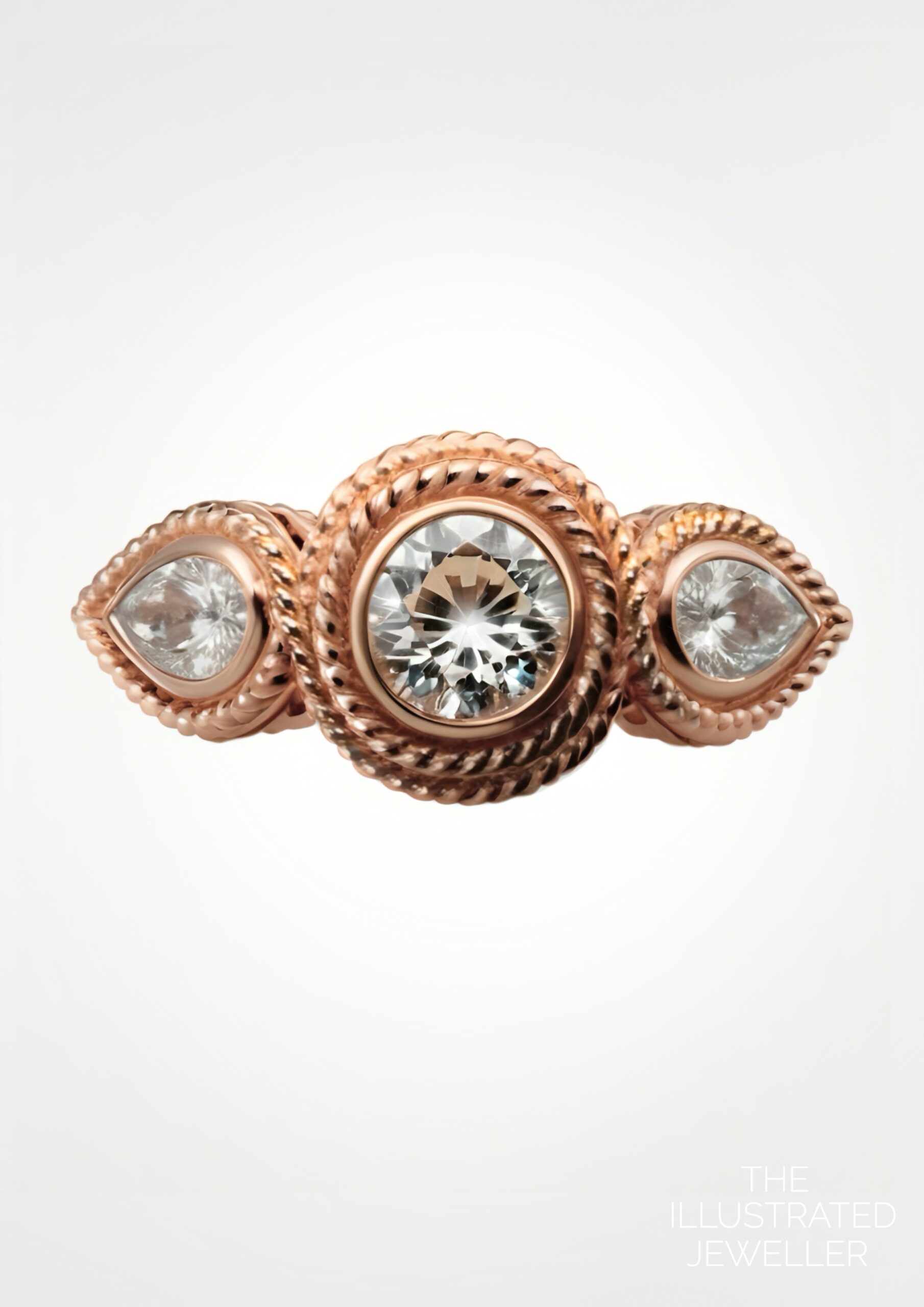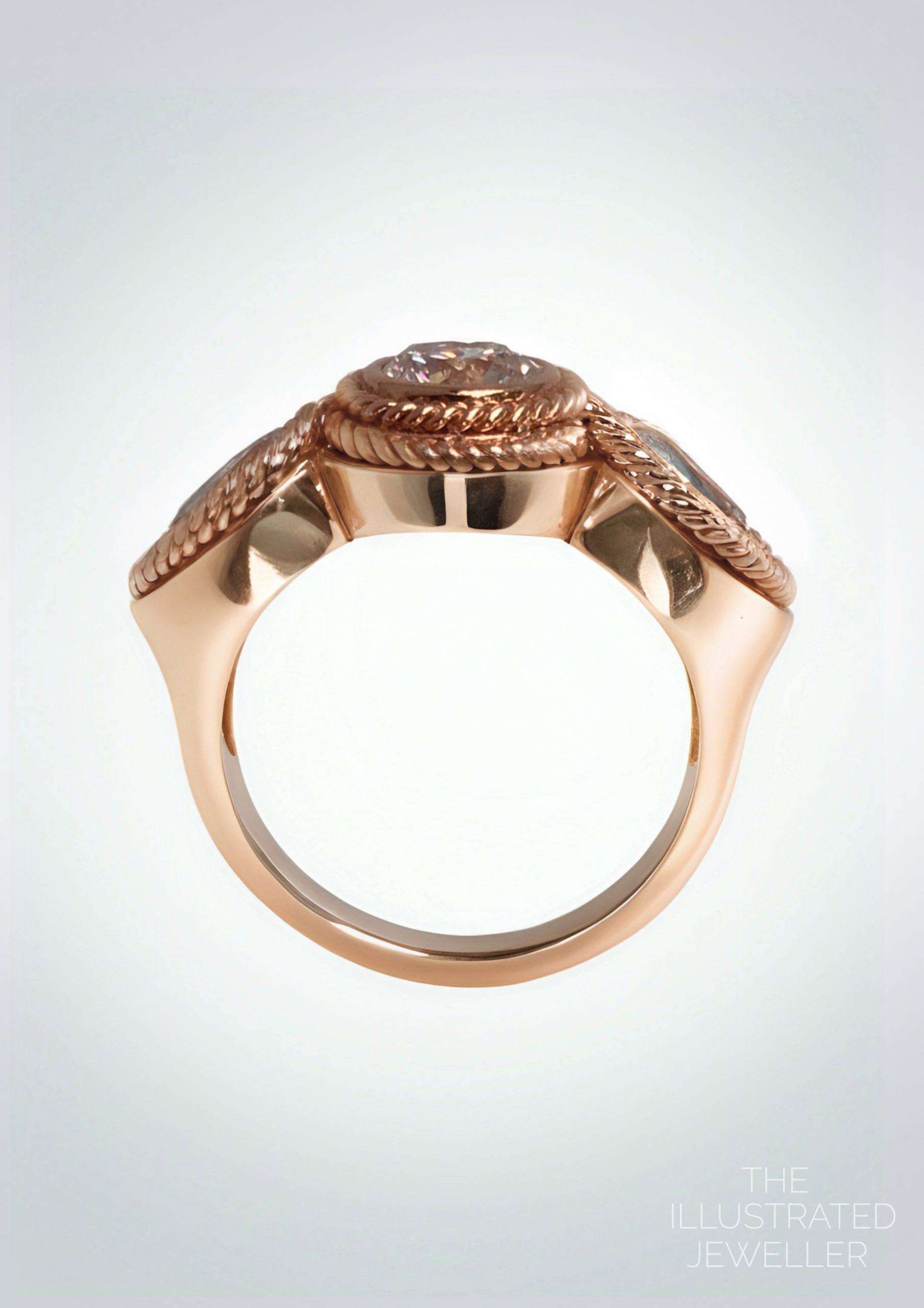 Set in solid gold, this piece has a large centre diamond 5mm VS+D-F, with shoulder bezel set pear diamonds 5x3mm VS+D-F, giving you all the sparkle you’ll ever need! It has two rows of twisted ship rope embellishments making an infinity symbol shape. This unique engagement ring is fully customisable. If you like the idea of this design but require alterations please select “make it your own” button and we can arrange a consultation. If you are working to a lower budget we can quote for laboratory grown diamonds.