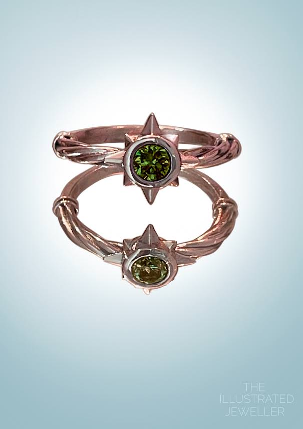 Solid handmade gold ring set, with ship rope knots on knife edge bands. The middle star encompasses a 5mm coloured gemstone in a bezel setting, with 1mm and 1.5mm laboratory grown Dimond embellishments in the surrounding stacks.