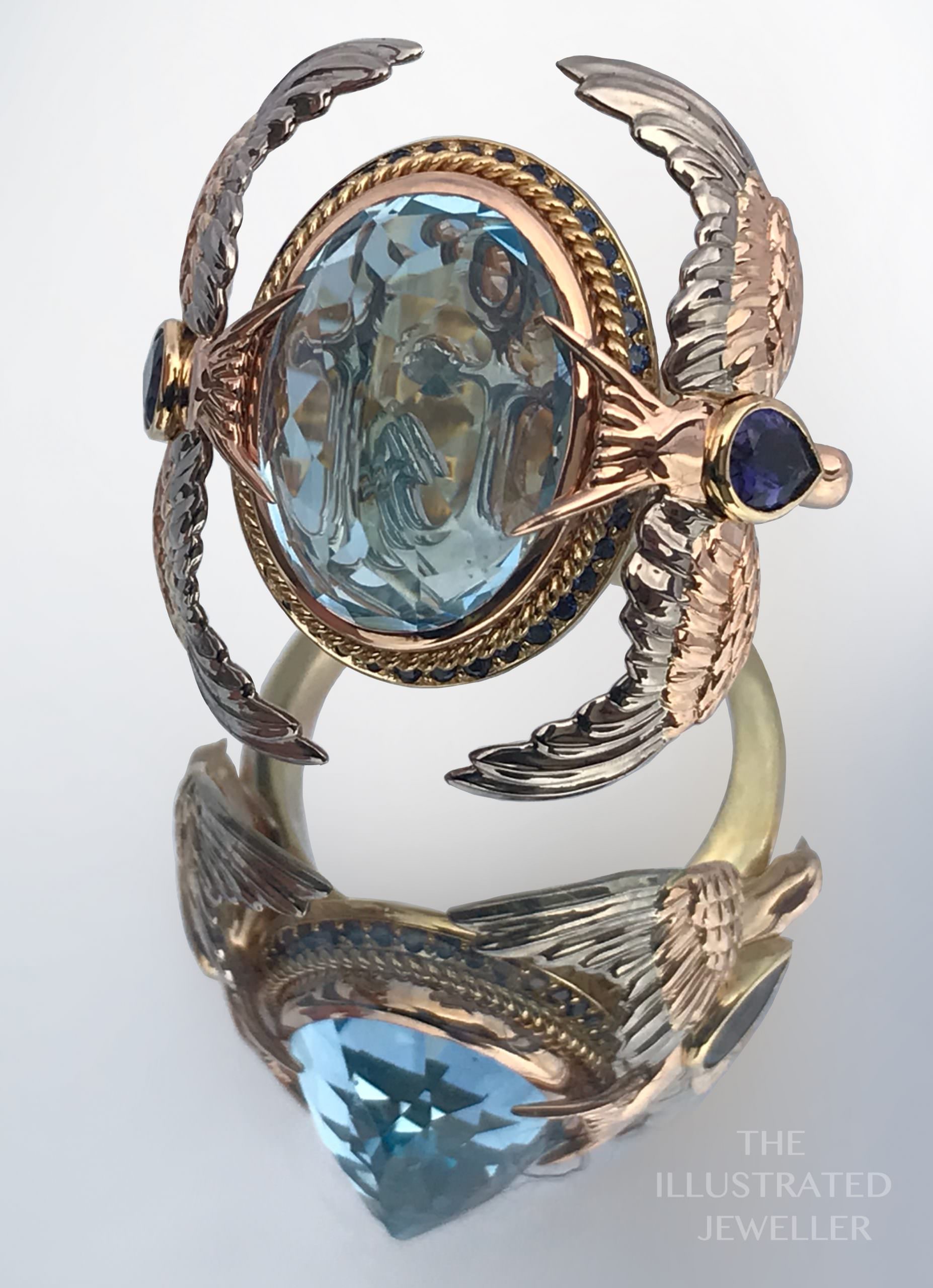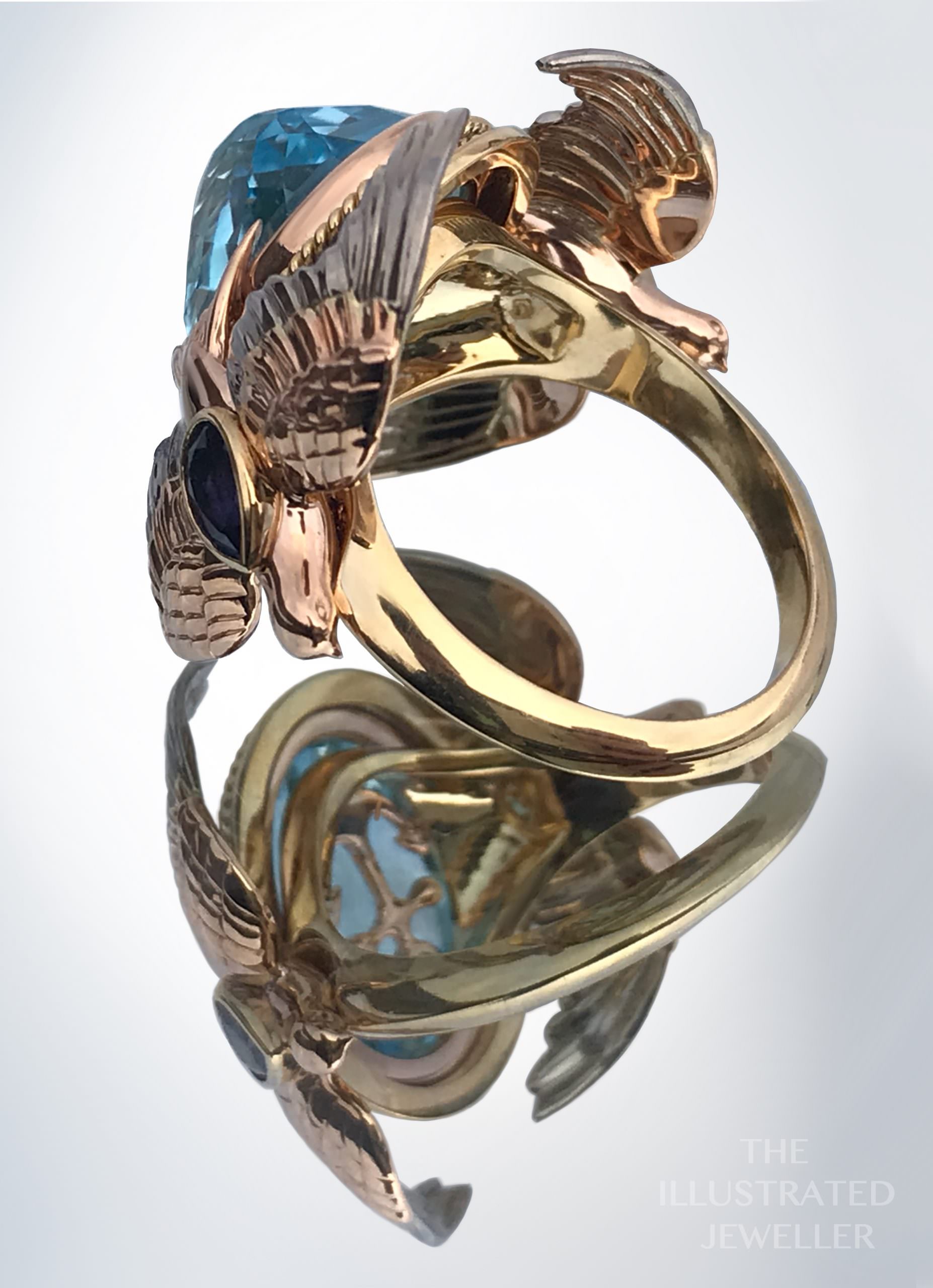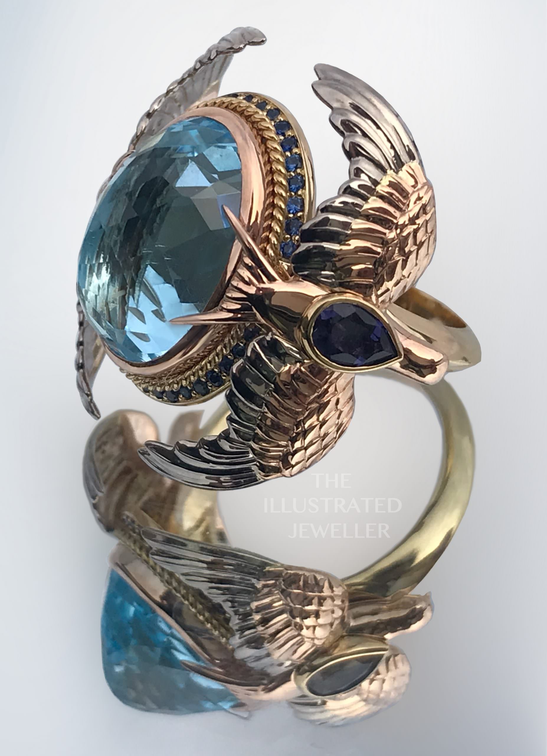 The swallows encompass two pear Iolite gemstones, representing the blue/purple tones of the birds plumage. Alongside the twisted ship rope details, lies a pave set of deep blue sapphires.
