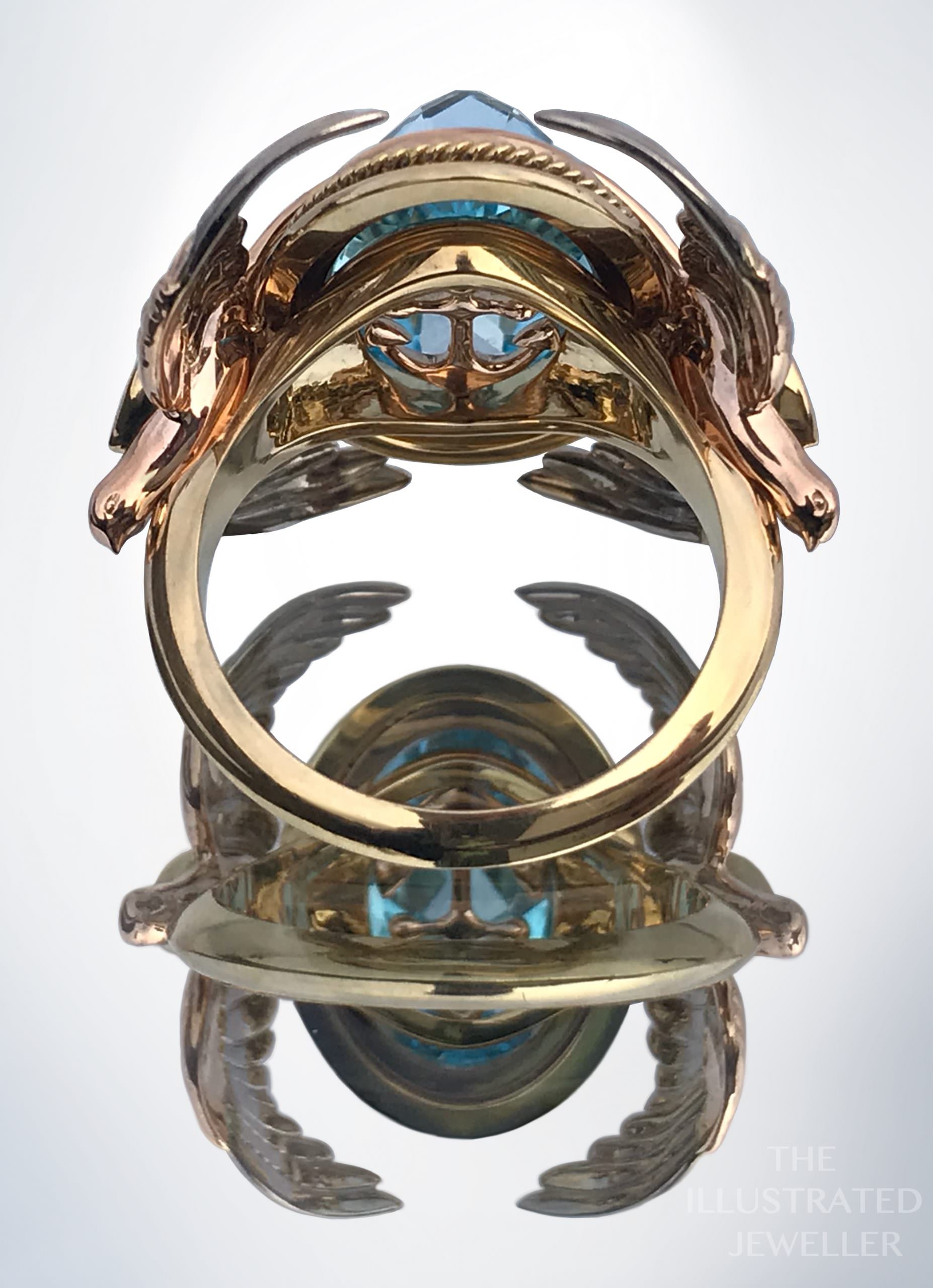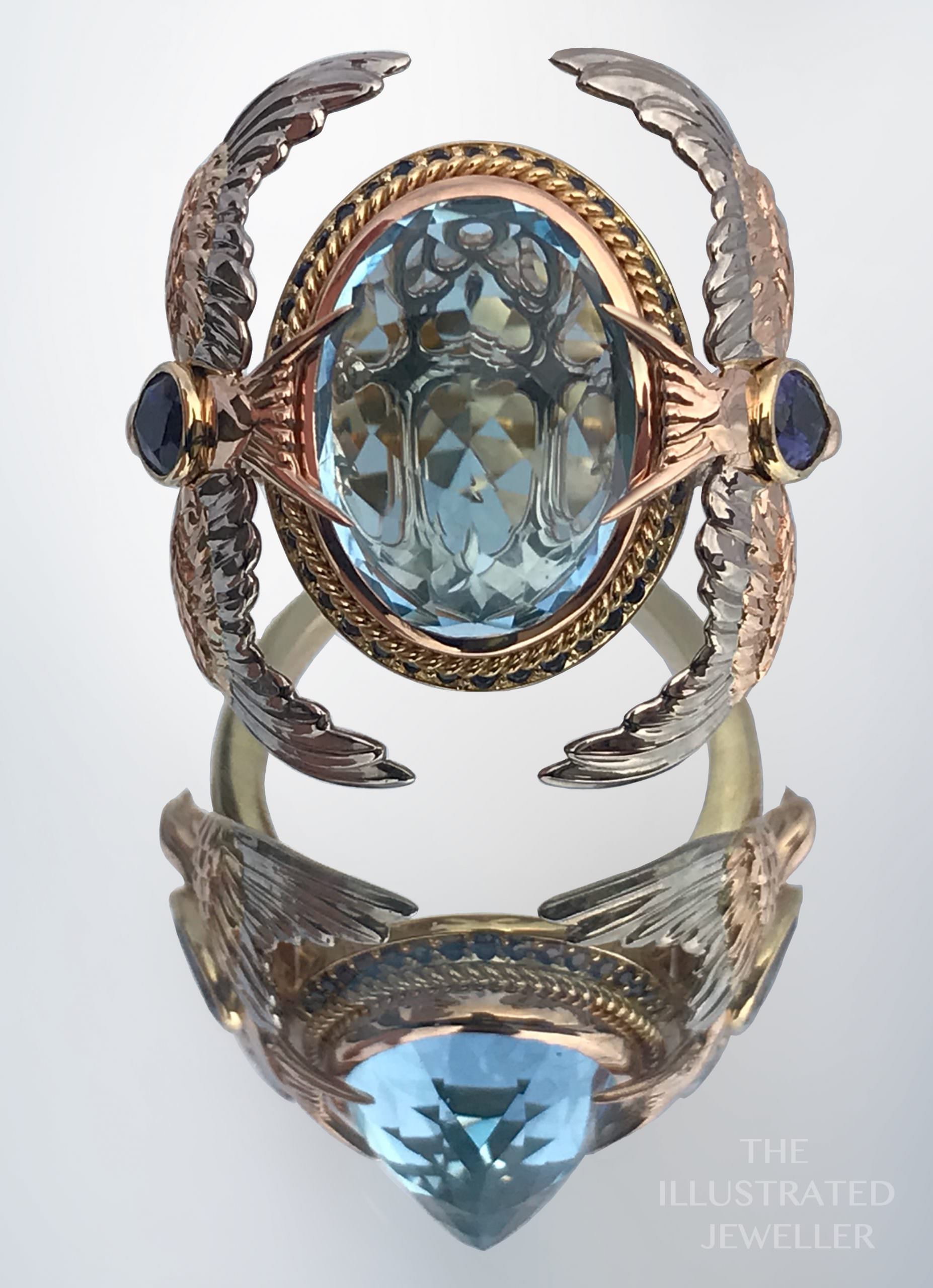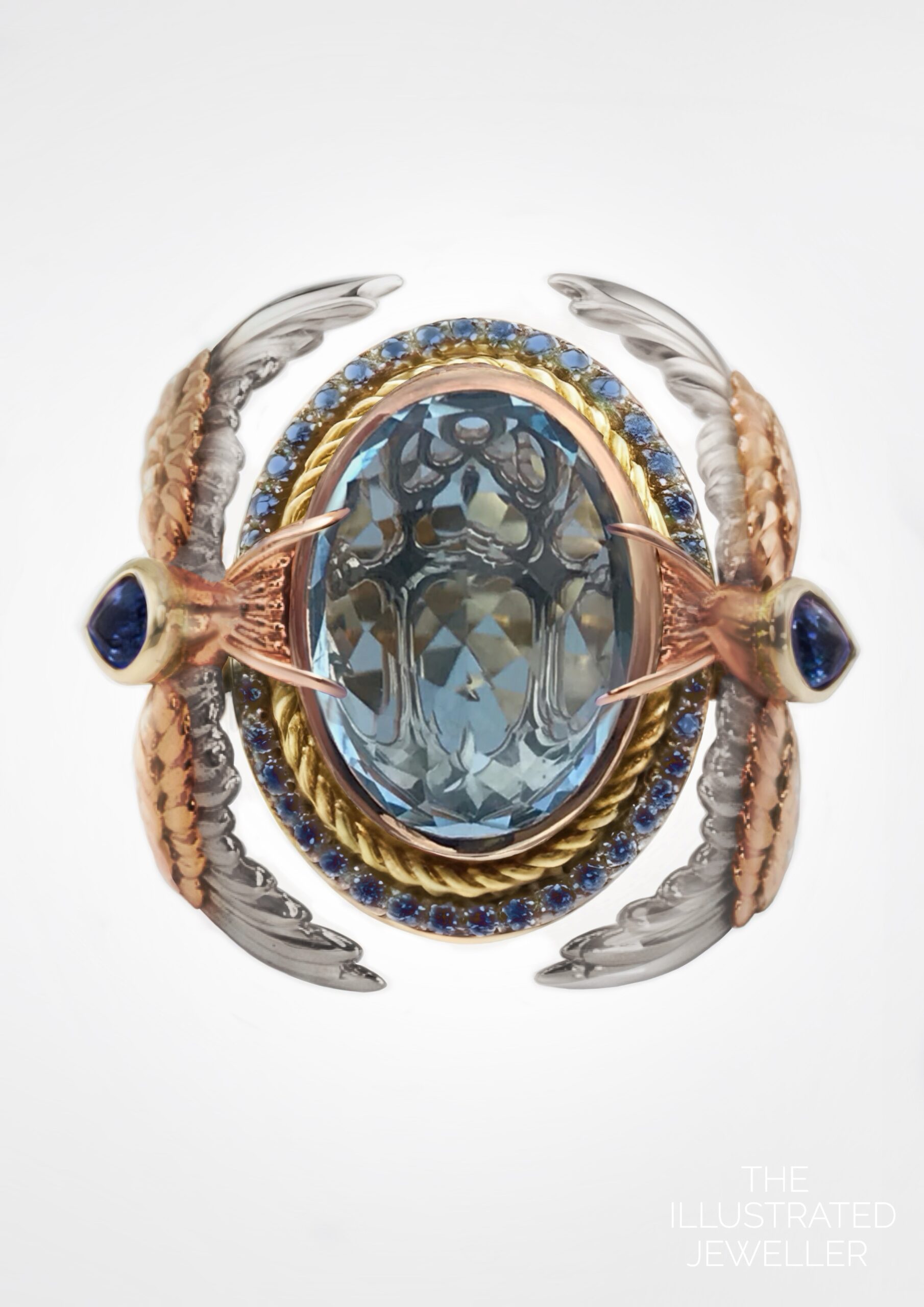 Carefully placed yellow, white and rose gold, delivers a harmony of cool and warm metal tones. The centre stone is a sky blue topaz, inverted so the viewer can see the hidden anchor, which reveals itself on certain angles when caught by the light.