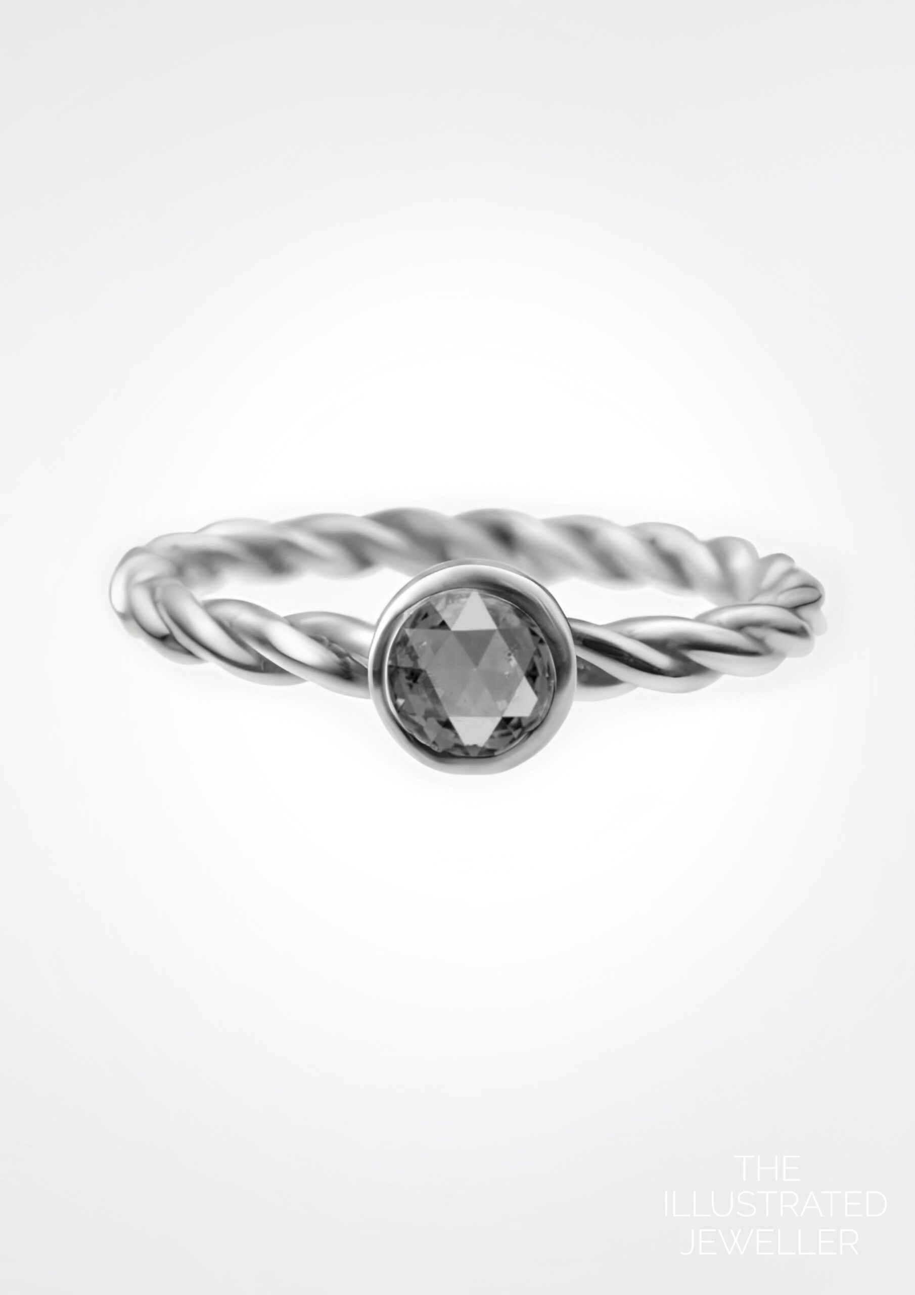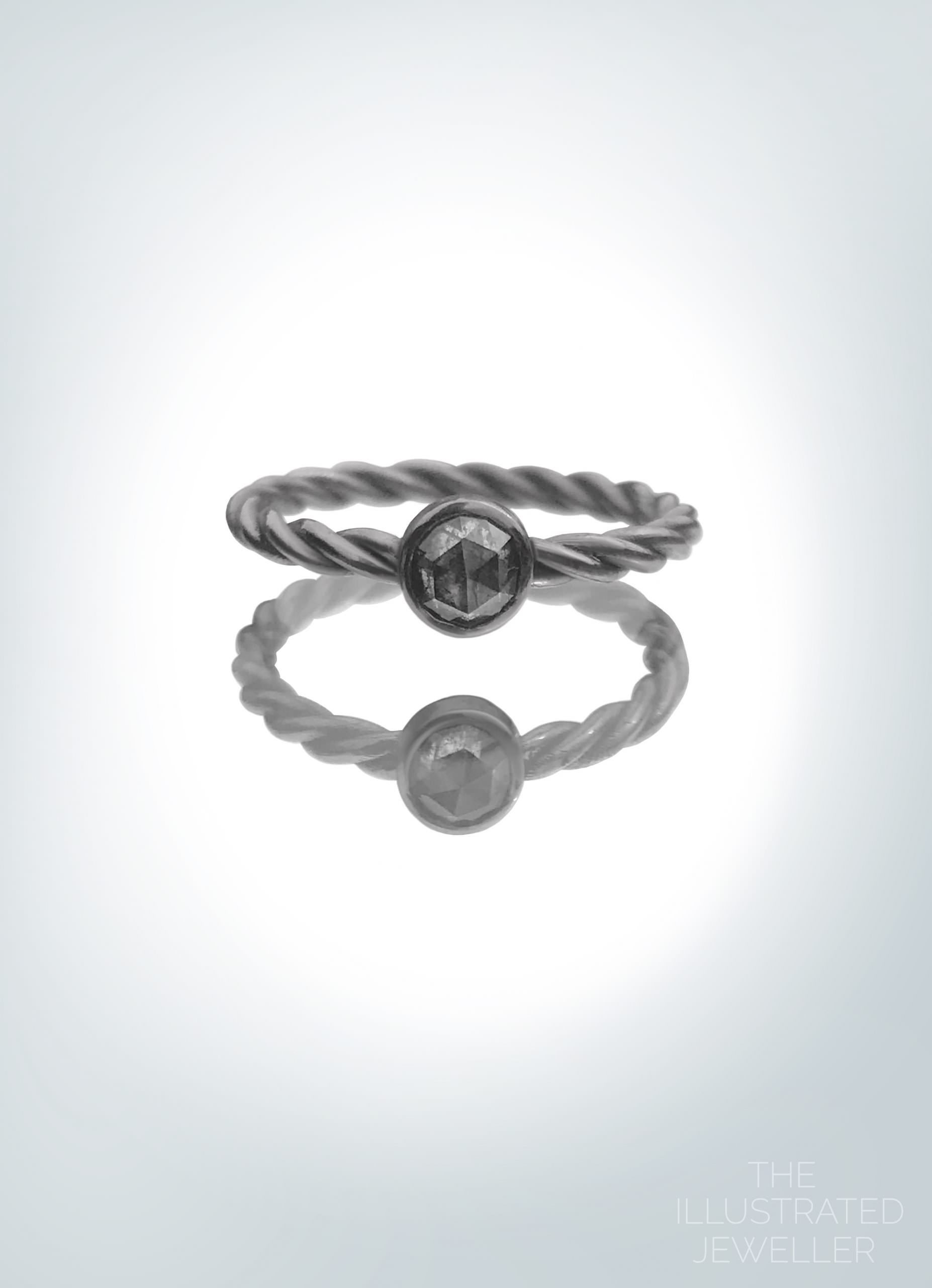 A solid gold ring handmade in a ship rope band. It encompasses a rose cut salt and pepper diamond 4.4mm in a bezel setting.