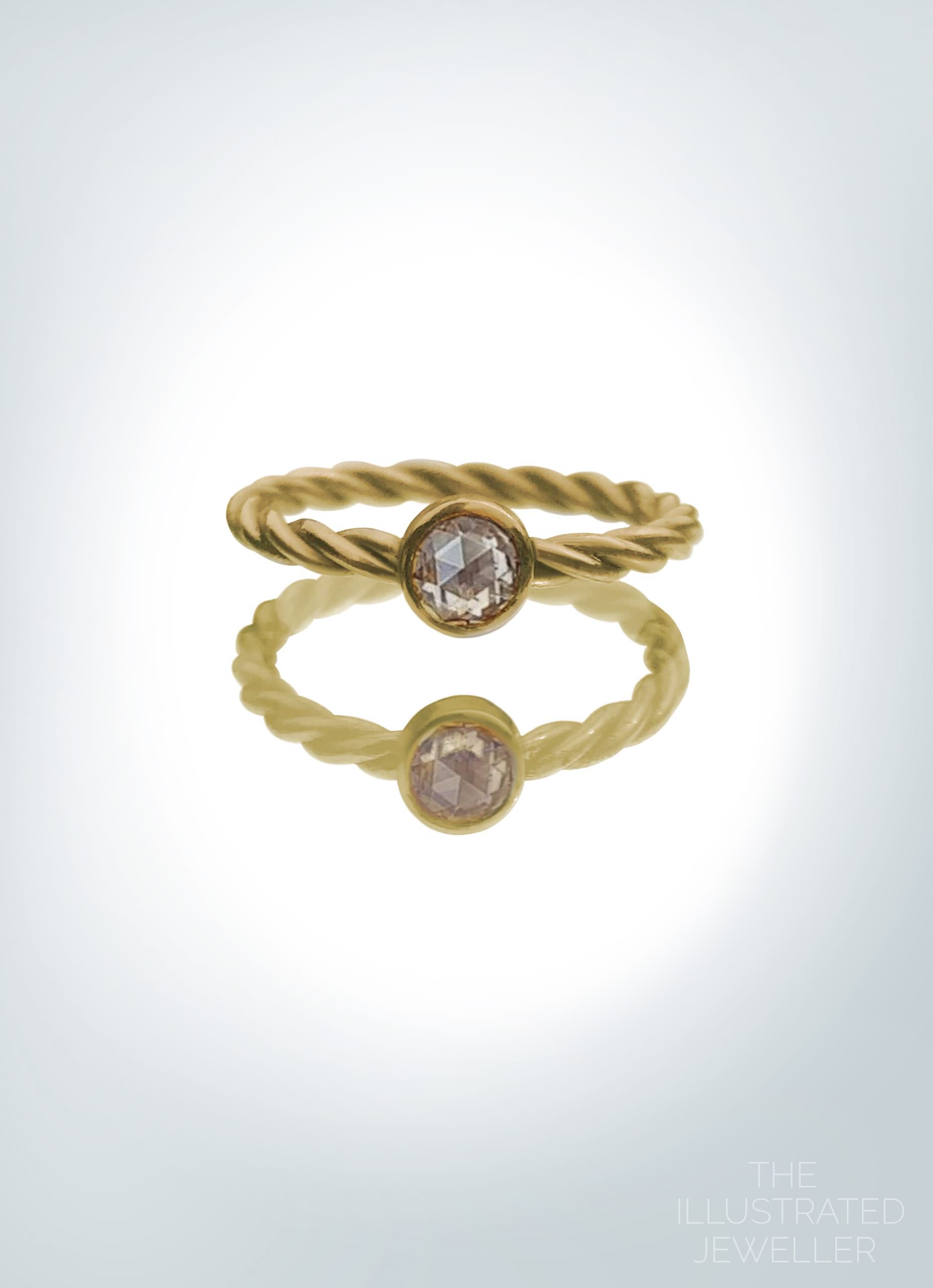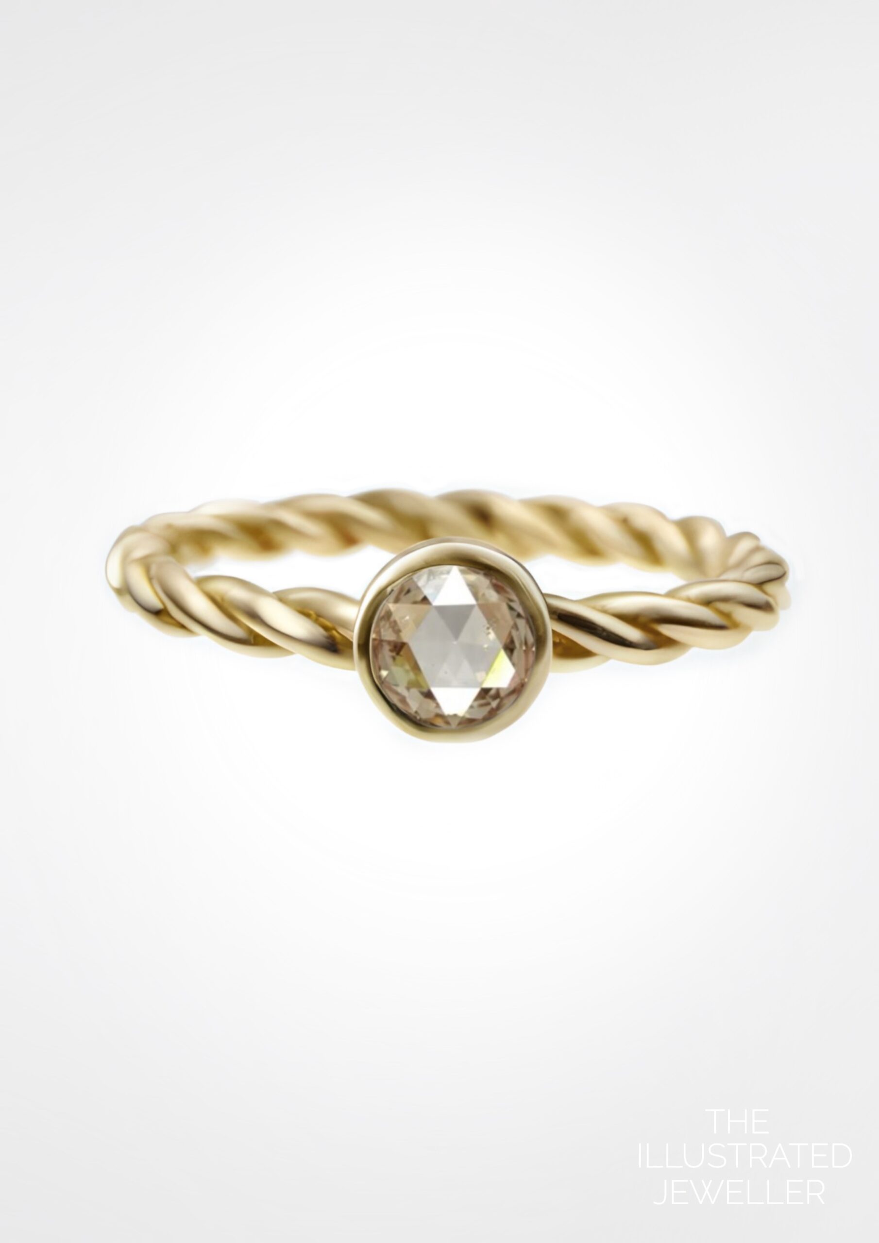 A solid gold ring handmade in a ship rope band. It encompasses a rose cut salt and pepper diamond 4.4mm in a bezel setting.