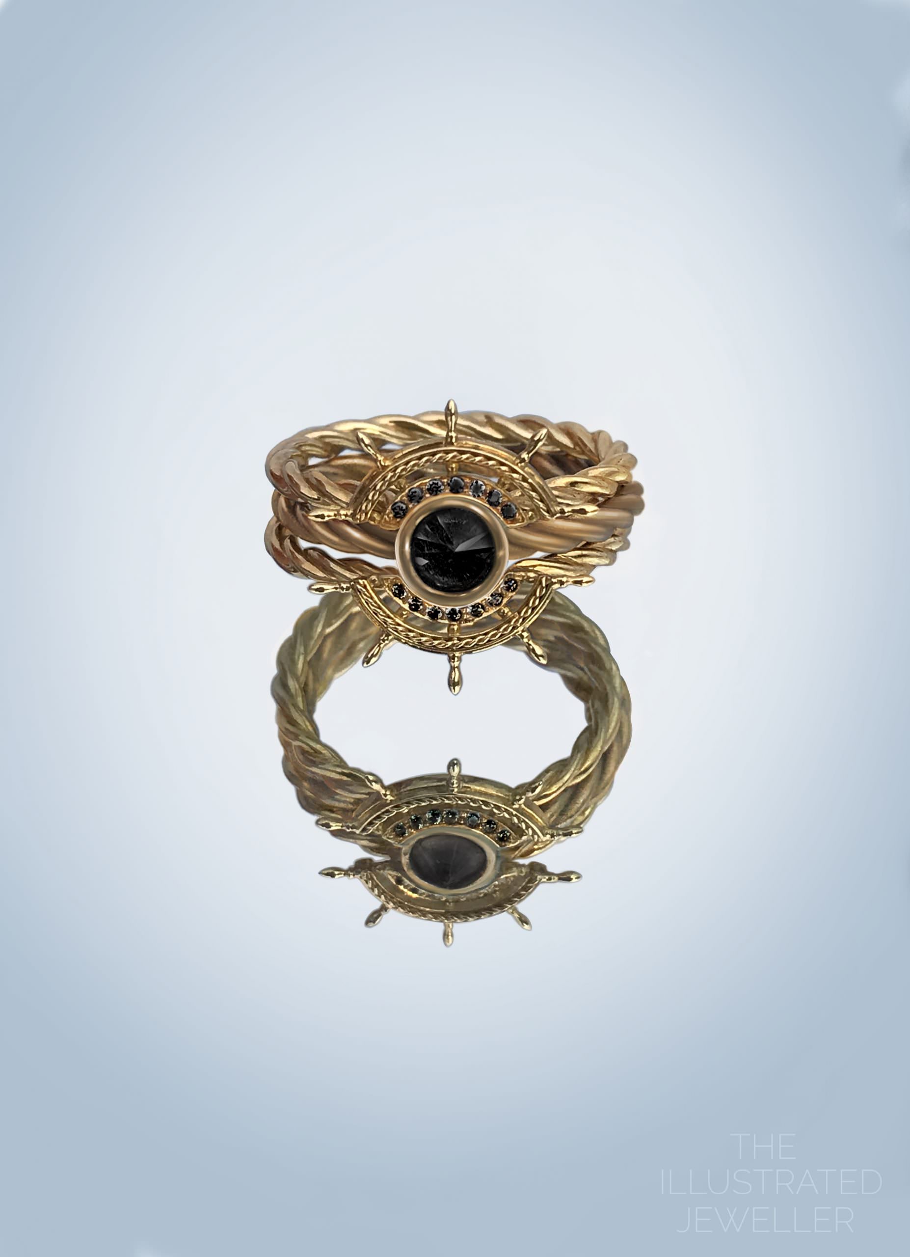 These three rings make up a sophisticated stack, symbolising the perils that sailors would meet on the sea. These rings have intricate attention to detail. These two outer “ship wheel rings” made in solid Yellow gold, with a halo of white vs2 diamonds. It has been made by hand, with twisted ship rope details and embellishments matching the shank.