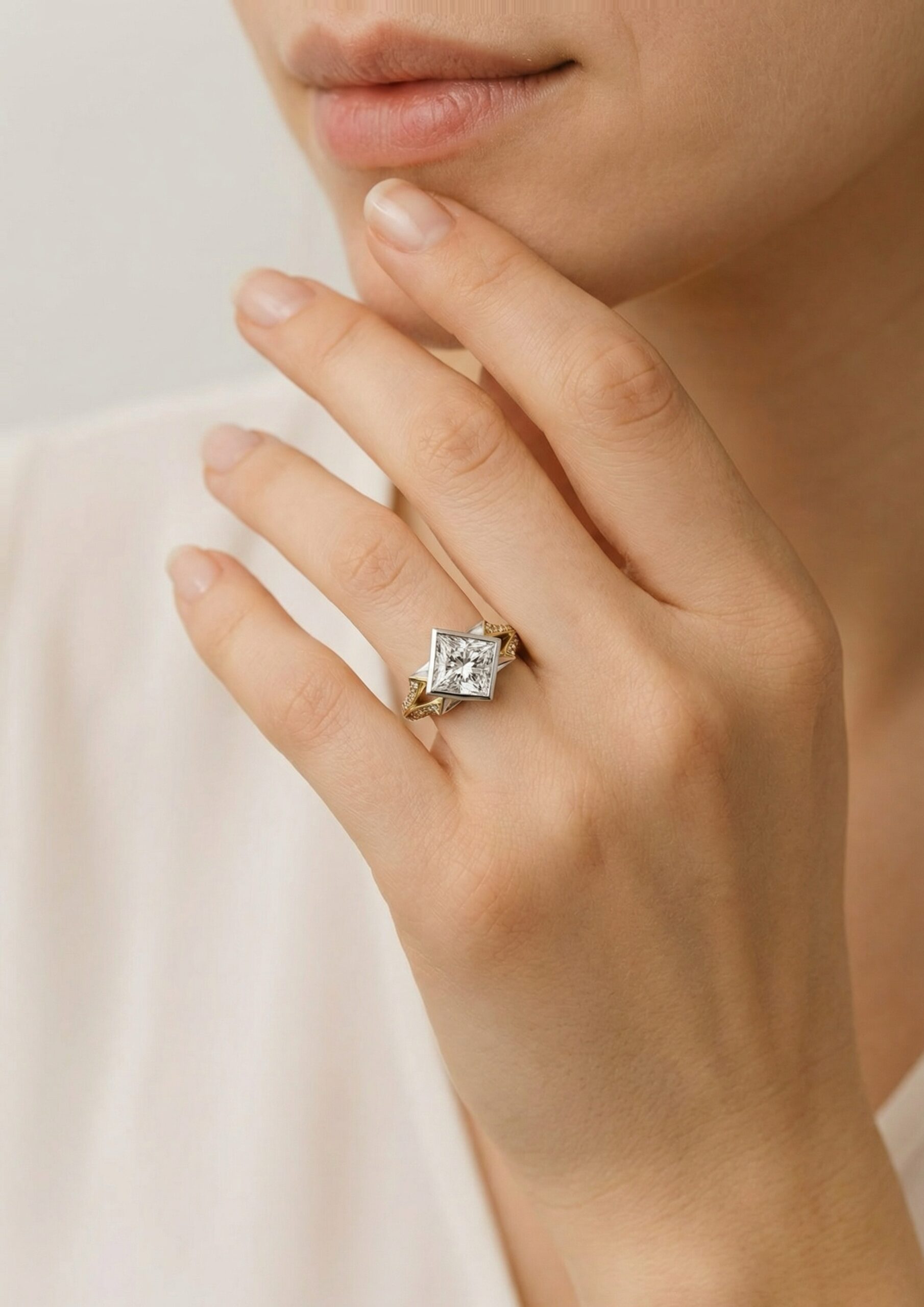 The Lumora princess diamond ring showcases a crisp square-cut diamond set in sculptural mixed golds. Defined by clean geometry and sharp brilliance, this design offers a bold yet refined expression of modern elegance.