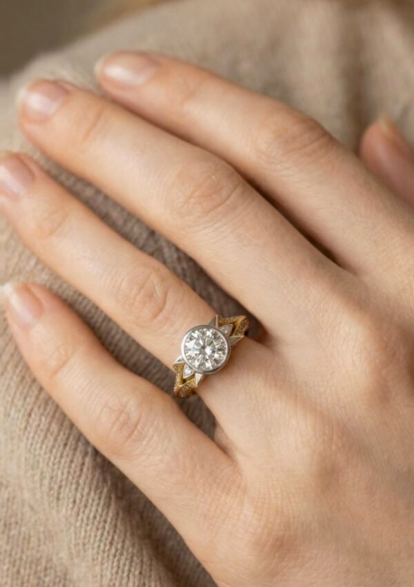 The mixed-gold setting introduces contrast and warmth, subtly framing the diamond while maintaining a clean, architectural profile. Proportions are carefully considered to ensure comfort, durability, and everyday wearability.