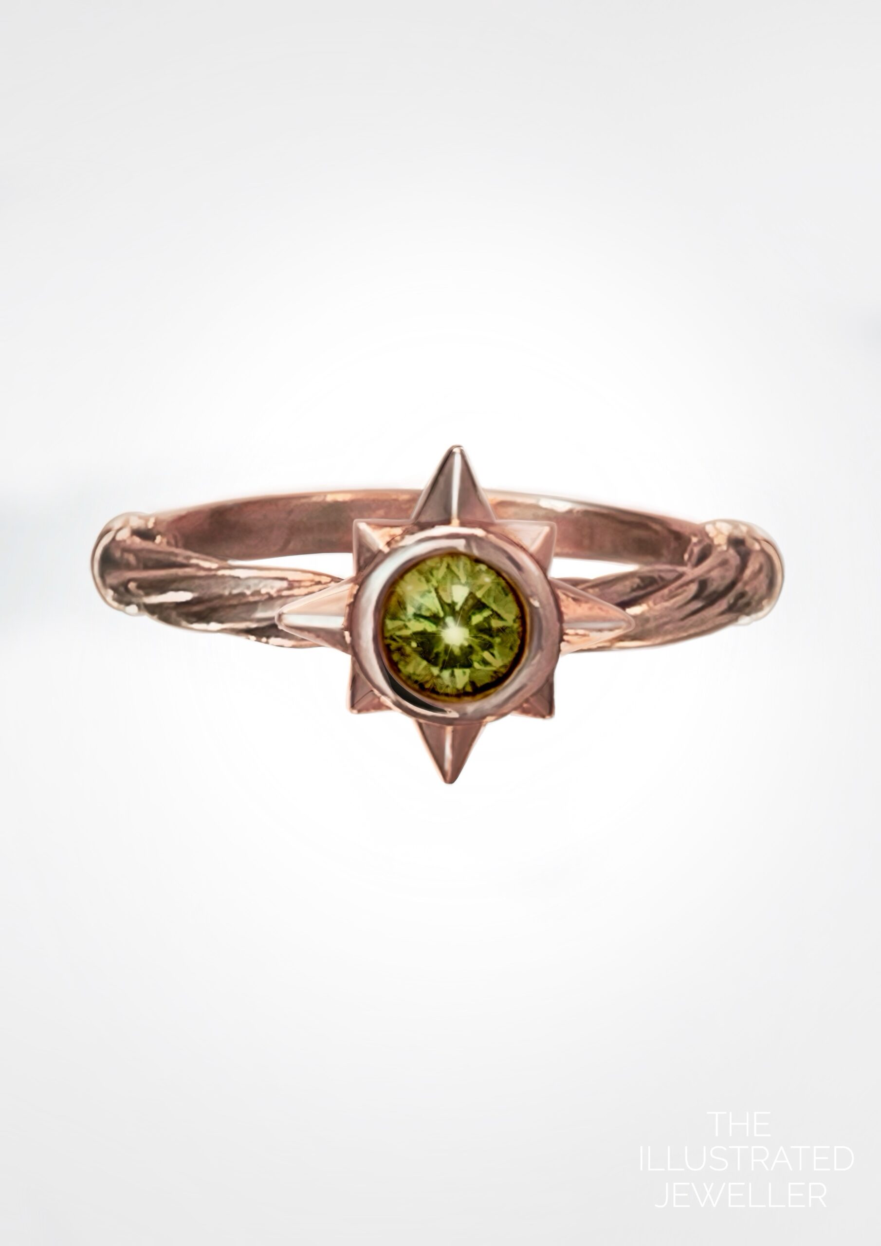 A solid handmade gold ring with ship rope embellishments and knife edge band. It encompasses a pink rubellite 5mm gemstone in a bezel setting. which is fully customizable. If you would prefer a specific coloured gemstone, please press “make it your own button”