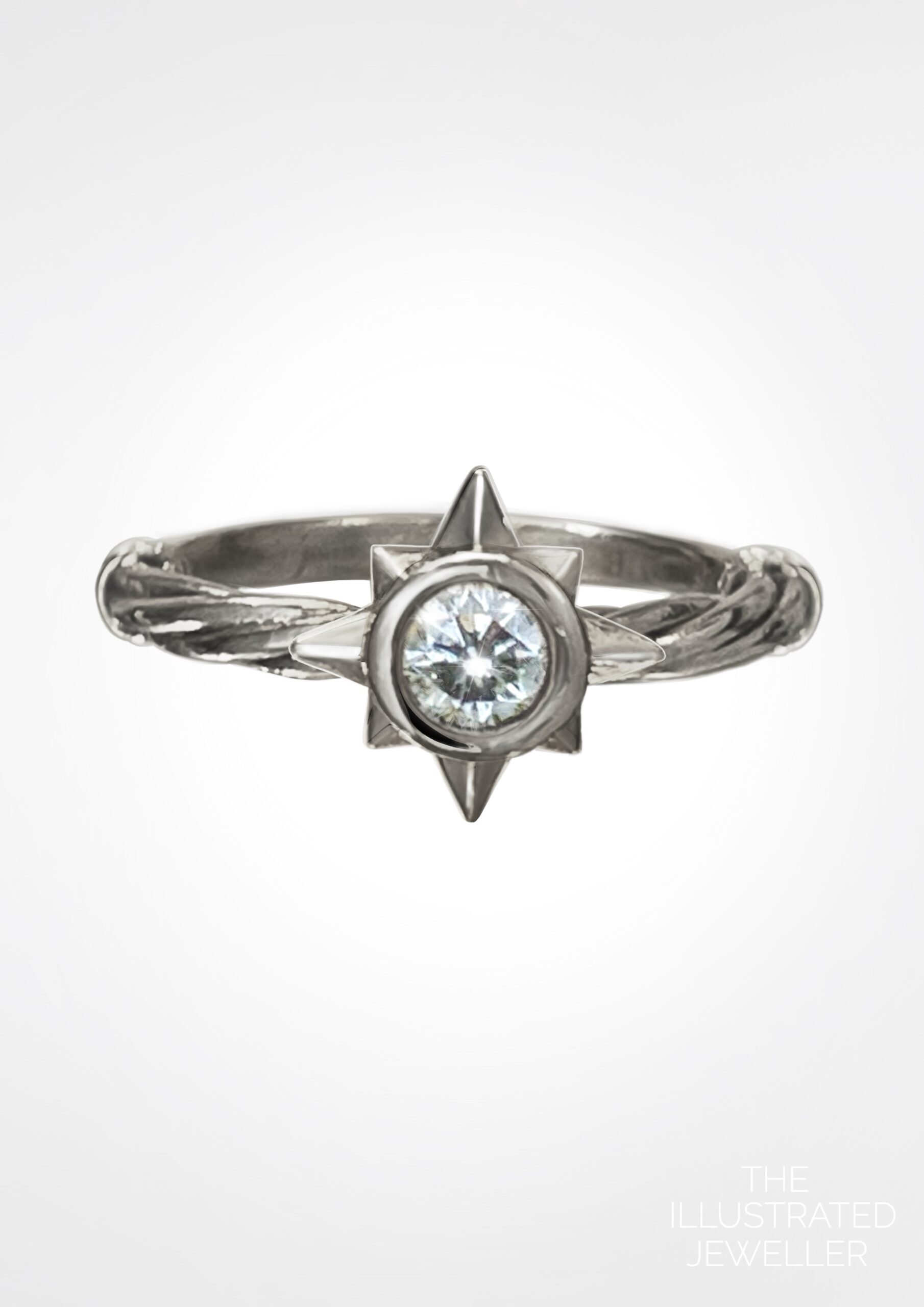 A solid handmade gold ring with ship rope embellishments and knife edge band. It encompasses a white topaz 5mm gemstone in a bezel setting.