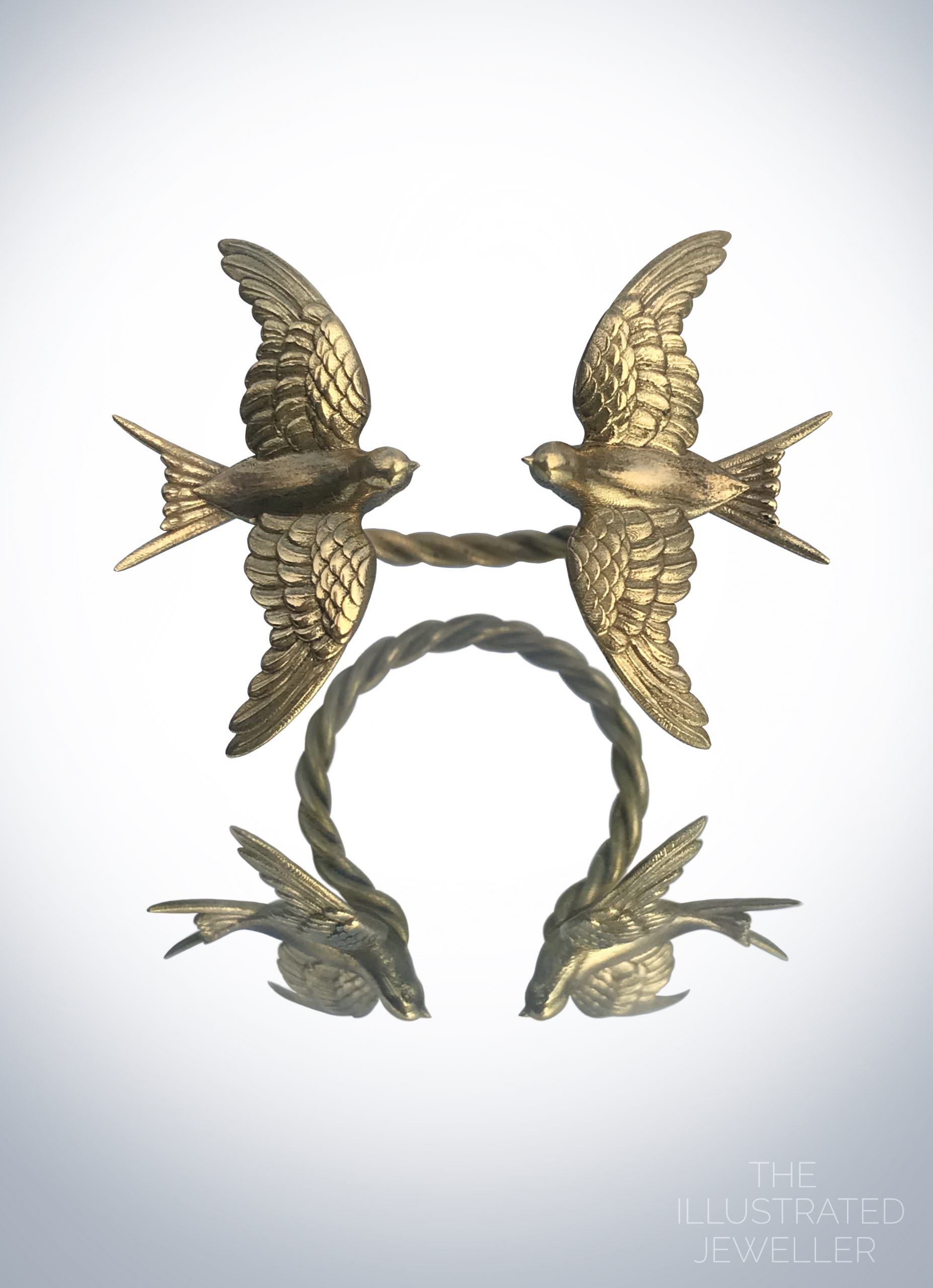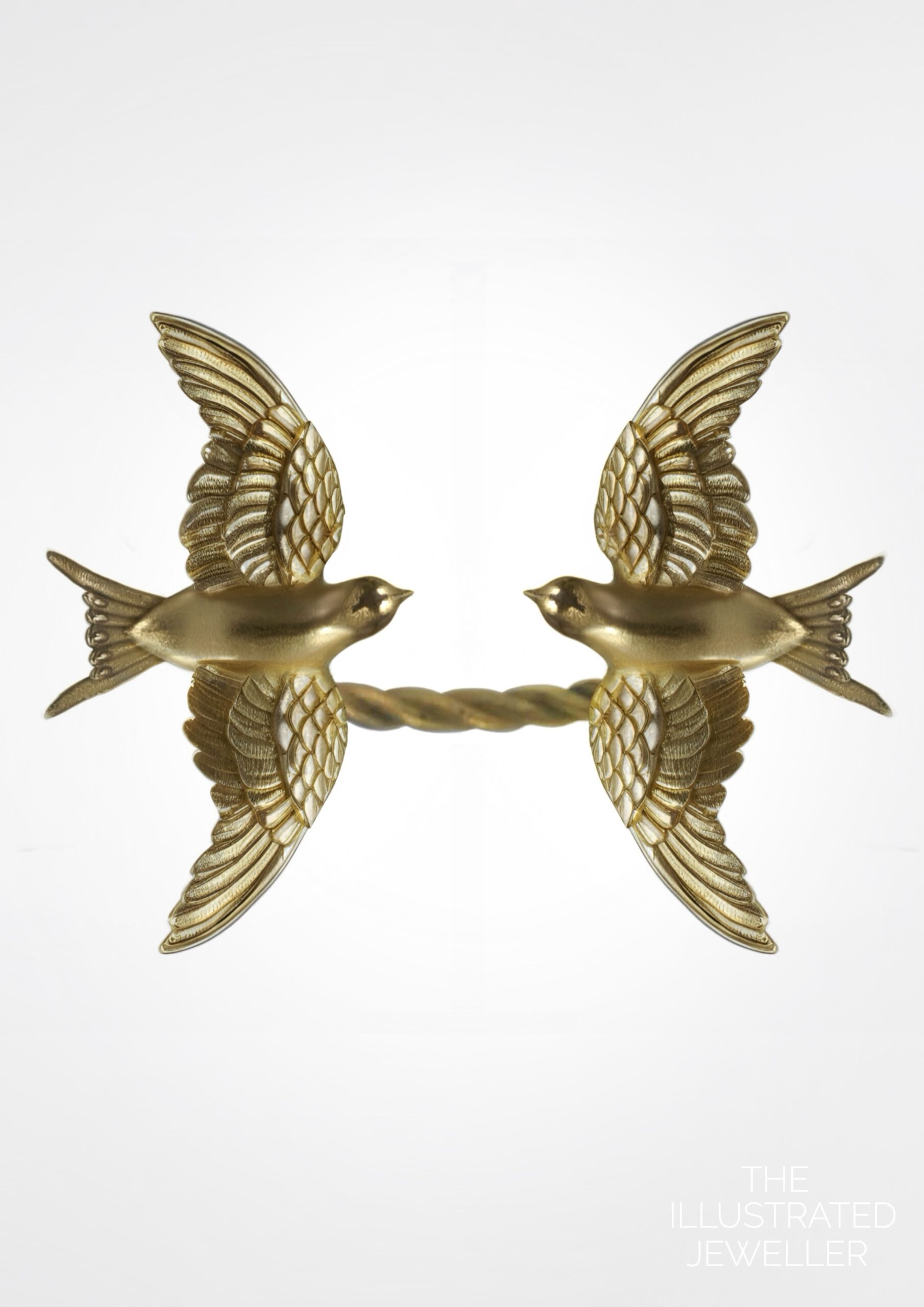 This piece is handmade in sold gold. Each feather and twisted piece of rope is cleaned up by hand, not machine. This beautiful open ring encompasses two facing swallows, with lots of attention to intricate detail.