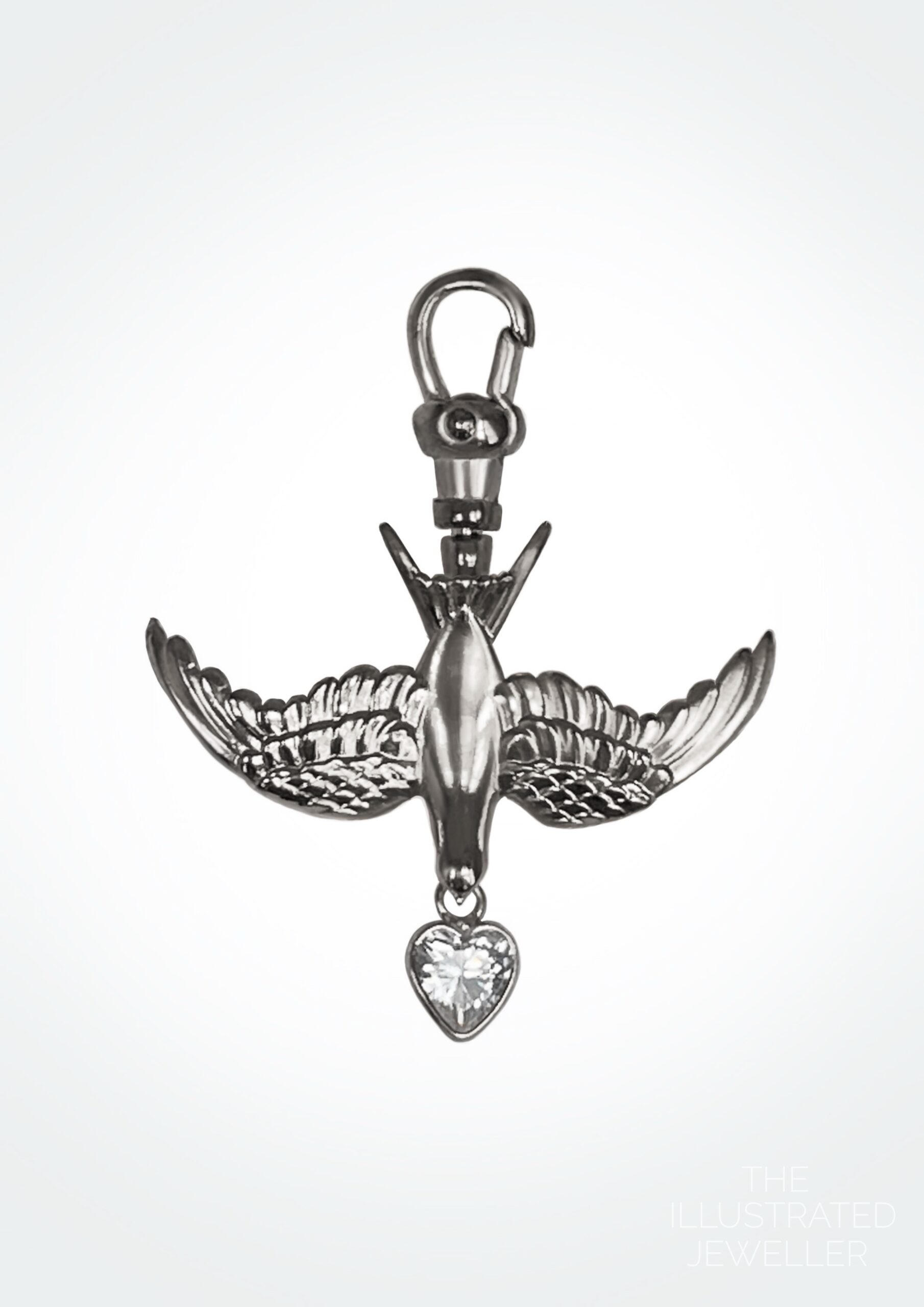 A golden swallow charm with a heart-cut CZ drop, available in 18ct vermeil or solid gold – a statement of love and strength in motion.