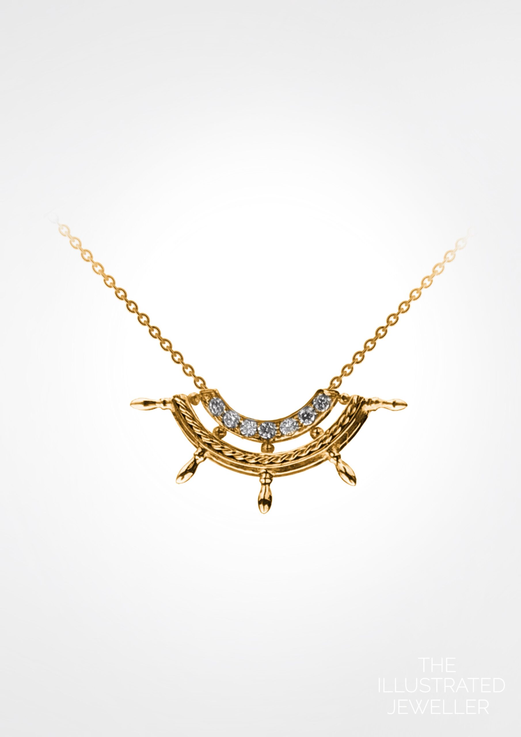 This unique necklace is made in Solid yellow gold, with a halo of white diamonds. It has intricate attention to detail and encompasses a twisted ship rope embellishment. This would look beautiful accompanied by the pear shaped diamond necklace or a “swoop swallow”pendant.