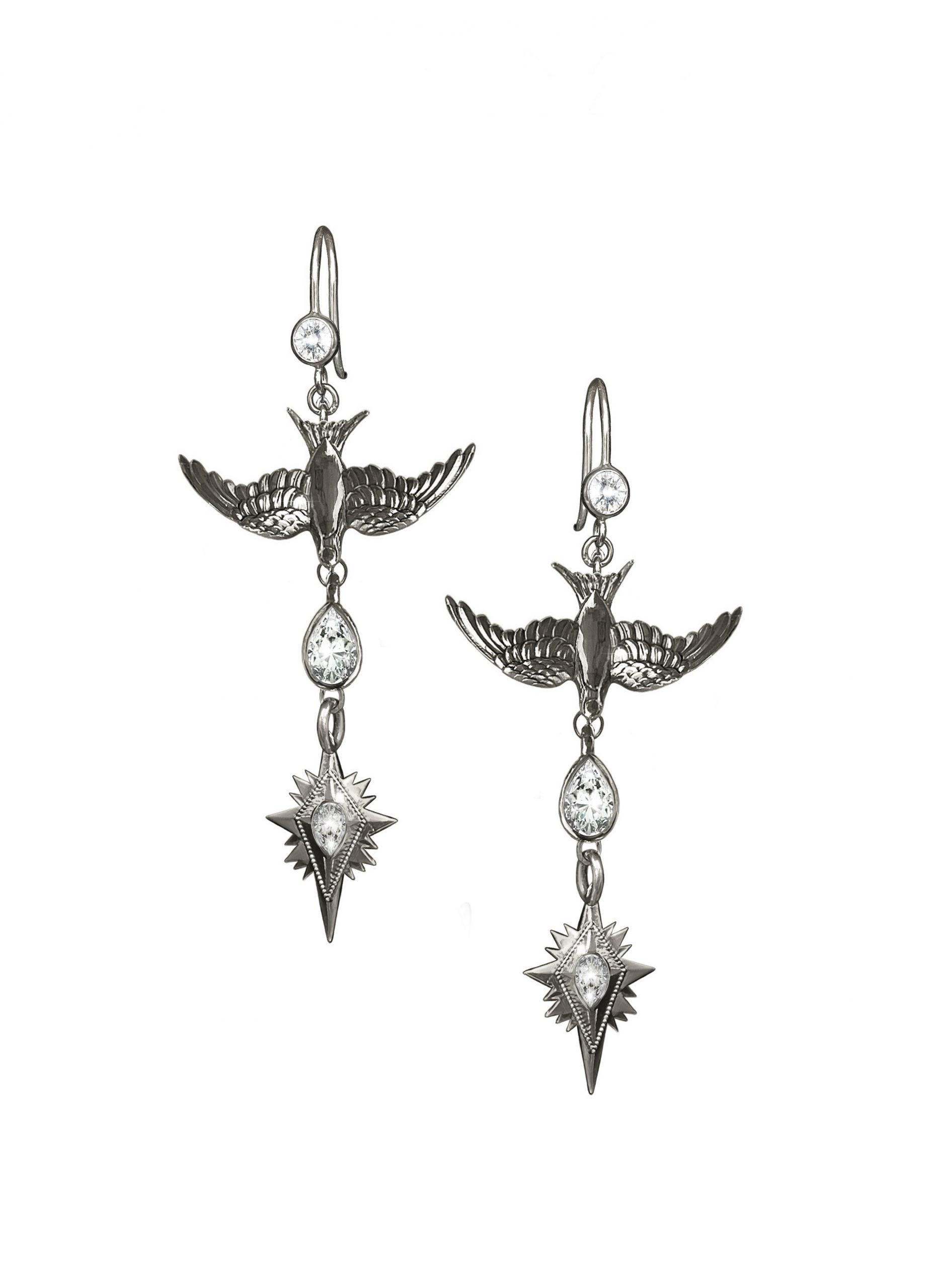 Introducing our Swallow & Northern Star Earrings, the perfect accessory for adding a touch of elegance to any outfit. These solid silver earrings feature stunning cubic zirconia stones in a bezel settings. Inspired by sailors and the nautical theme, these earrings sparkle and shine, making them the perfect choice for any cocktail party or special occasion. Elevate your look with these elegant and stylish earrings that are sure to turn heads wherever you go.