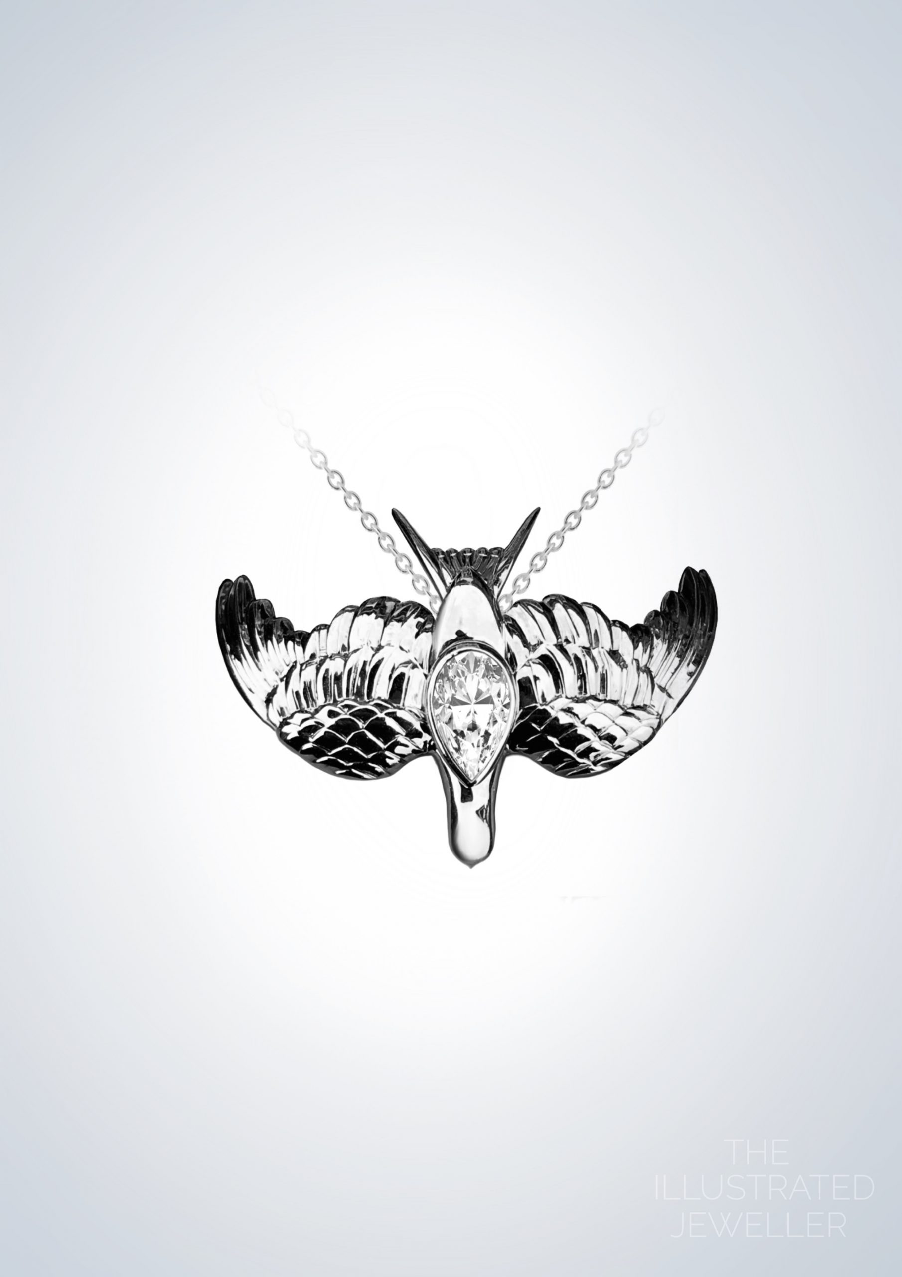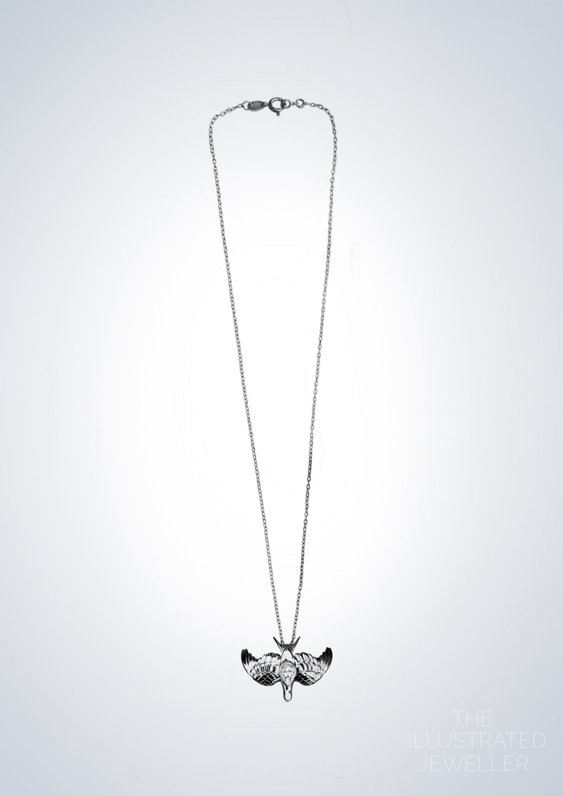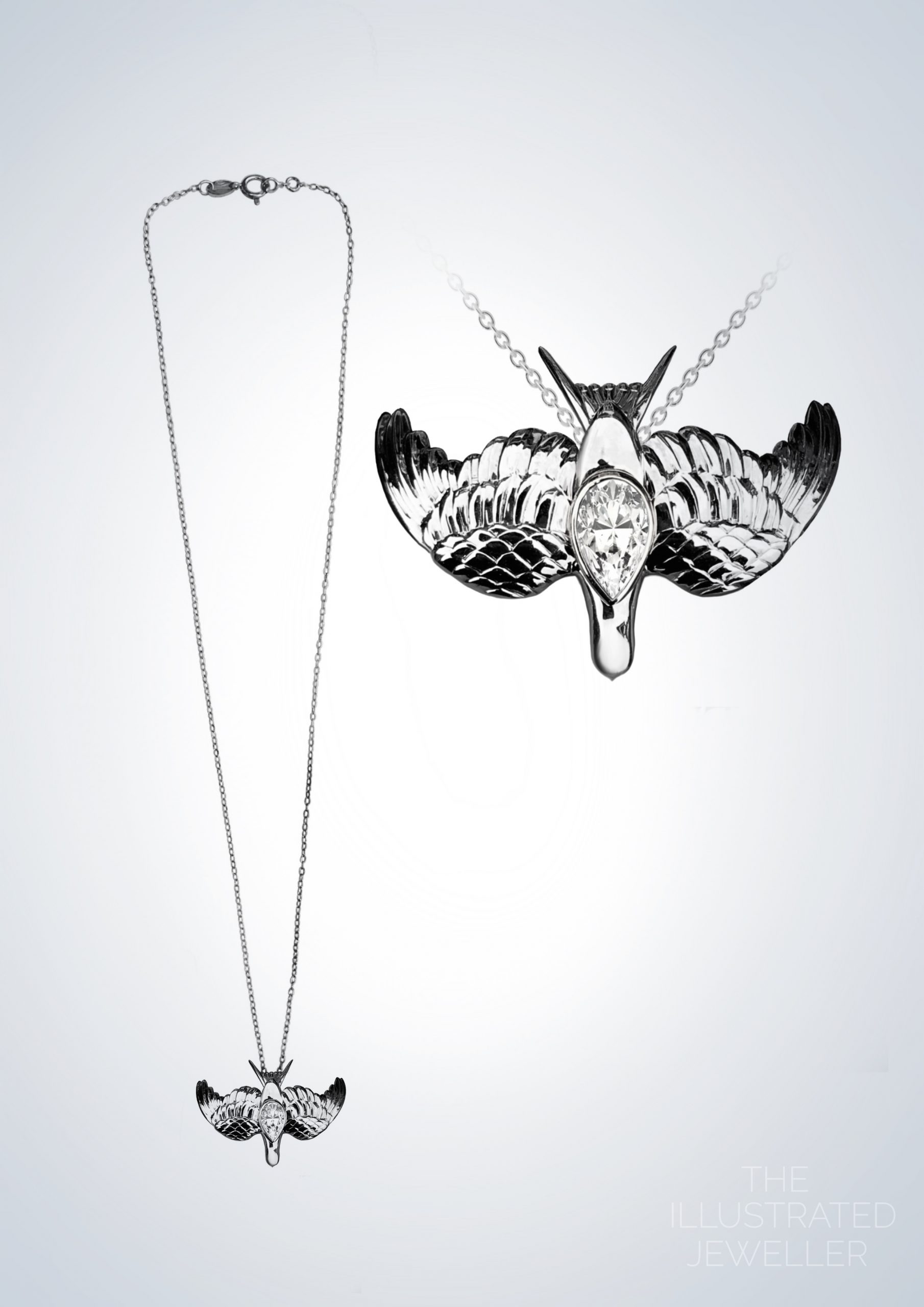 Silver swallow pendant with pear cubic zirconia, ultra thin trace chain
