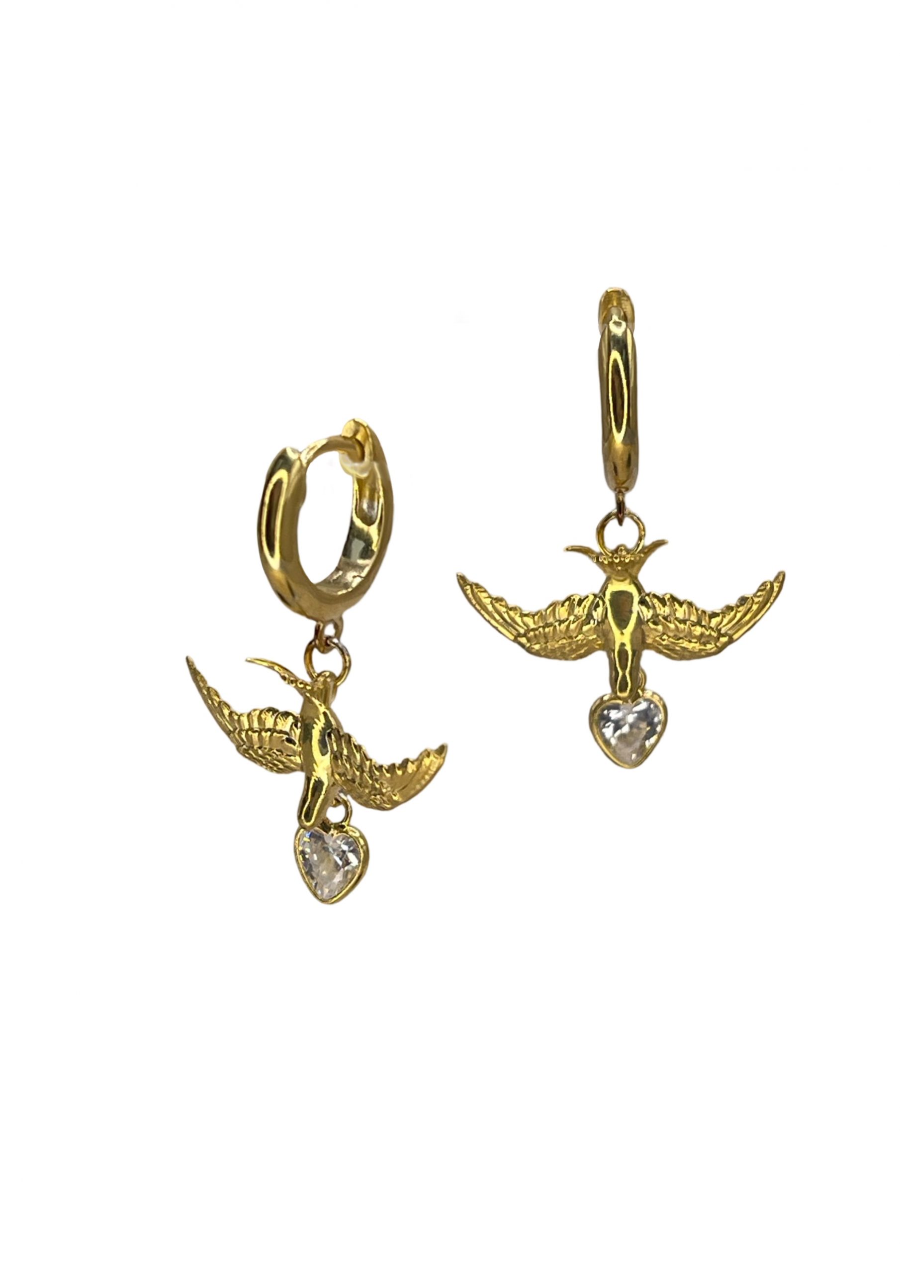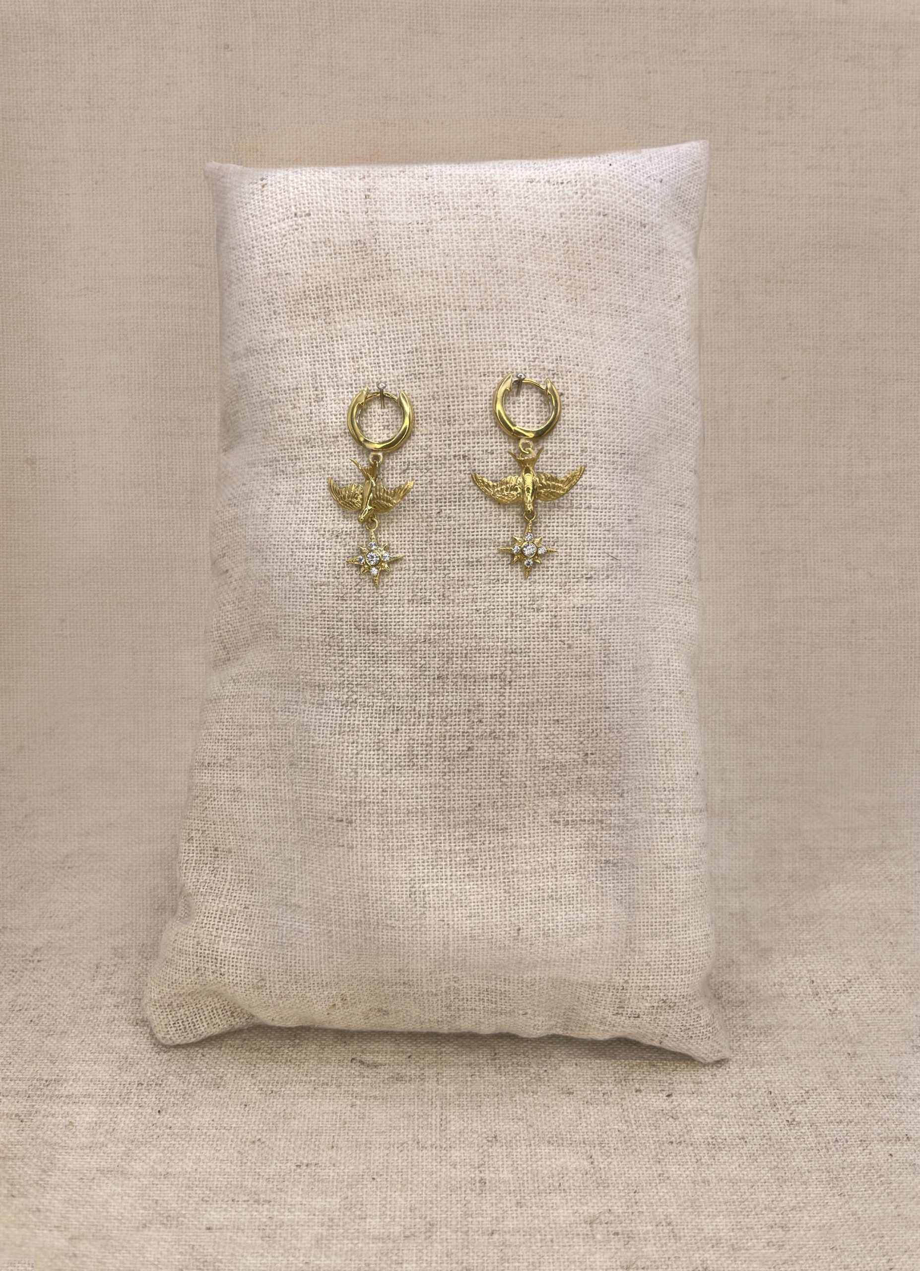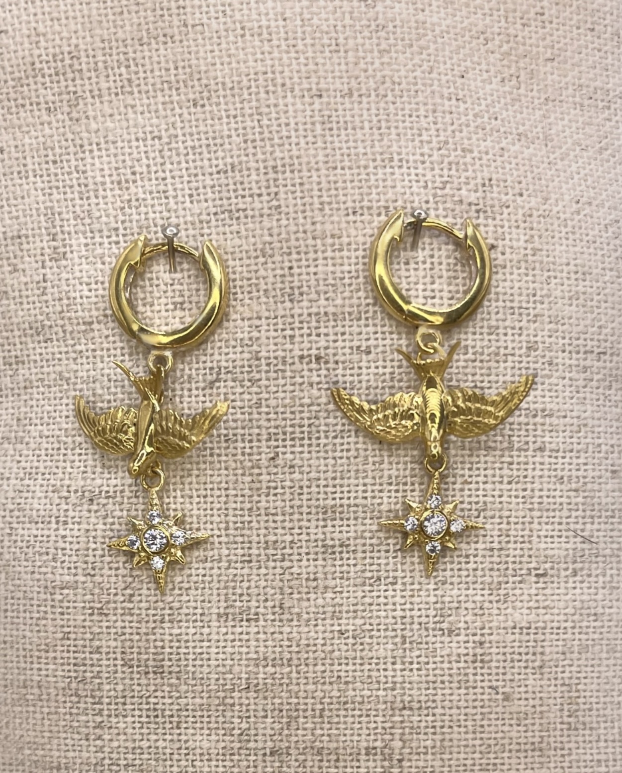 Small Gold swallow earrings, on clicker hoops with Northern Star Charm