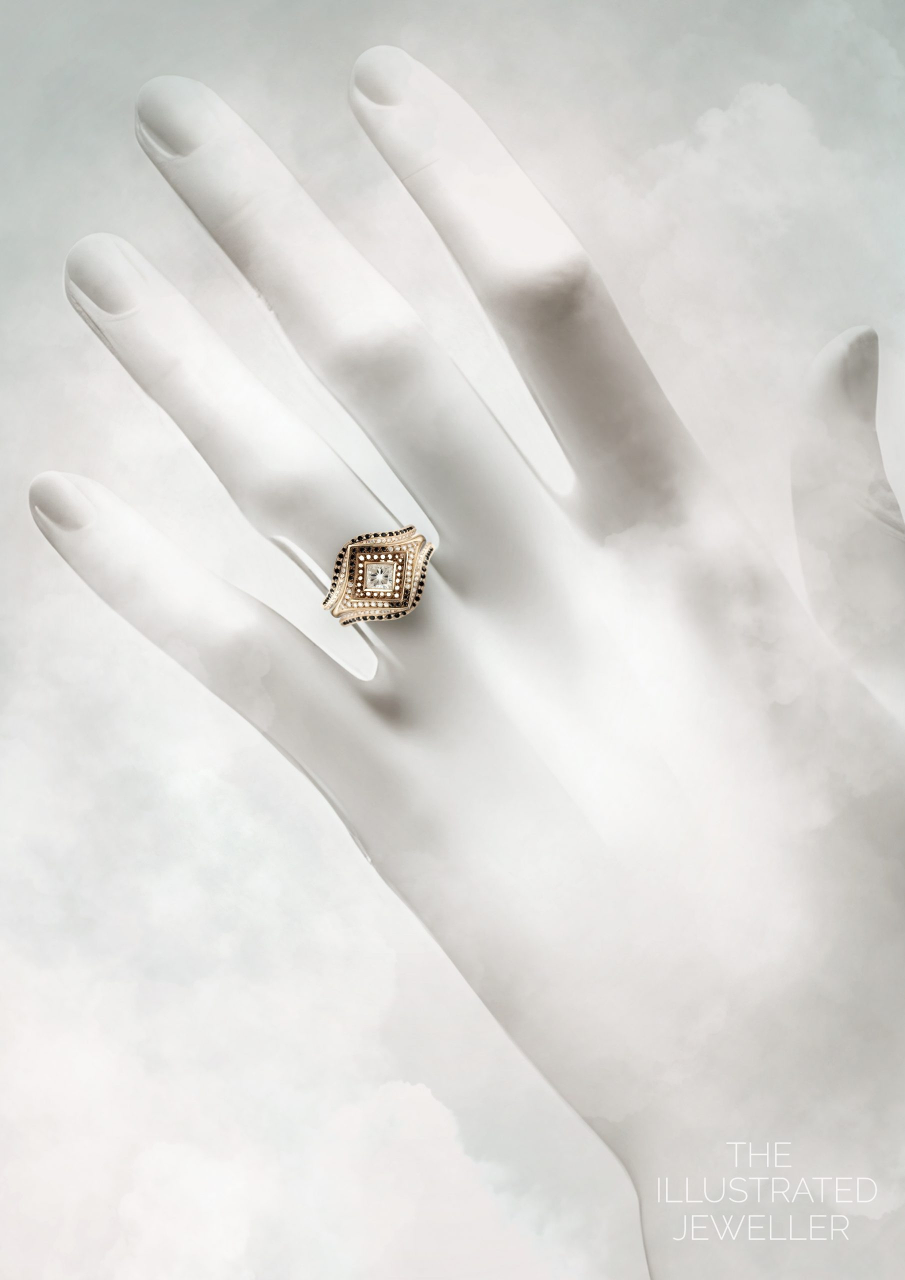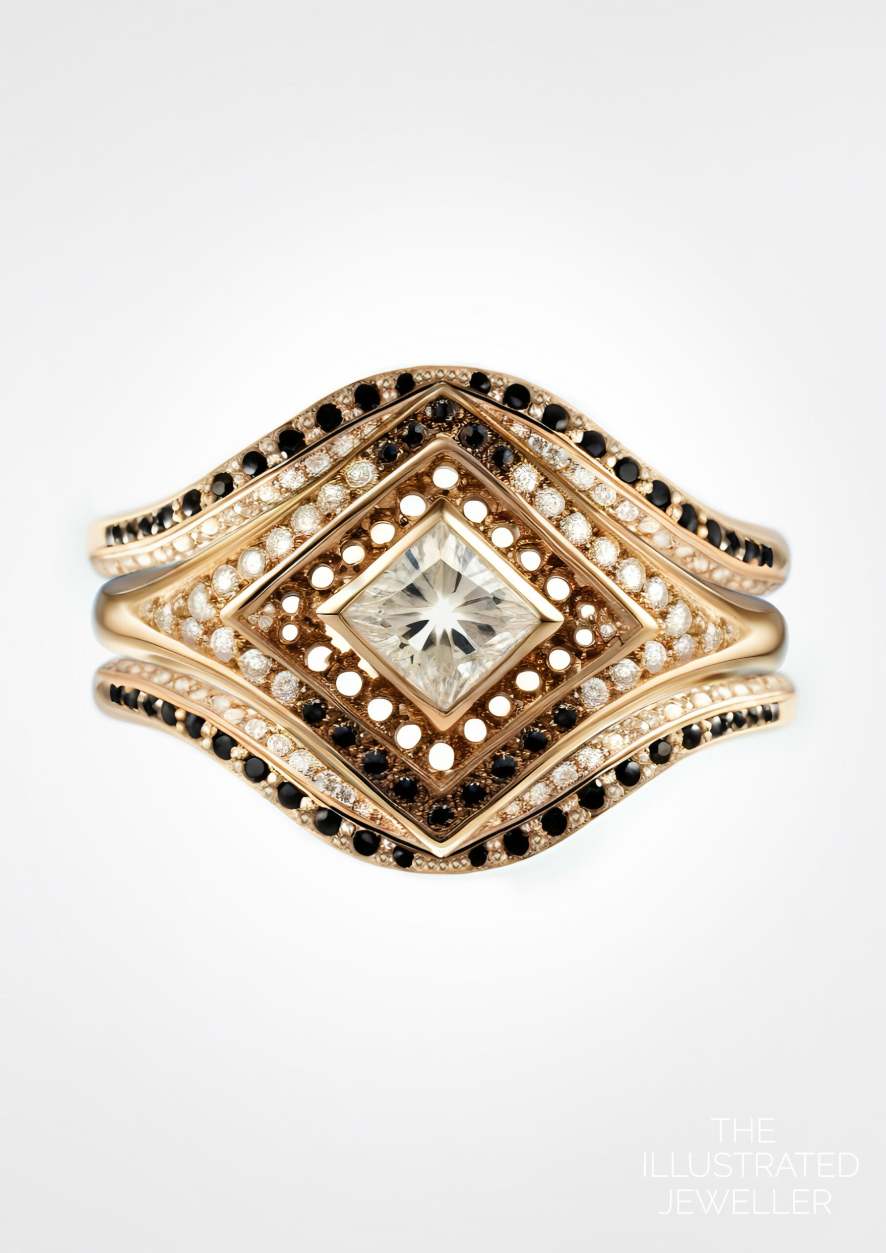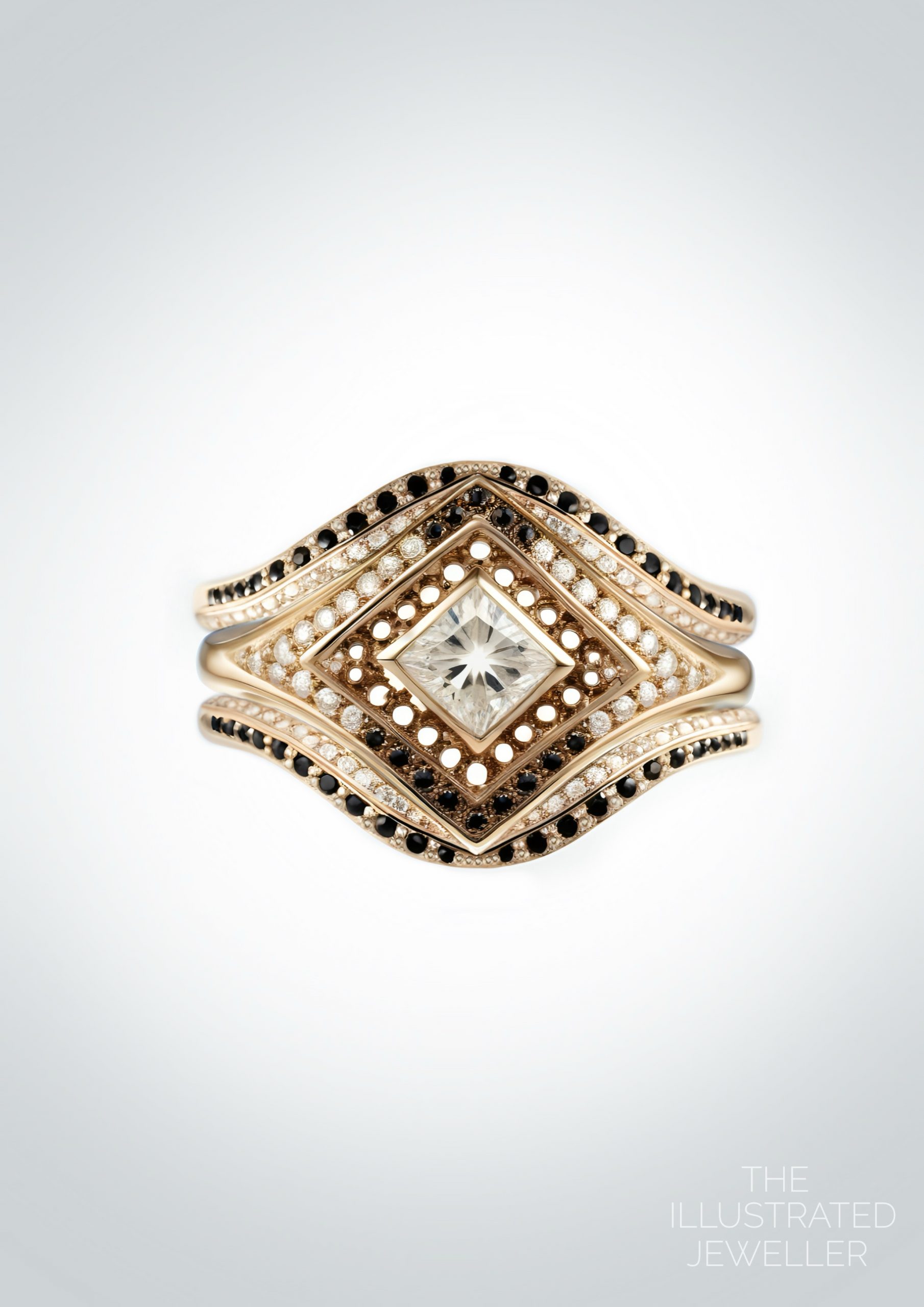 At its heart lies a radiant princess-cut diamond, set in a mesmerizing kite orientation to capture the brilliance of a distant star. A halo of black and white diamonds encircles the centerpiece, evoking the enchanting balance of light and shadow found in the universe.