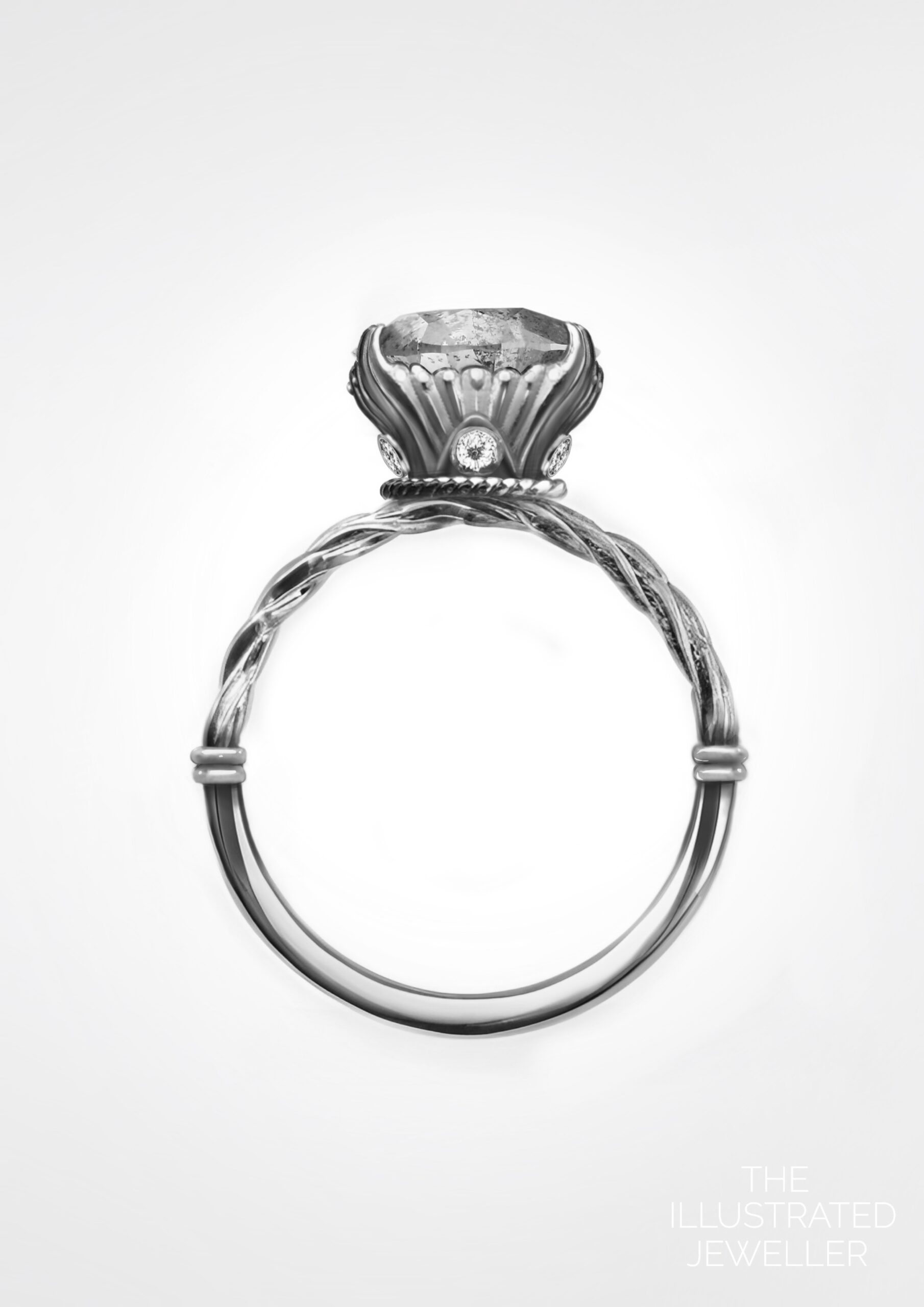 This piece has intricate attention to detail to the swallows rear tail feathers, collectively constructs a setting for a salt and pepper round diamond, secured by the tip of the tail feathers. Four in total on the circumference, allows white bezel set diamonds to be viewed from every angle.. it has a ship rope embellishment where it joins onto the shank. The theme continues in the main part of the ring and has two ship rope knots on the side of the shank. This gives a dividing contrast point to the base of the smooth ring.. (this is to allow space incase the ring needs to be resized.)
