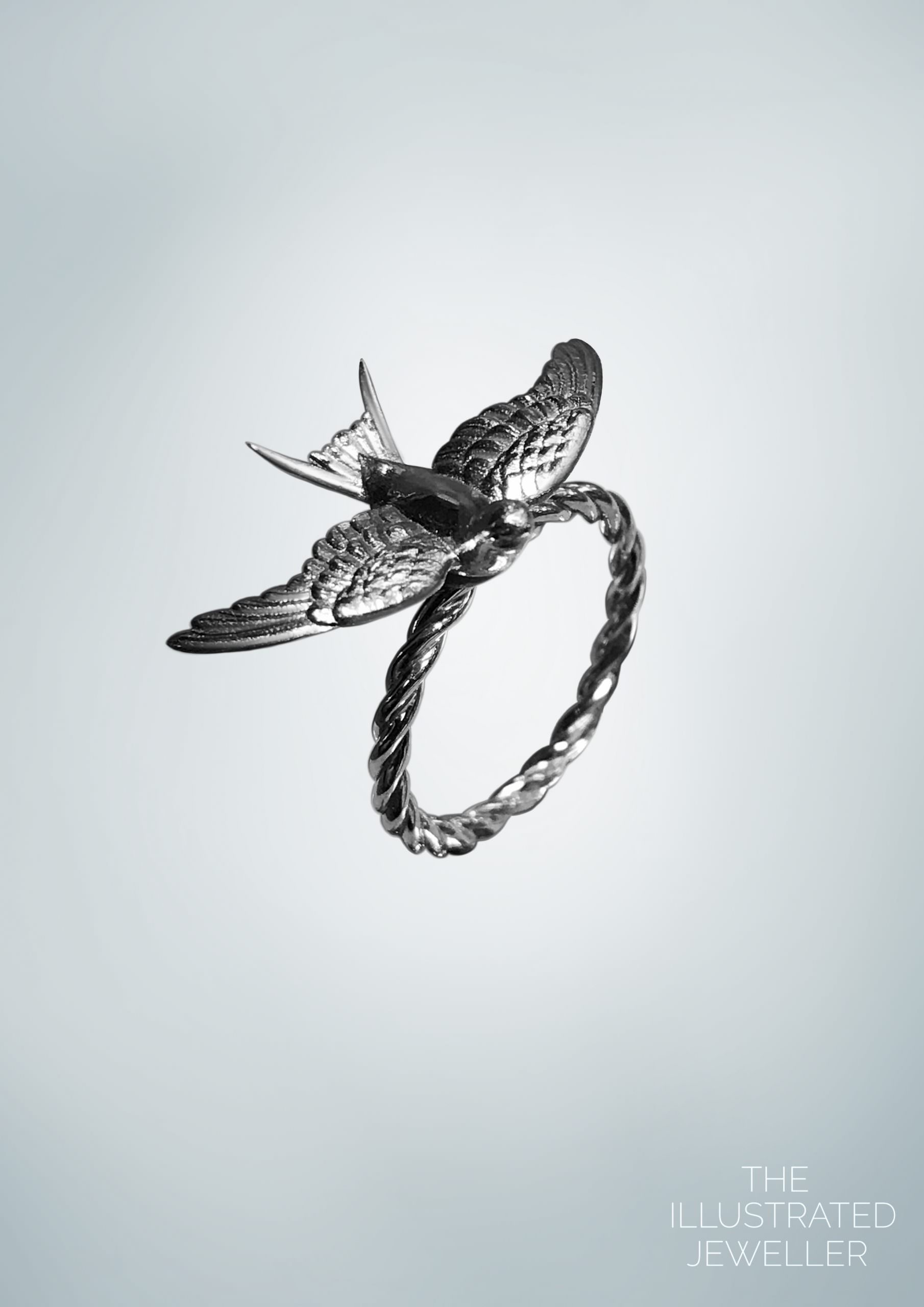 This beautiful ring encompasses a swallow just about to embark on its journey and taking flight, mounted on a twisted ship rope ring. Sailors used swallows as a symbol of “safe journeys” as they always return home to port.