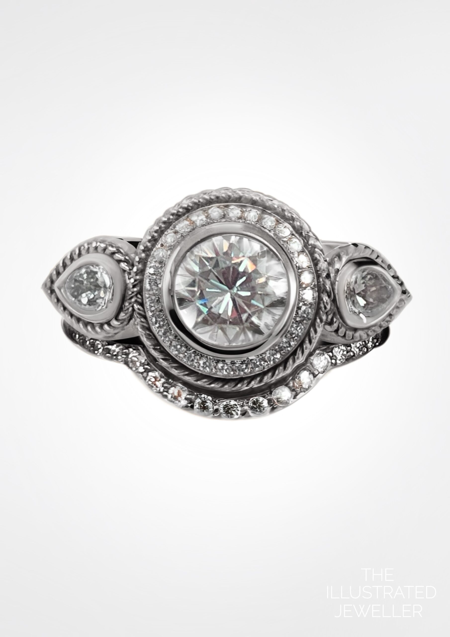 Set in solid gold, this piece has a large centre bezel set (6mm) and pave diamonds, emulating a “total eclipse halo” giving you all the celestial sparkle you’ll ever need! The cosmic feel of the ring is continued in the shoulder stones with matching pear shaped diamonds. This piece has beautiful attention to detail with a single row of elegant twisted ship rope embellishments making an infinity symbol. it is accompanied by an ultra fitting stack wedding band with 1.5mm pave set diamonds.  Constructed with an ethical and environmental choice of D-F VS laboratory grown diamonds. If you like the design concept of this design and want it tailor made to your taste, please select the Customised “make it your own” button.