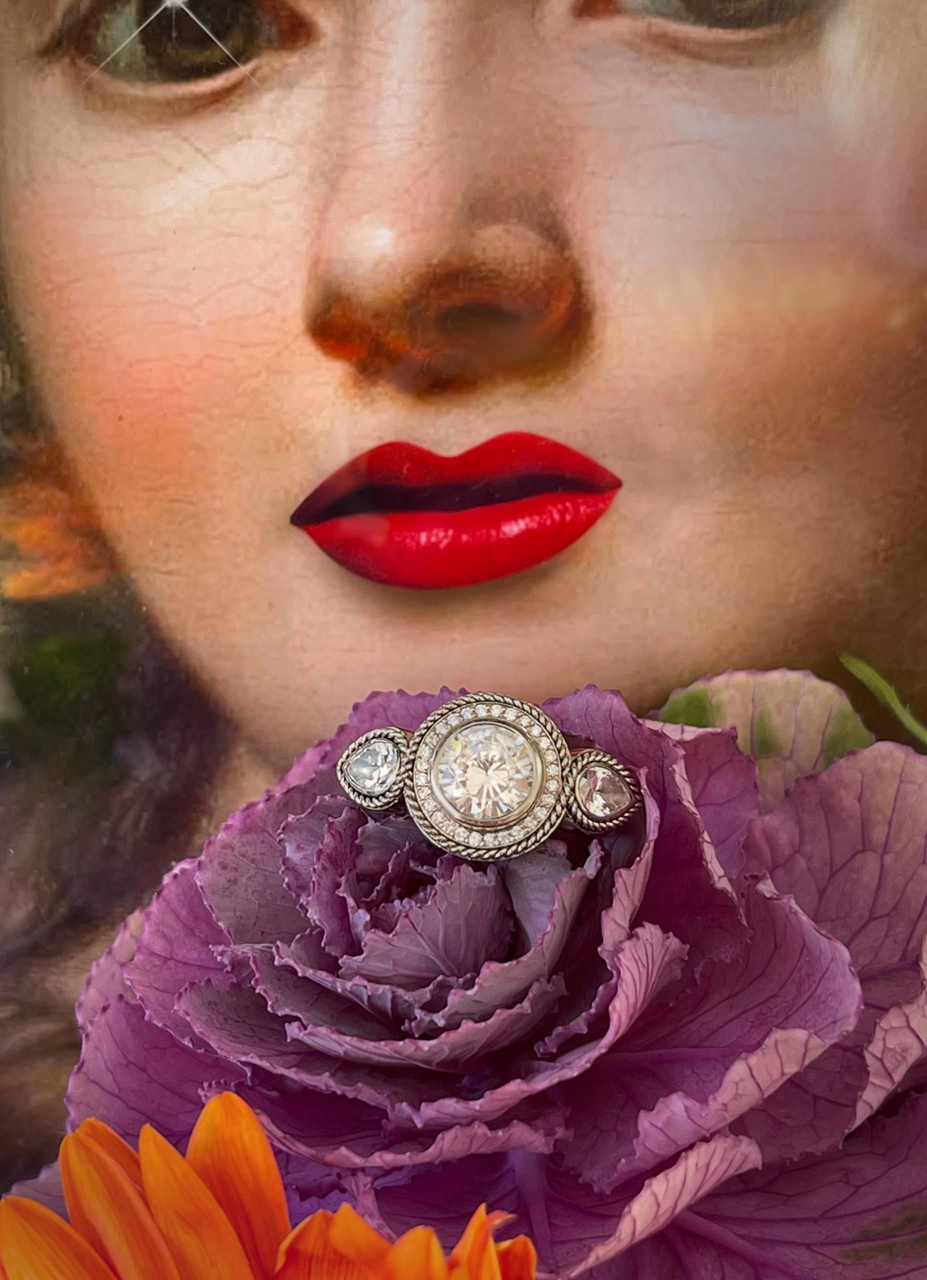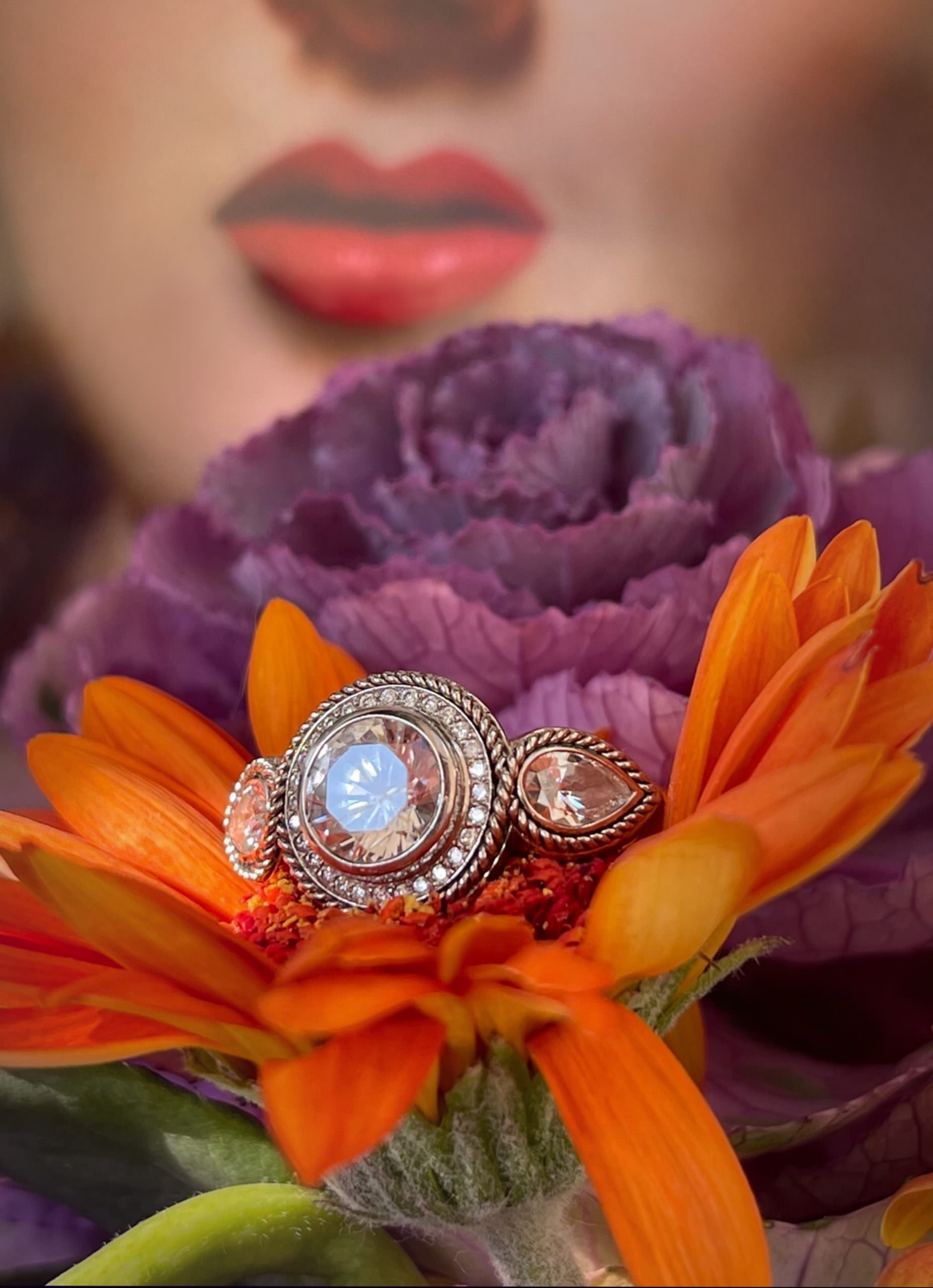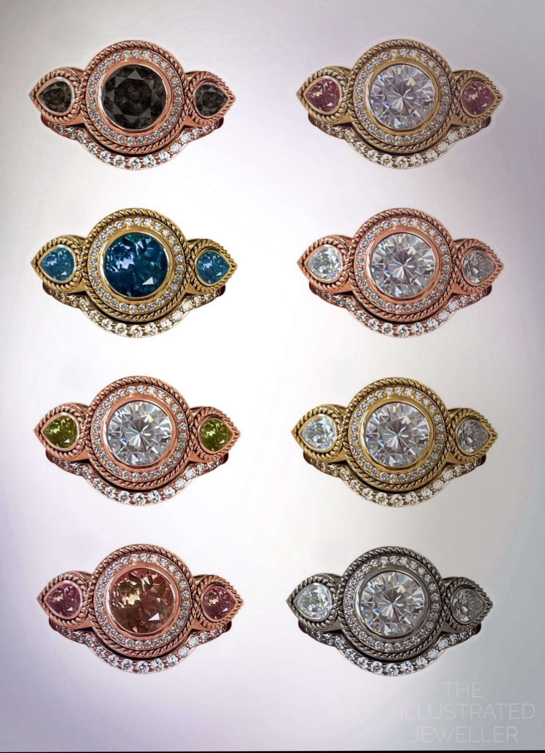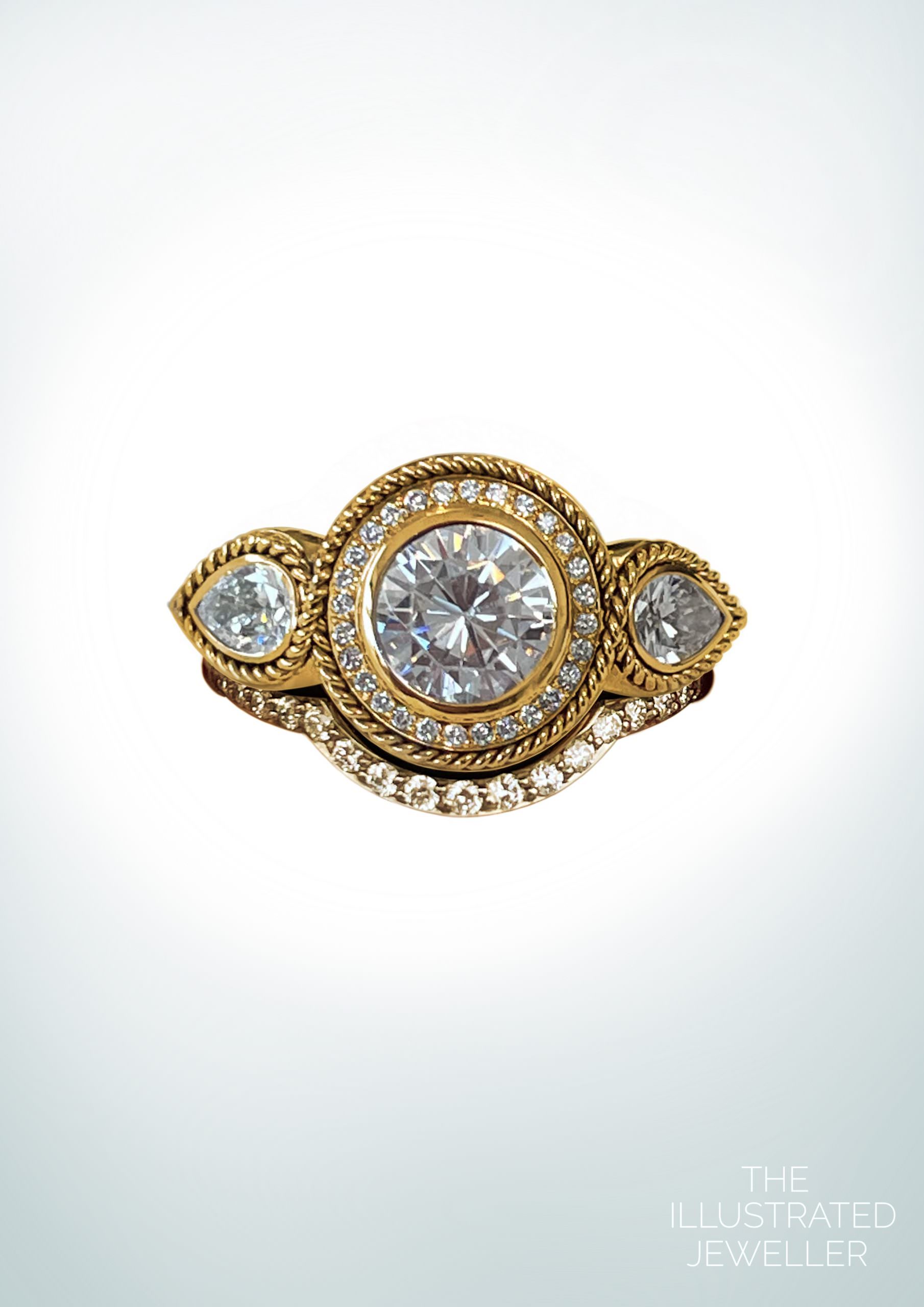 Set in solid gold, this piece has a large centre bezel set (6mm) and pave diamonds, emulating a “total eclipse halo” giving you all the celestial sparkle you’ll ever need! The cosmic feel of the ring is continued in the shoulder stones with matching pear shaped diamonds. This piece has beautiful attention to detail with a single row of elegant twisted ship rope embellishments making an infinity symbol. it is accompanied by an ultra fitting stack wedding band with 1.5mm pave set diamonds. Constructed with an ethical and environmental choice of D-F VS laboratory grown diamonds. If you like the design concept of this design and want it tailor made to your taste, please select the Customised “make it your own” button.
