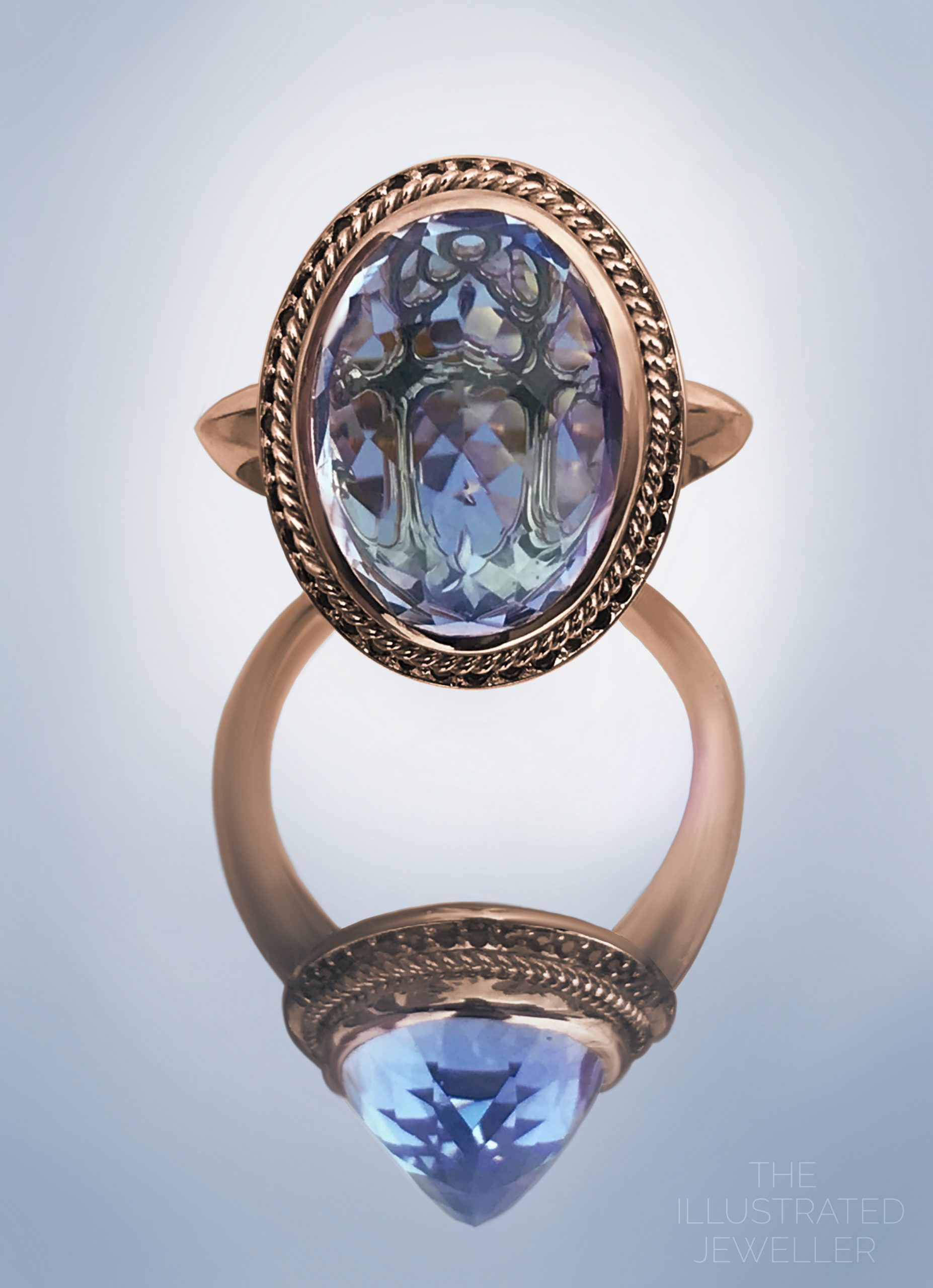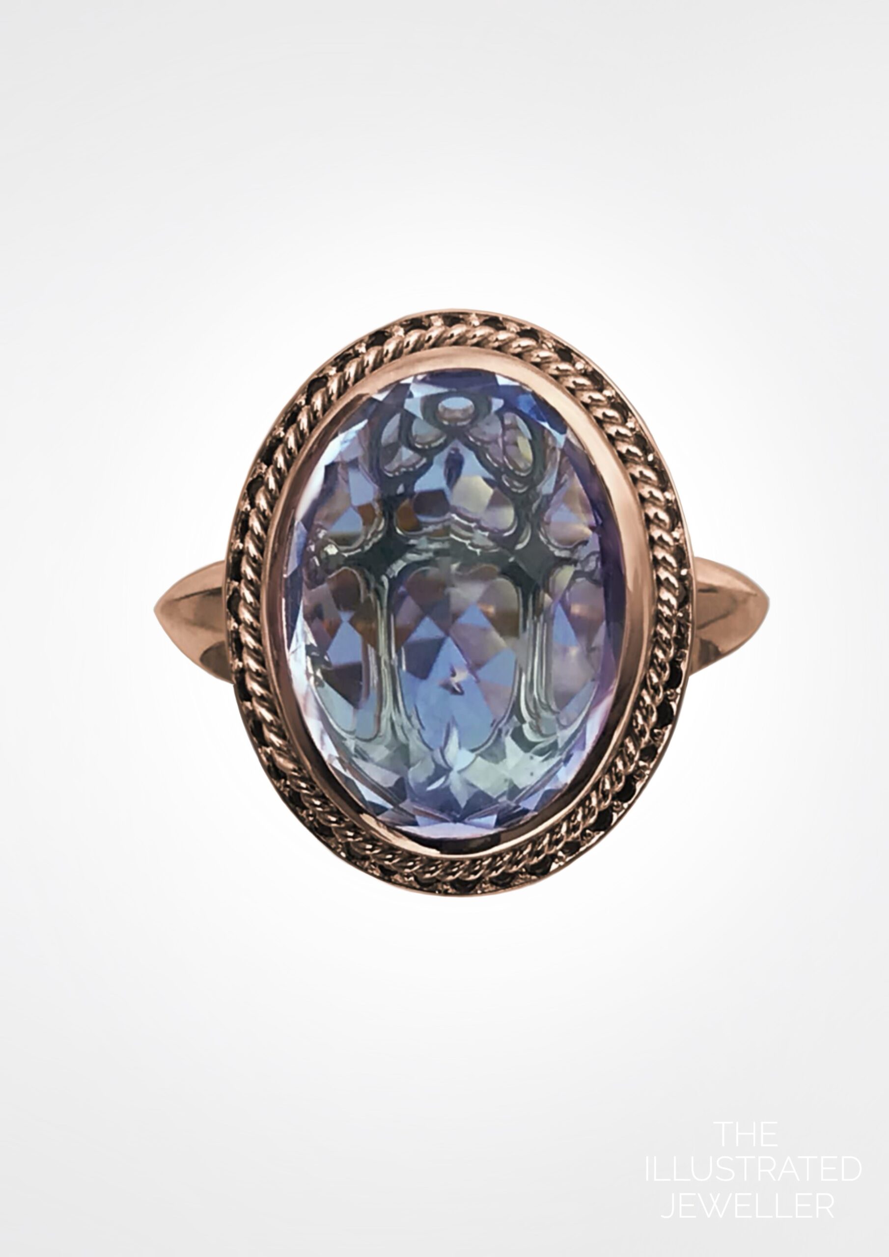 The subtle warmth of Rose gold, delivers a harmony of cool stone colours with warm tones of the metal. The centre stone is an inverted oval amethyst, which reveals a hidden anchor when caught by the light. Under the twisted rope details lies a pavé set of deep blue sapphires.