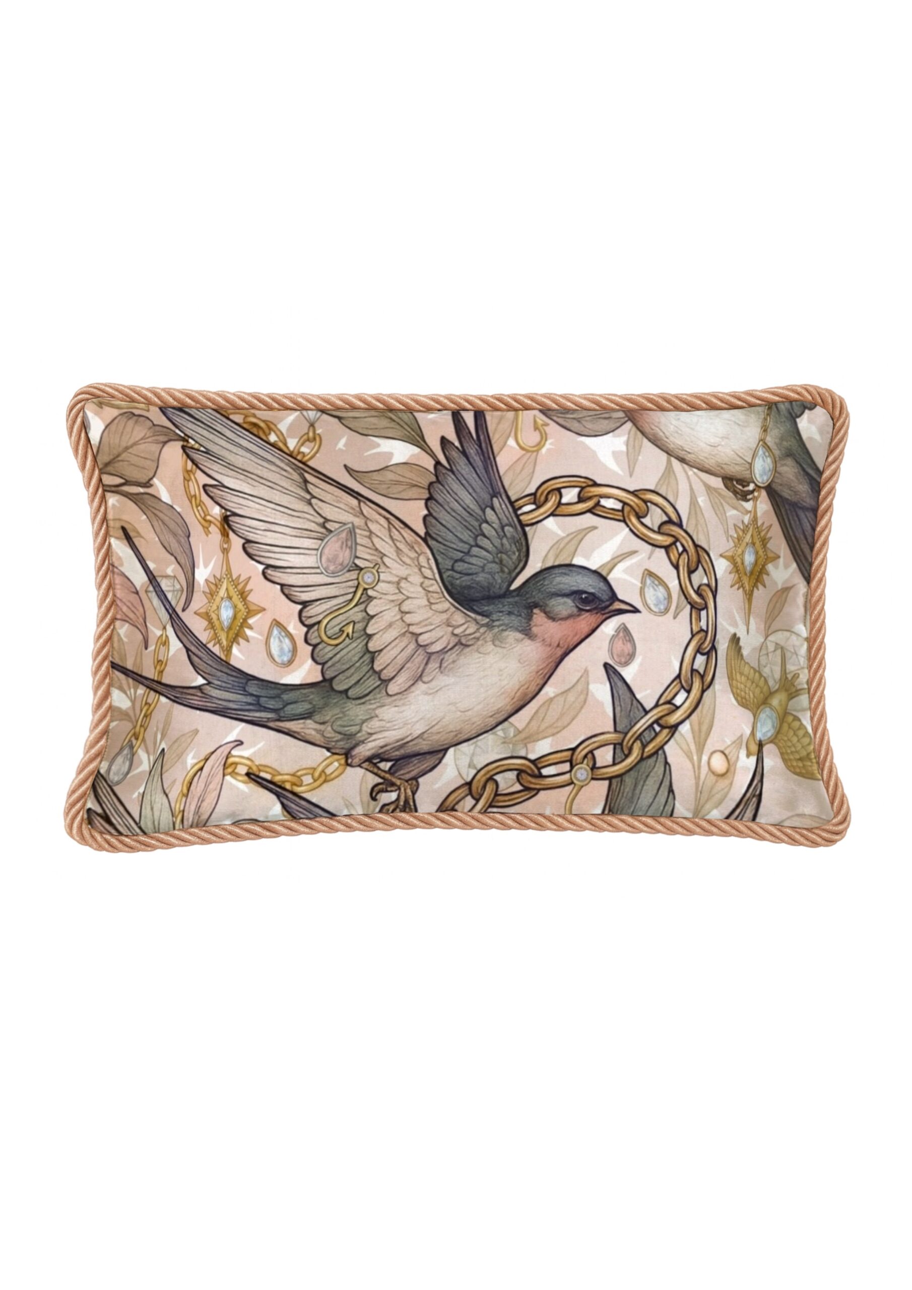 Rectangular silk cushion with illustrated swallow, gold chains and botanicals. Twisted pink cord trim. Cushion inlay sold separately.